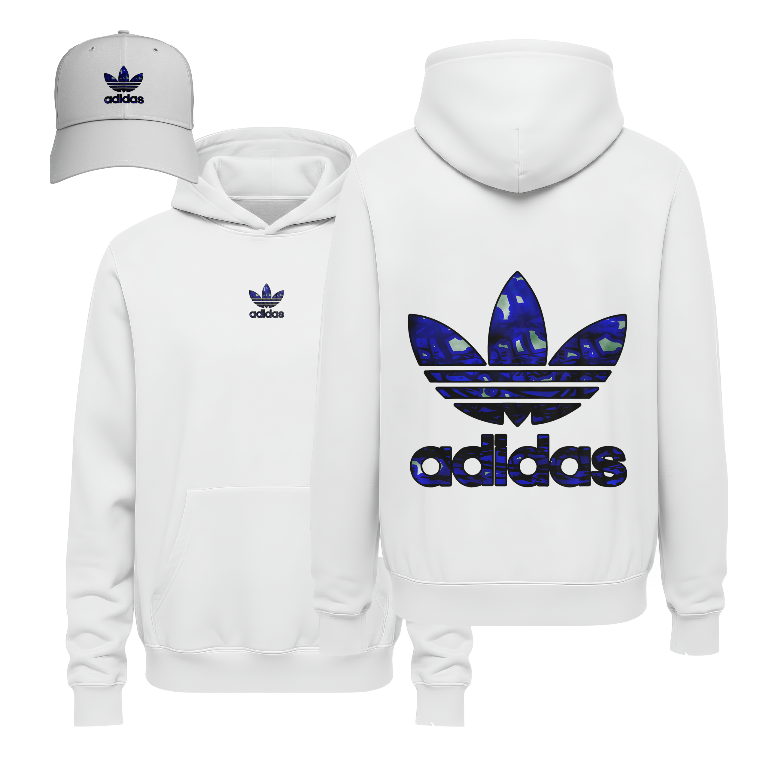 Coordinated Headwear: Each bundle includes a matching white structured cap featuring the Blue Picasso Trefoil icon, ensuring a clean and unified look from head to toe.