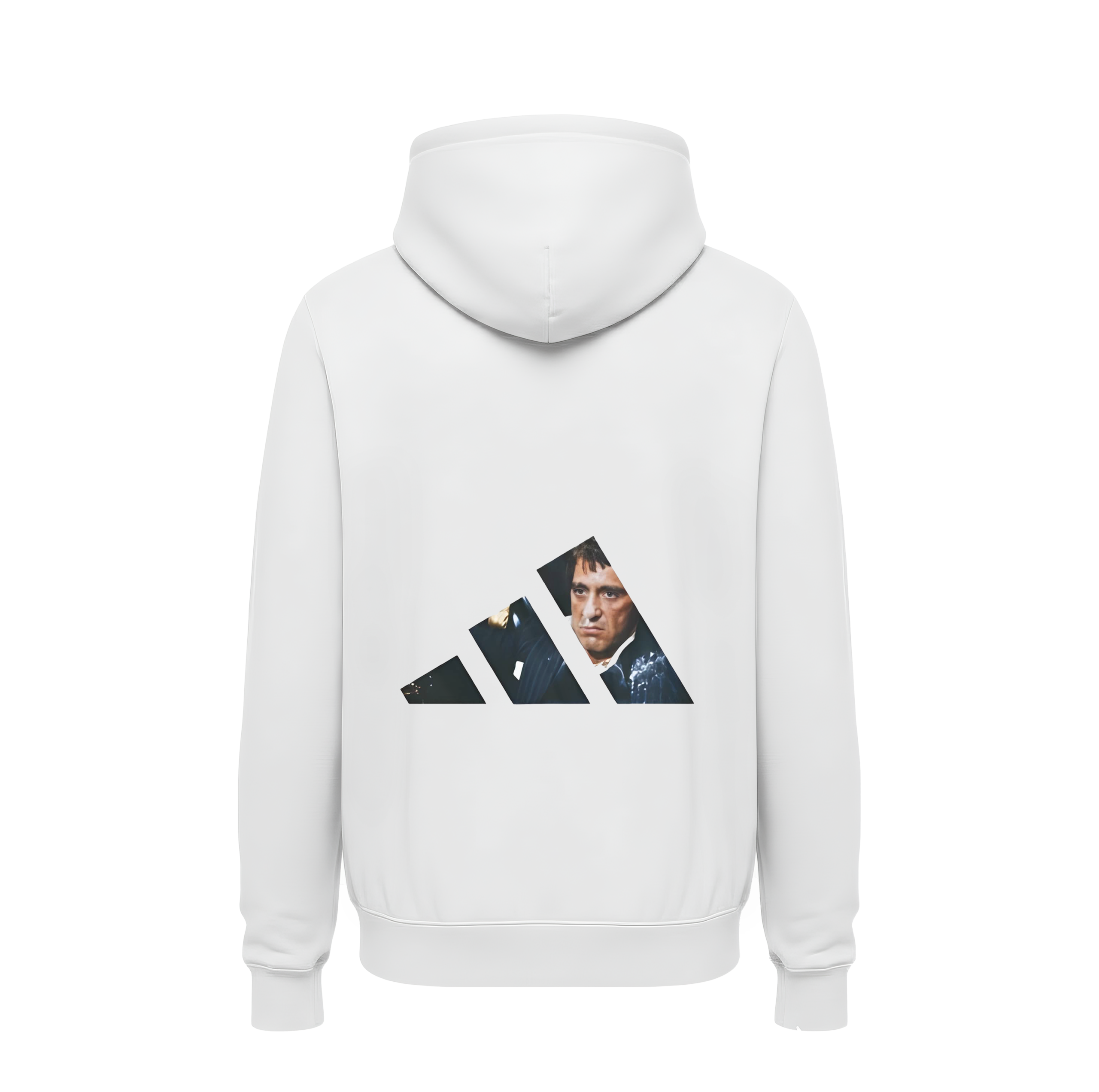 • Cinematic Legacy Artistry: The back features the modern Adidas “Three Stripes” mountain logo, serving as a frame for a high-definition, iconic portrait of Tony Montana from Scarface.
