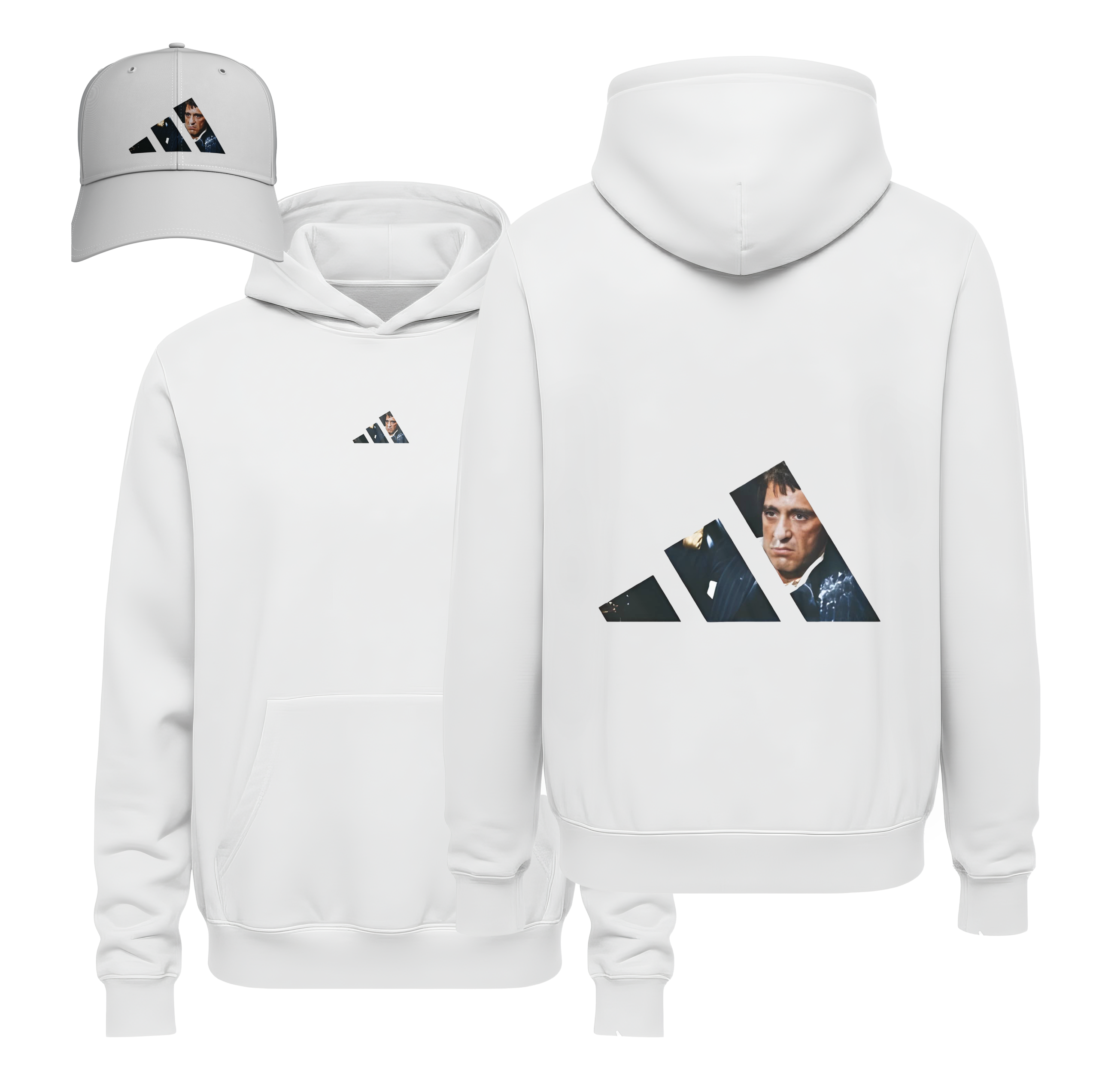 • Coordinated Headwear: Each set includes a matching white structured cap featuring the same Tony Montana graphic integrated into the stripes.