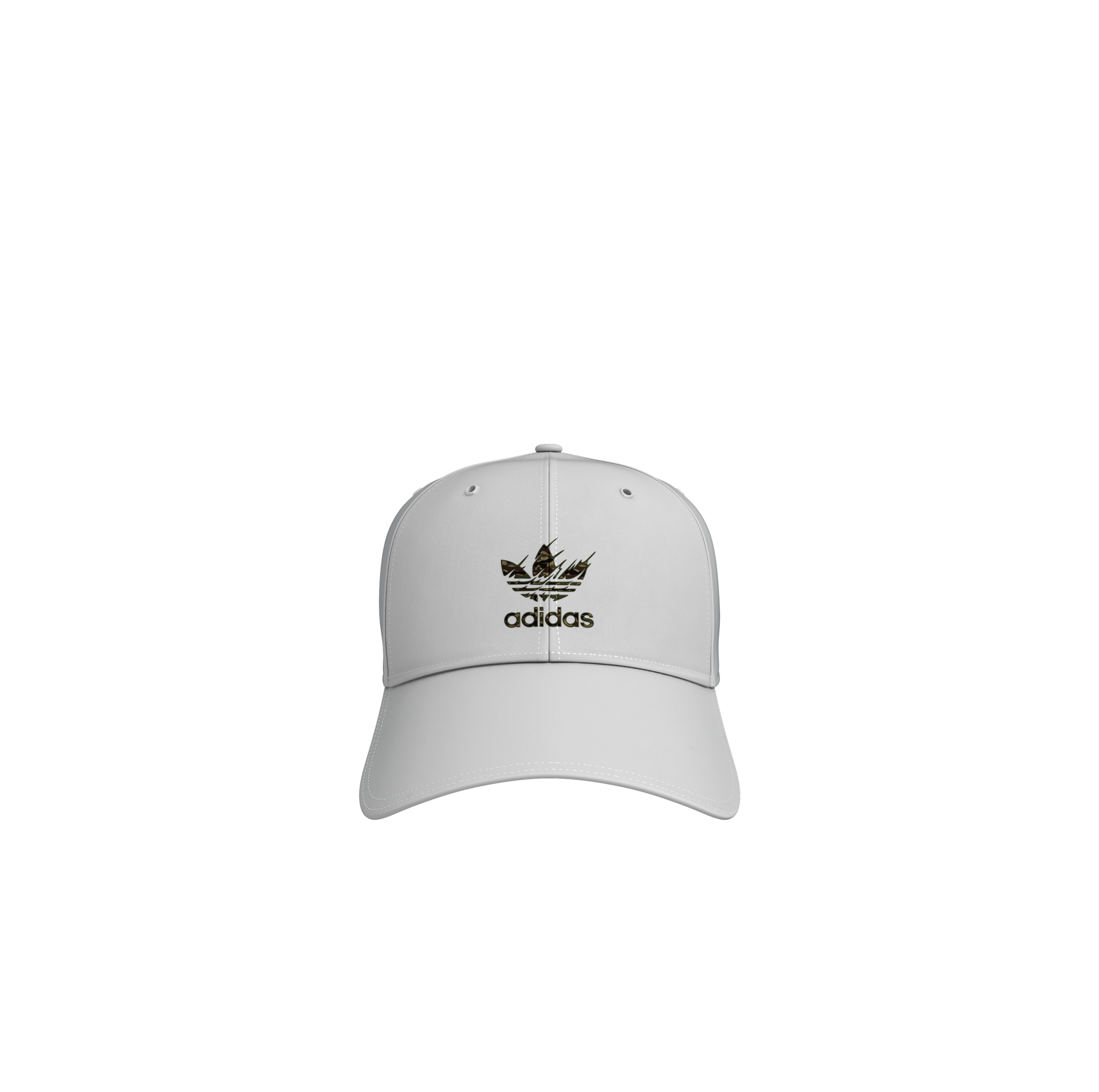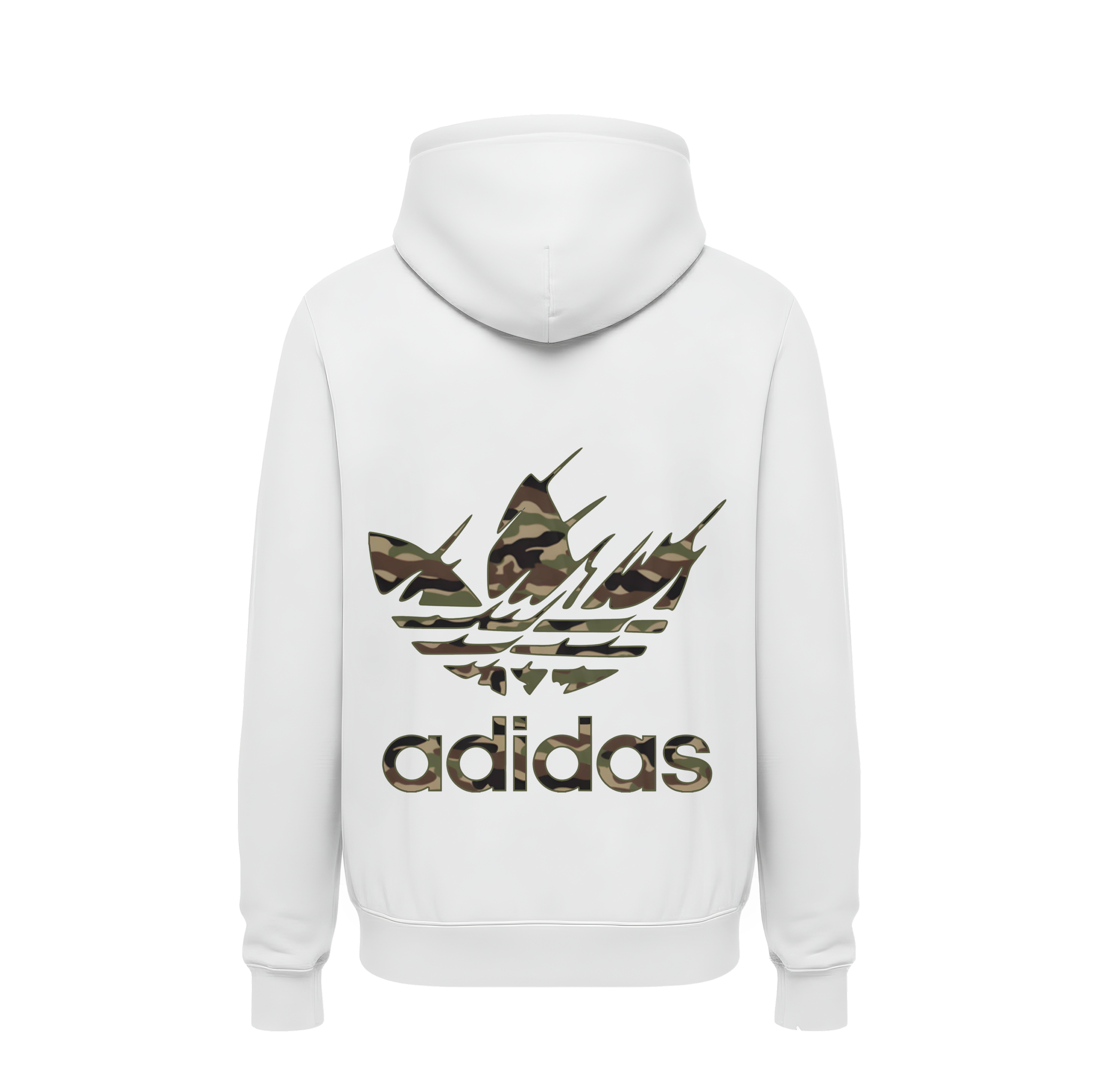 Tactical Trefoil Artistry: The back features a large-scale Adidas Trefoil logo filled with a classic woodland camouflage pattern, blending earthy tones of forest green, tan, and dark brown.