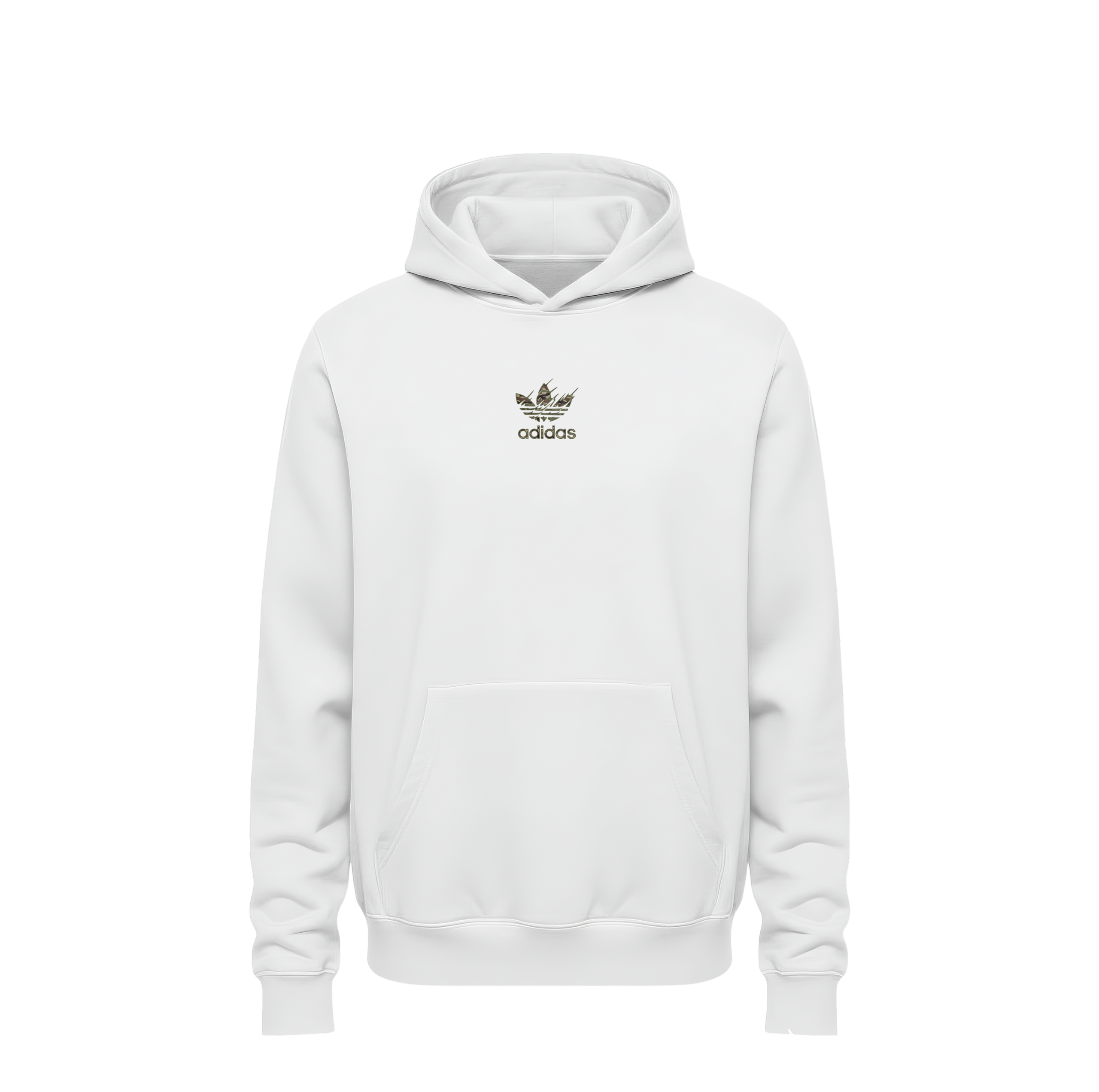 Monochrome White Canvas: Crafted from a luxury white heavyweight cotton blend, the hoodie provides a clean, high-contrast base that makes the olive and khaki tones of the logo stand out.