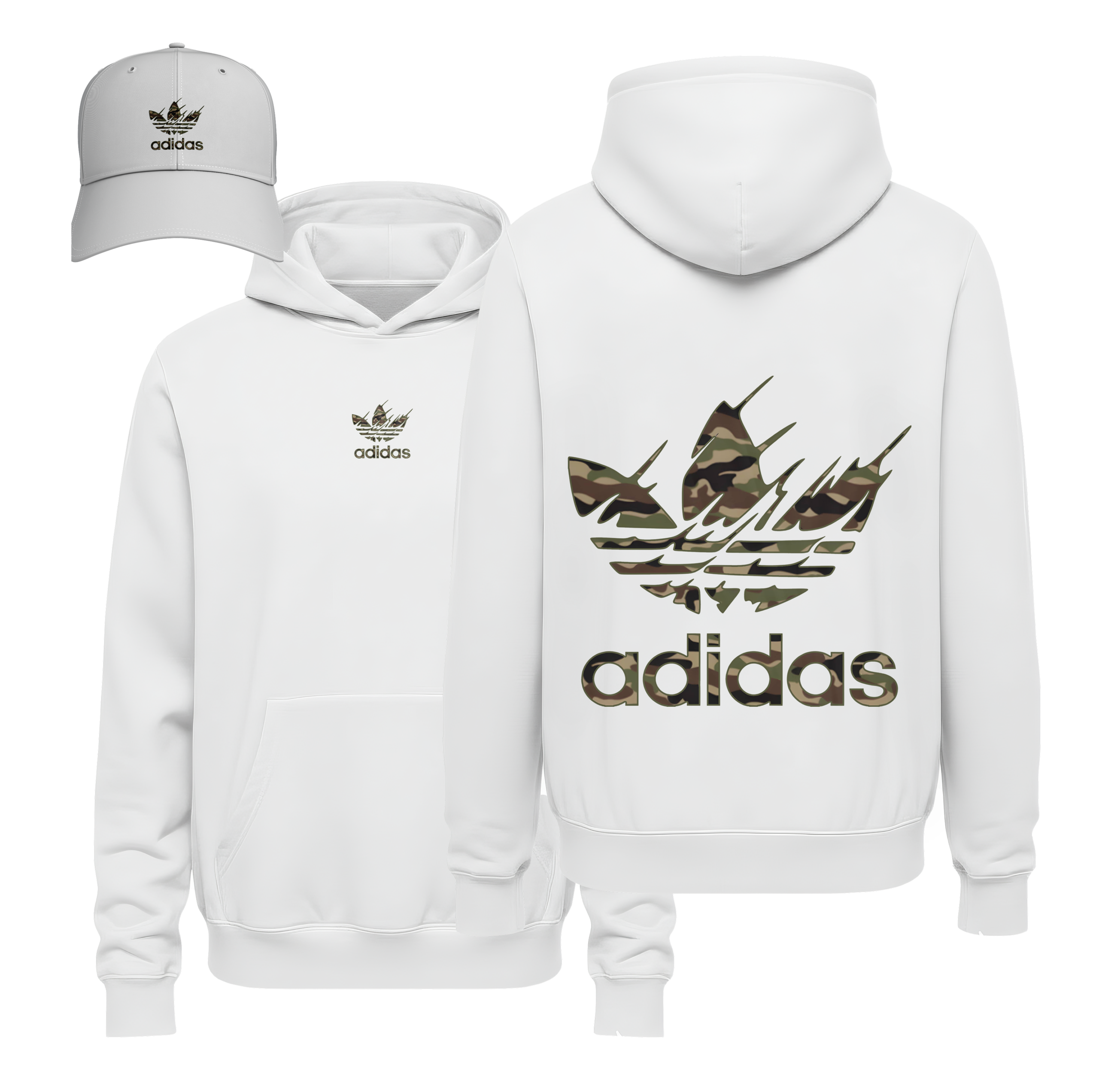 Coordinated Tactical Gear: This bundle includes the premium white hoodie and a matching structured cap featuring the camouflage icon.