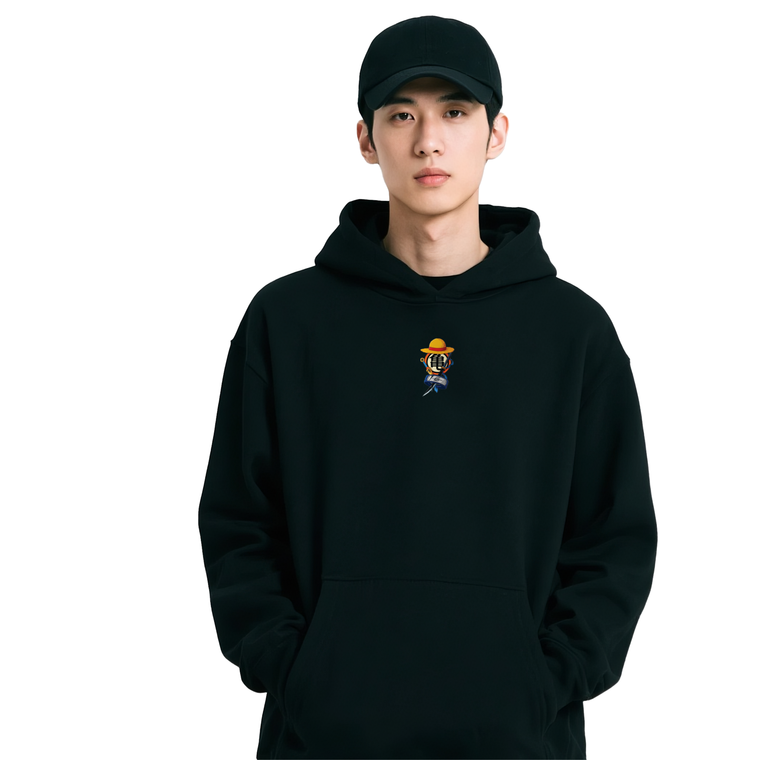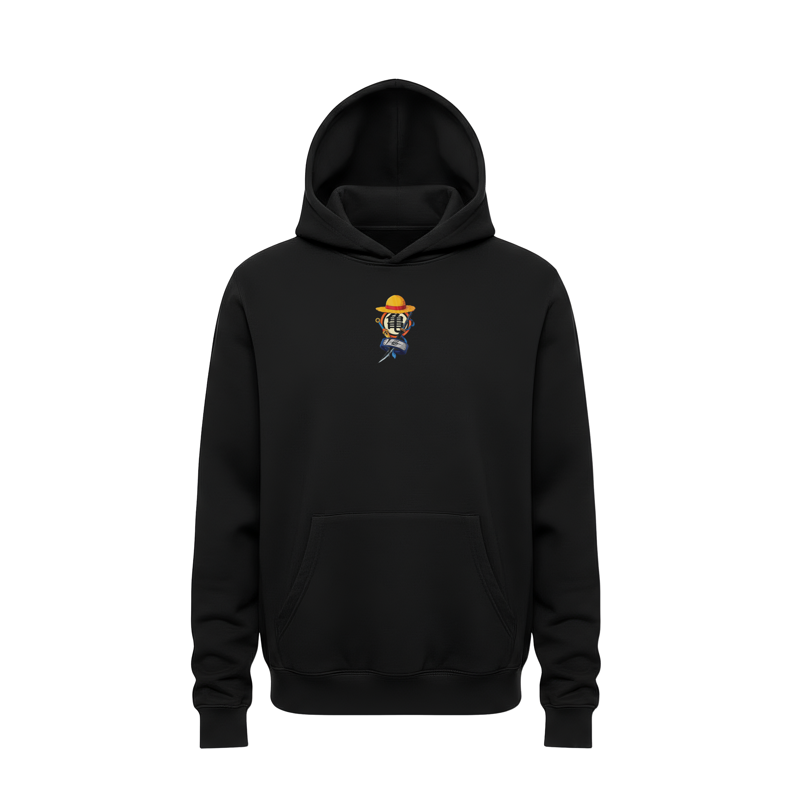 Deep Black Canvas: The bundle is centered on a luxury black heavyweight cotton hoodie, providing a professional, high-contrast foundation that allows the vibrant yellows, reds, and blues of the anime icons to pop.