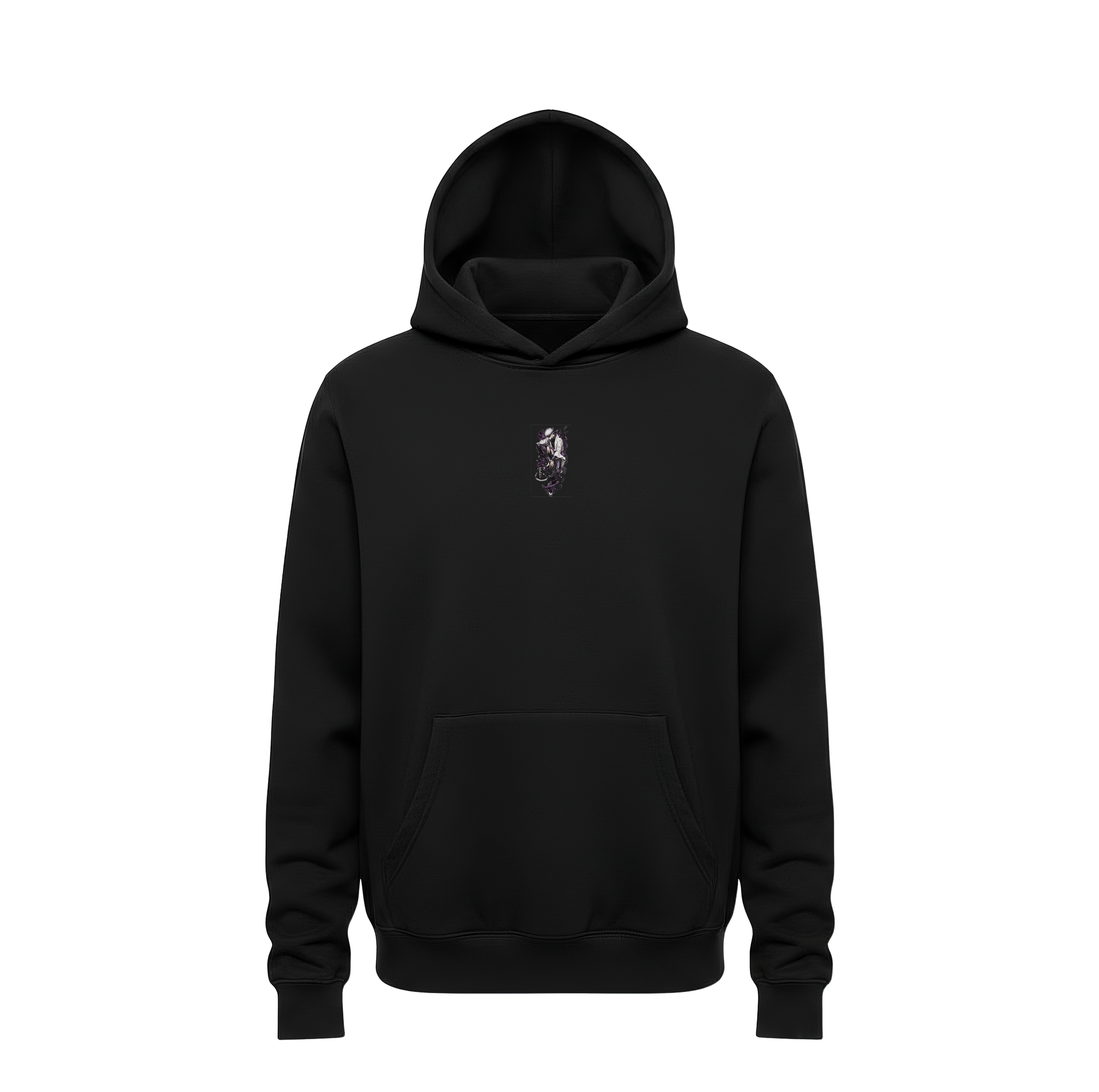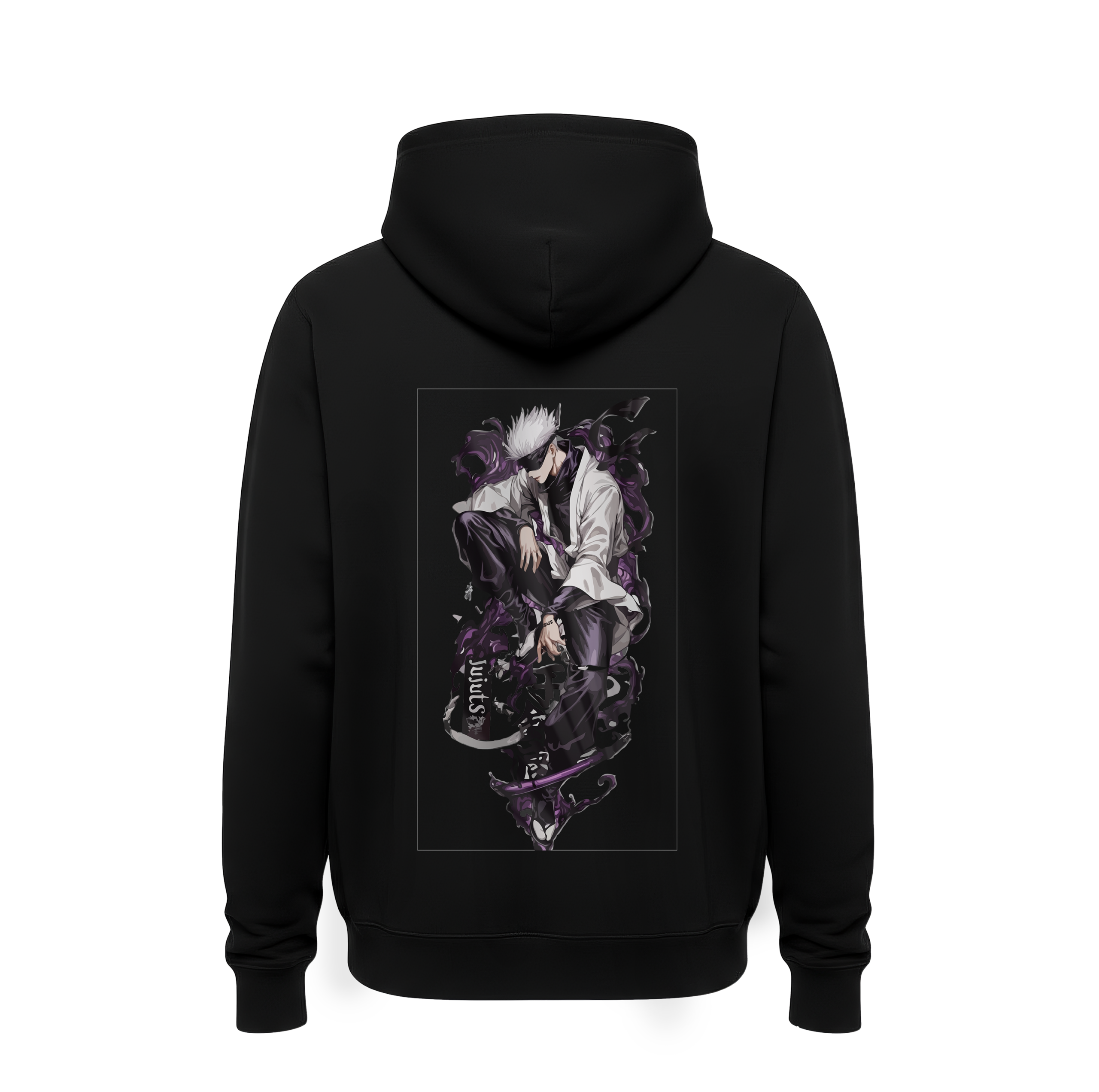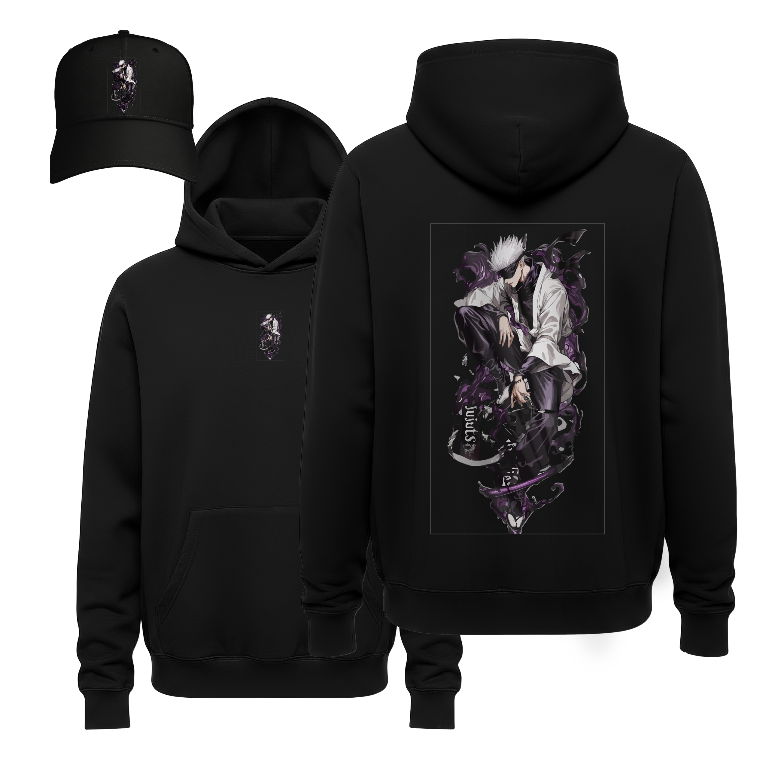 Deep Black Canvas: The bundle is centered on a luxury black heavyweight cotton hoodie, providing a professional, high-contrast foundation that makes the purple cursed energy appear to glow against the fabric.