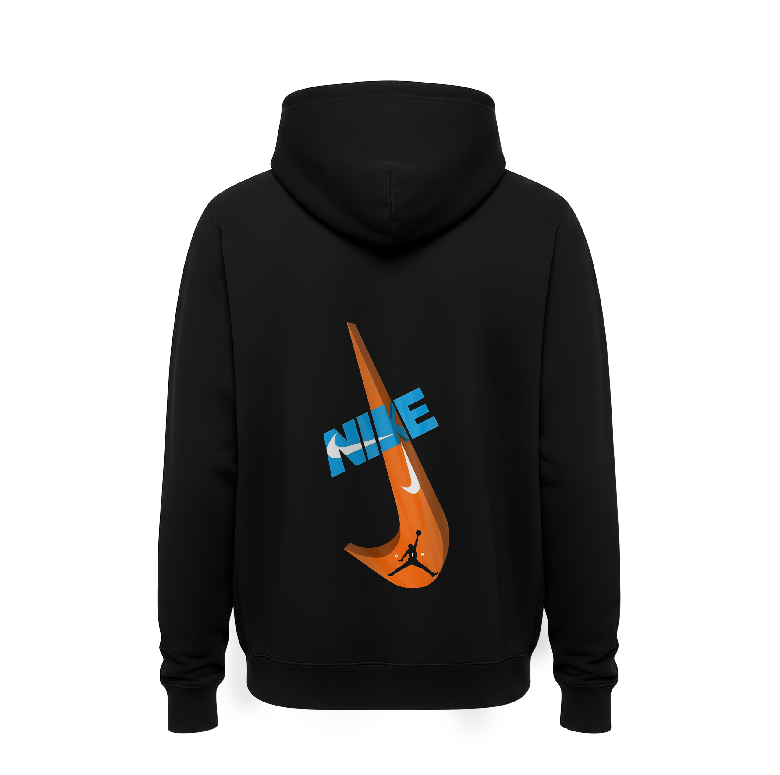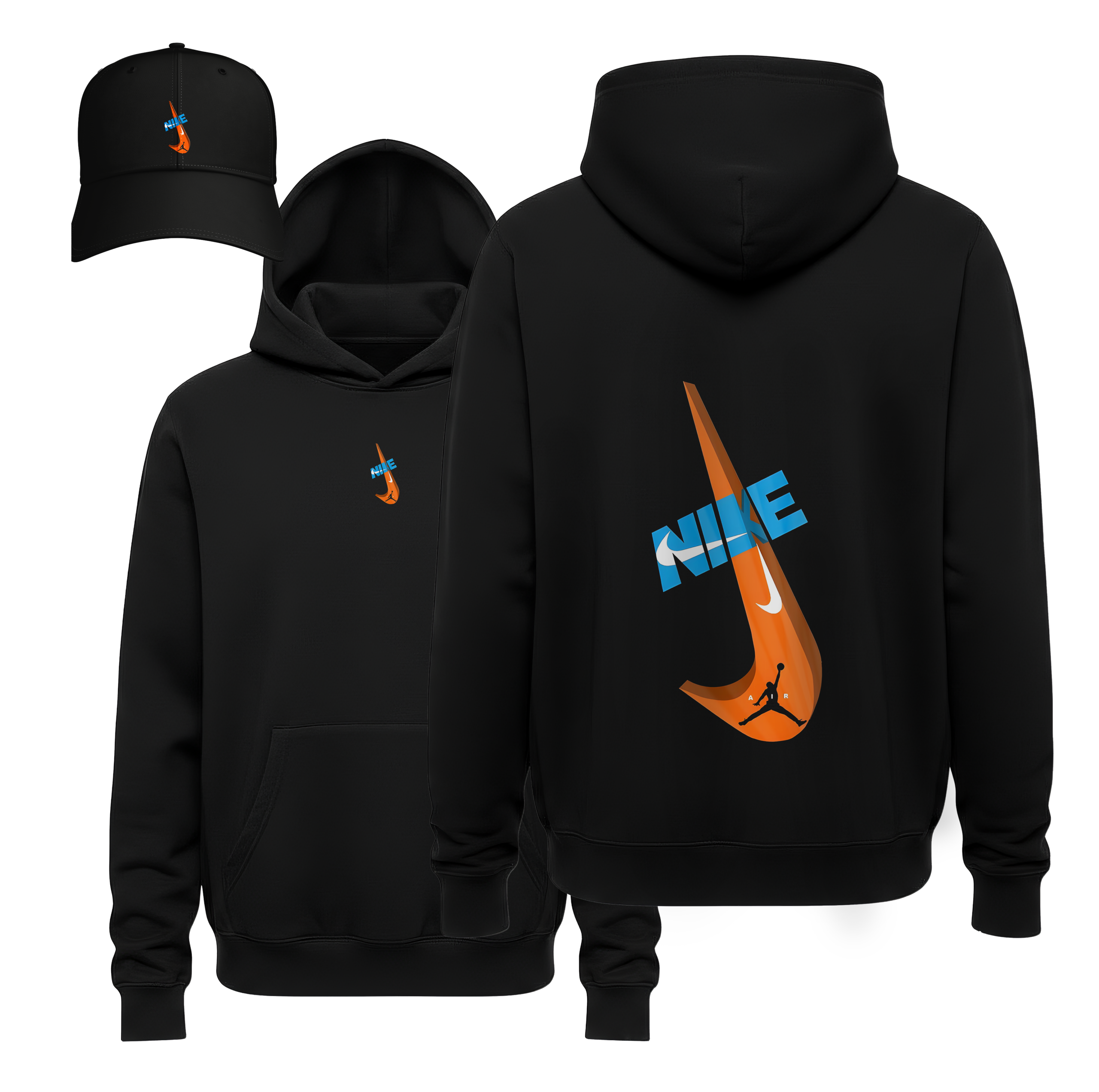 • Tri-Iconic Artistry: The back features a high-definition, vertical fusion of the Jordan Jumpman in peak flight, the bold “NIKE” block typography with its integrated swoosh, and a massive, stylized neon orange Swoosh that anchors the composition.