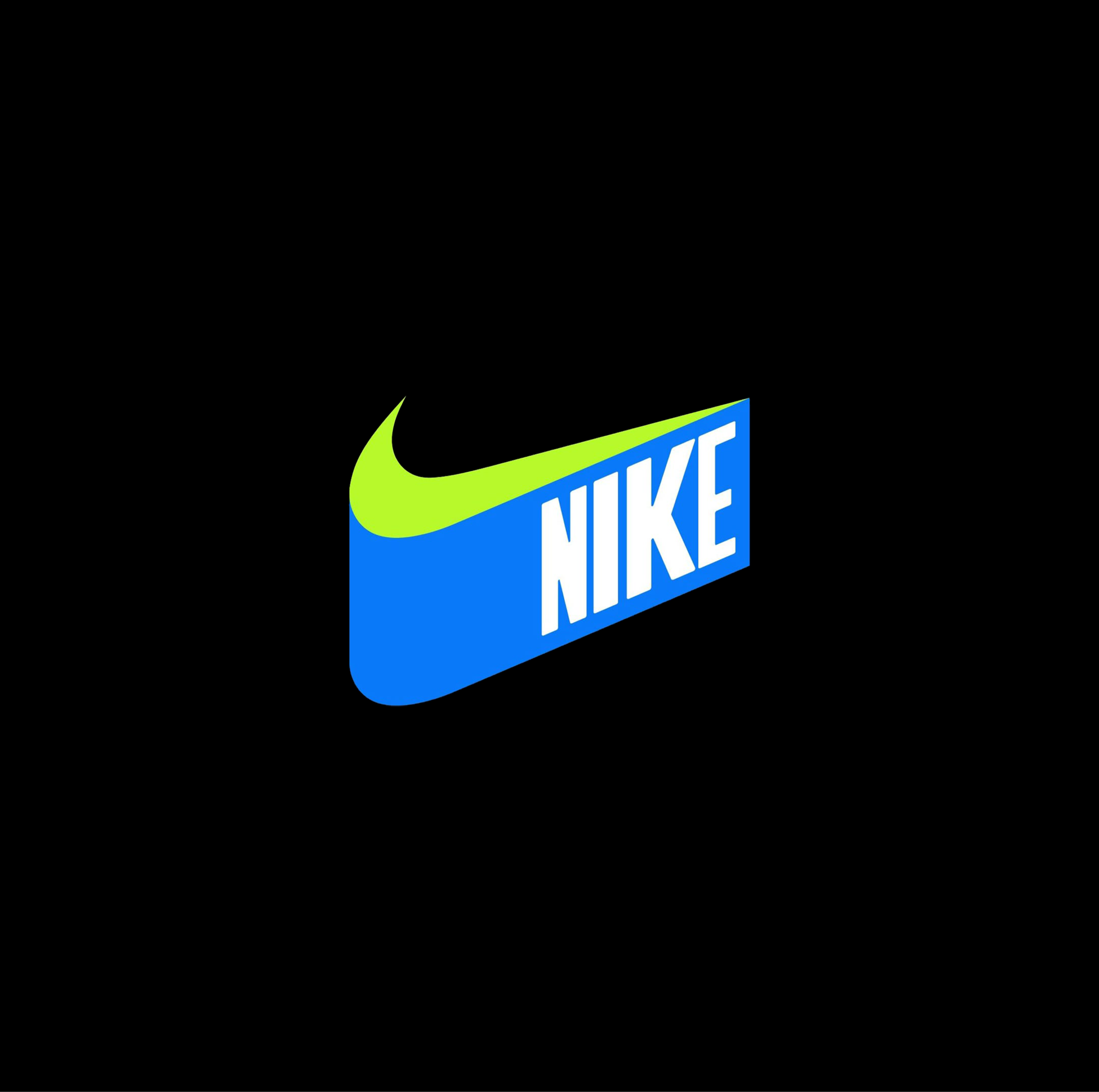 Dimensional Typography: Layered over the colored swatch is the classic “NIKE” block wordmark in crisp, solid white, featuring a slight perspective tilt that gives the entire graphic a dynamic, architectural feel.