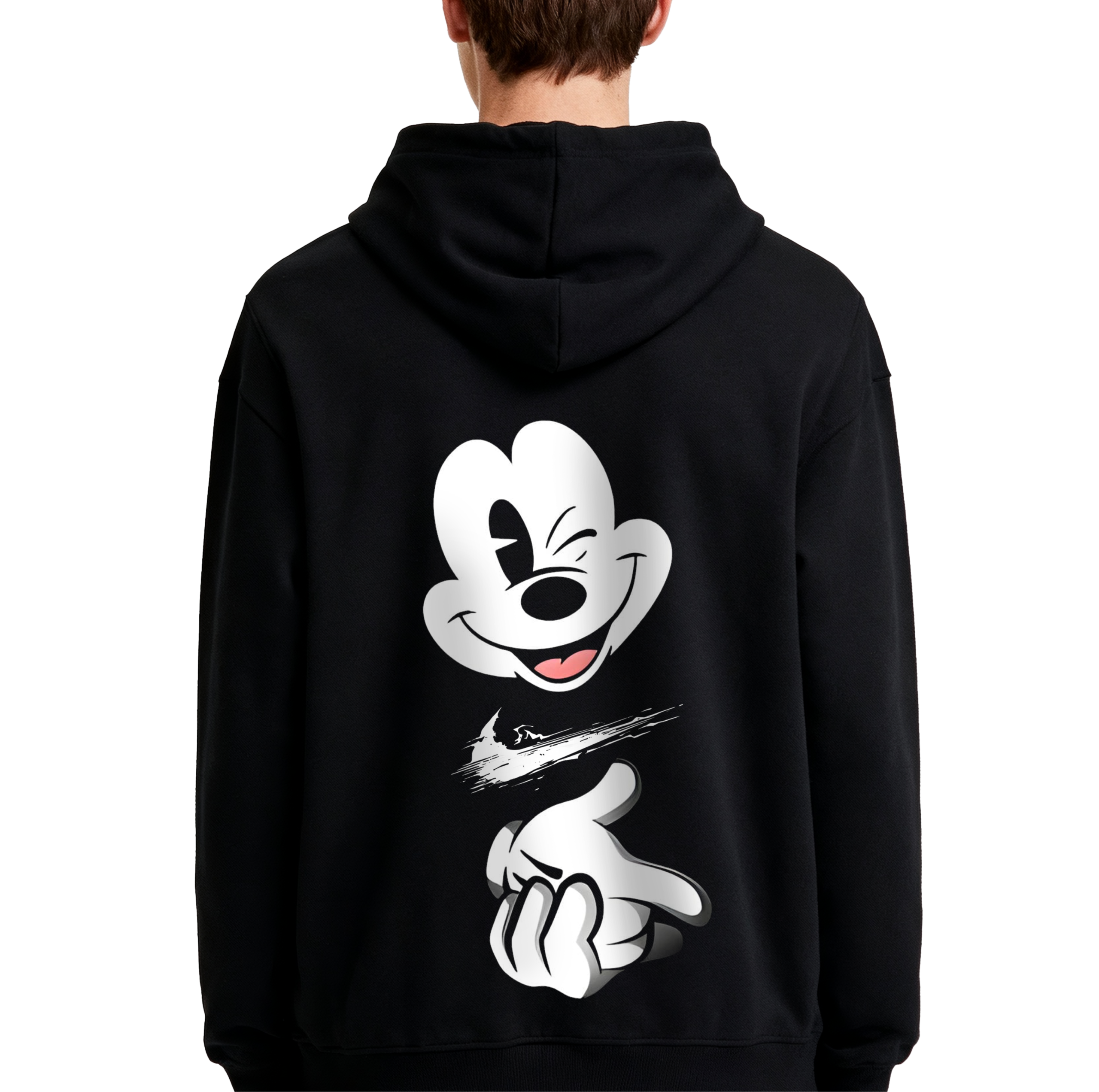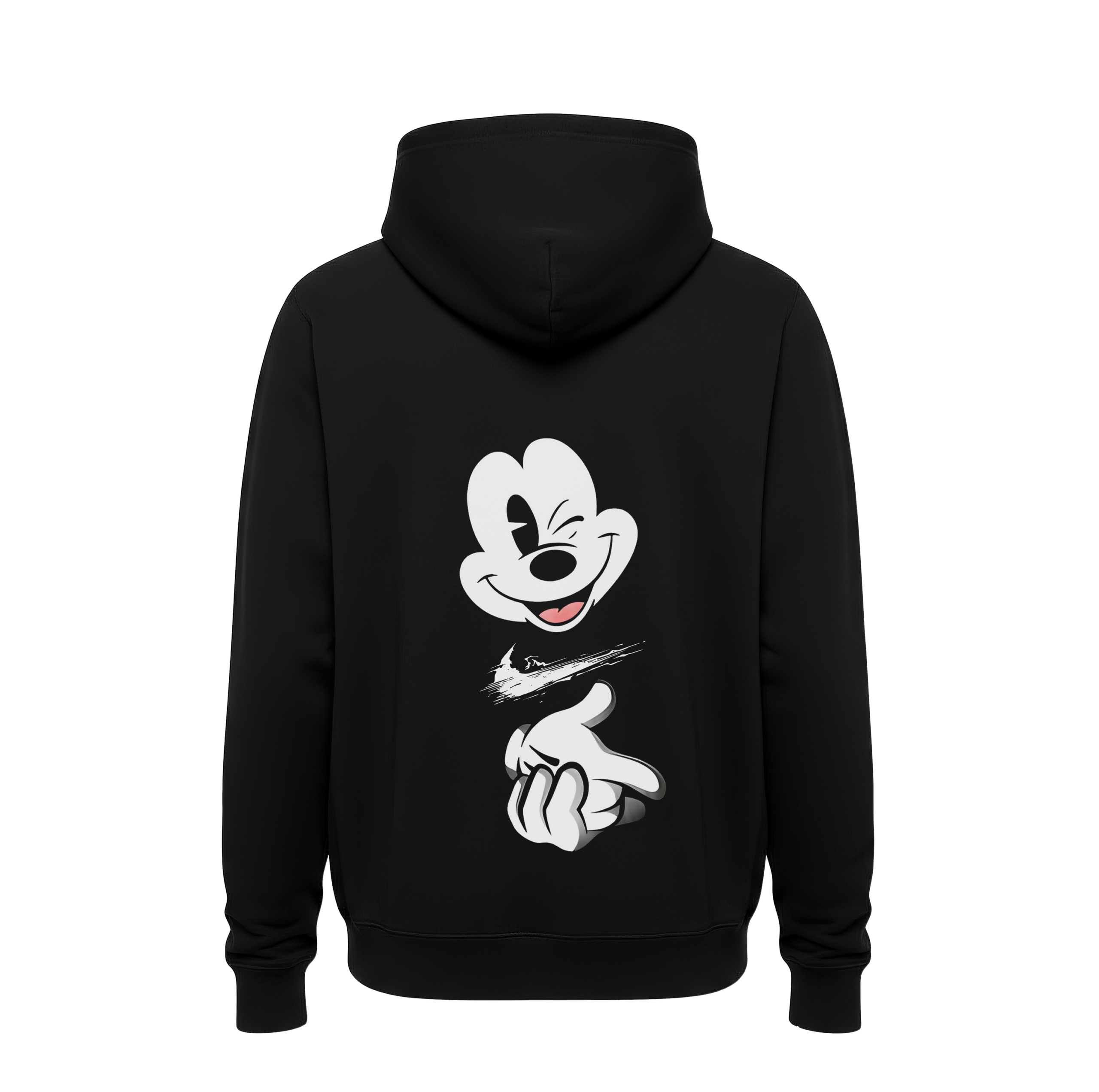 • Rebellious Character Artistry: The back features a stylized, monochrome illustration of Mickey Mouse’s face and gloved hand. Mickey is depicted with a knowing wink and a “finger gun” gesture, subverting his classic cheerful image into a symbol of street authority.