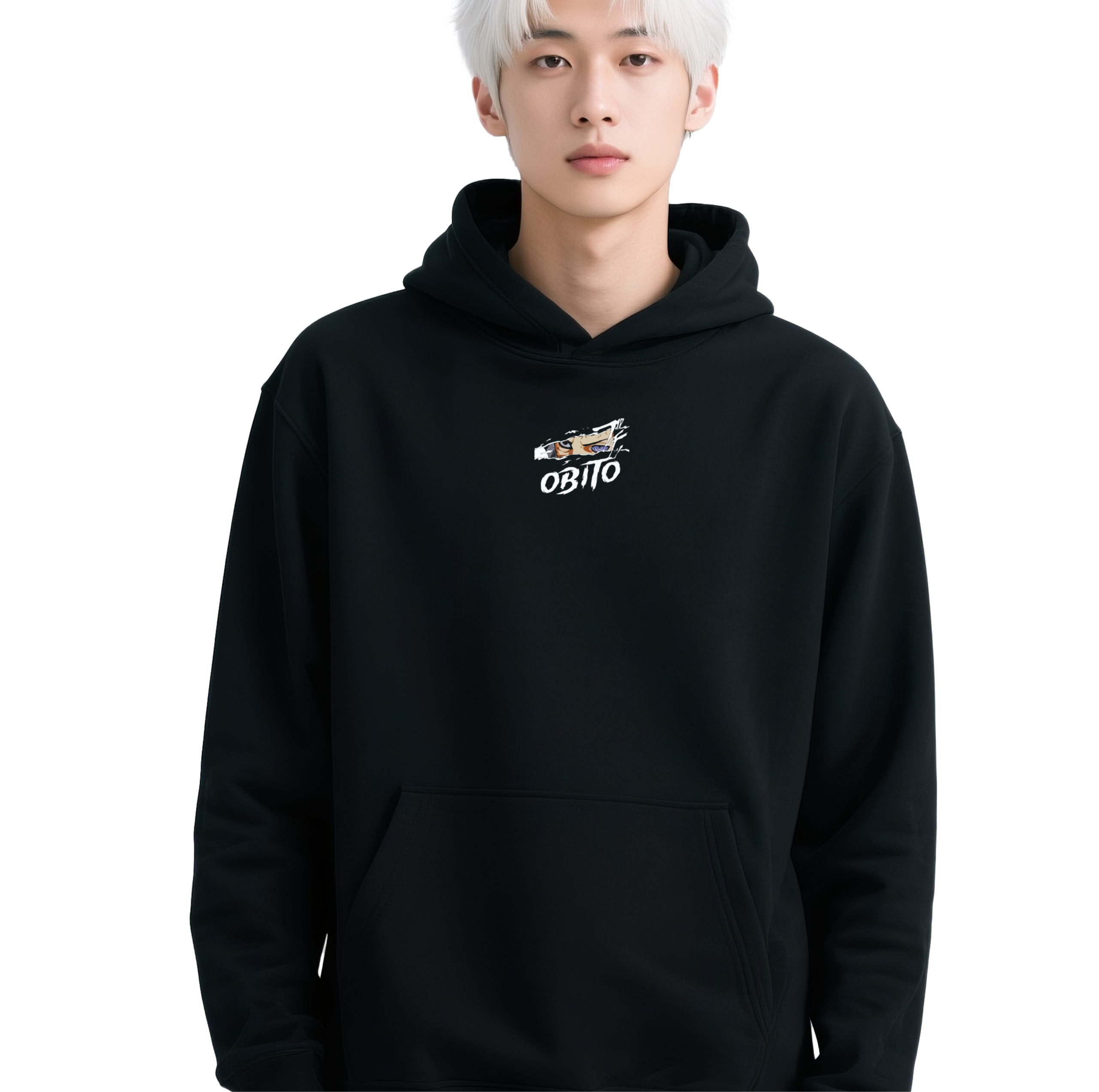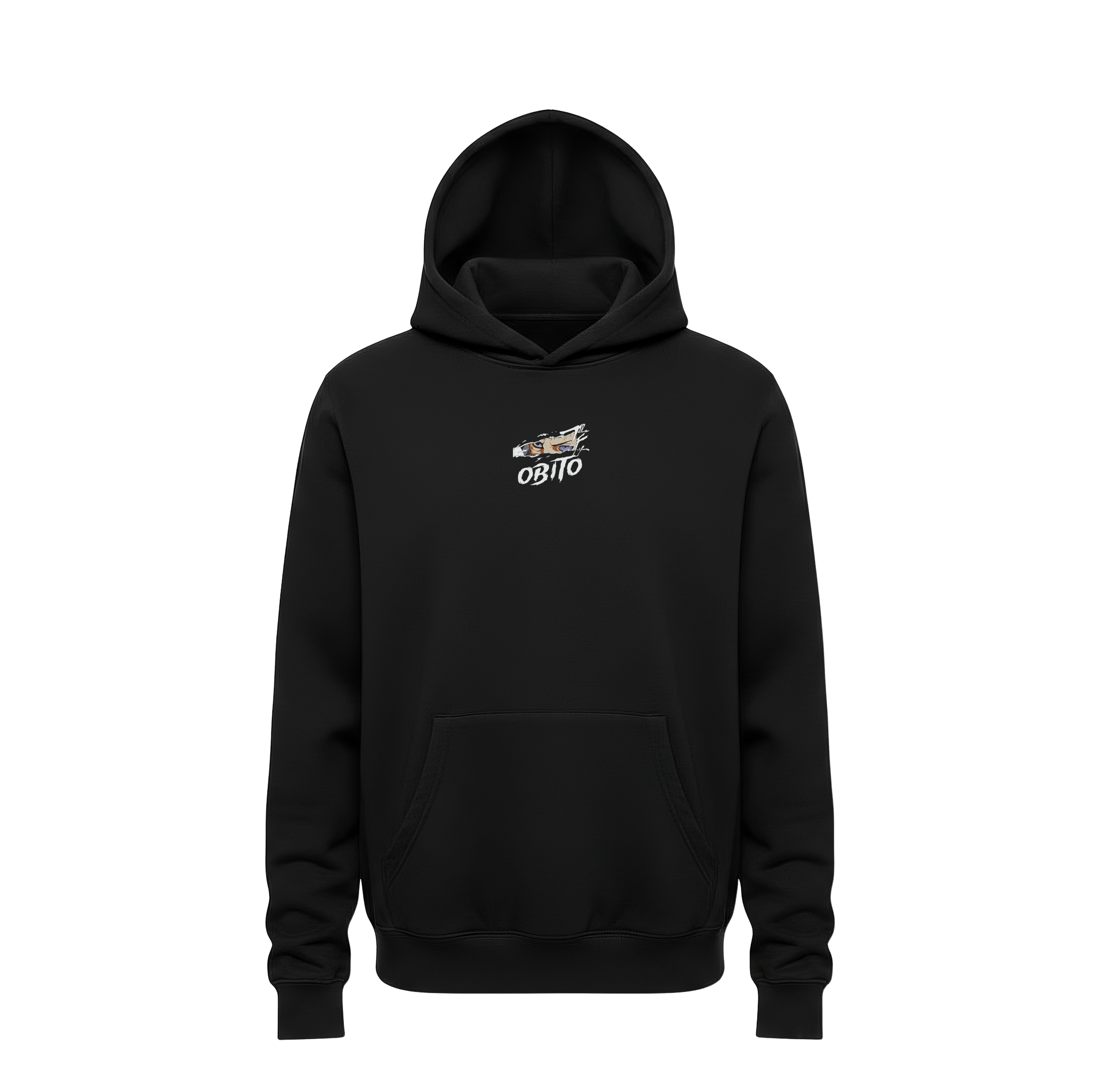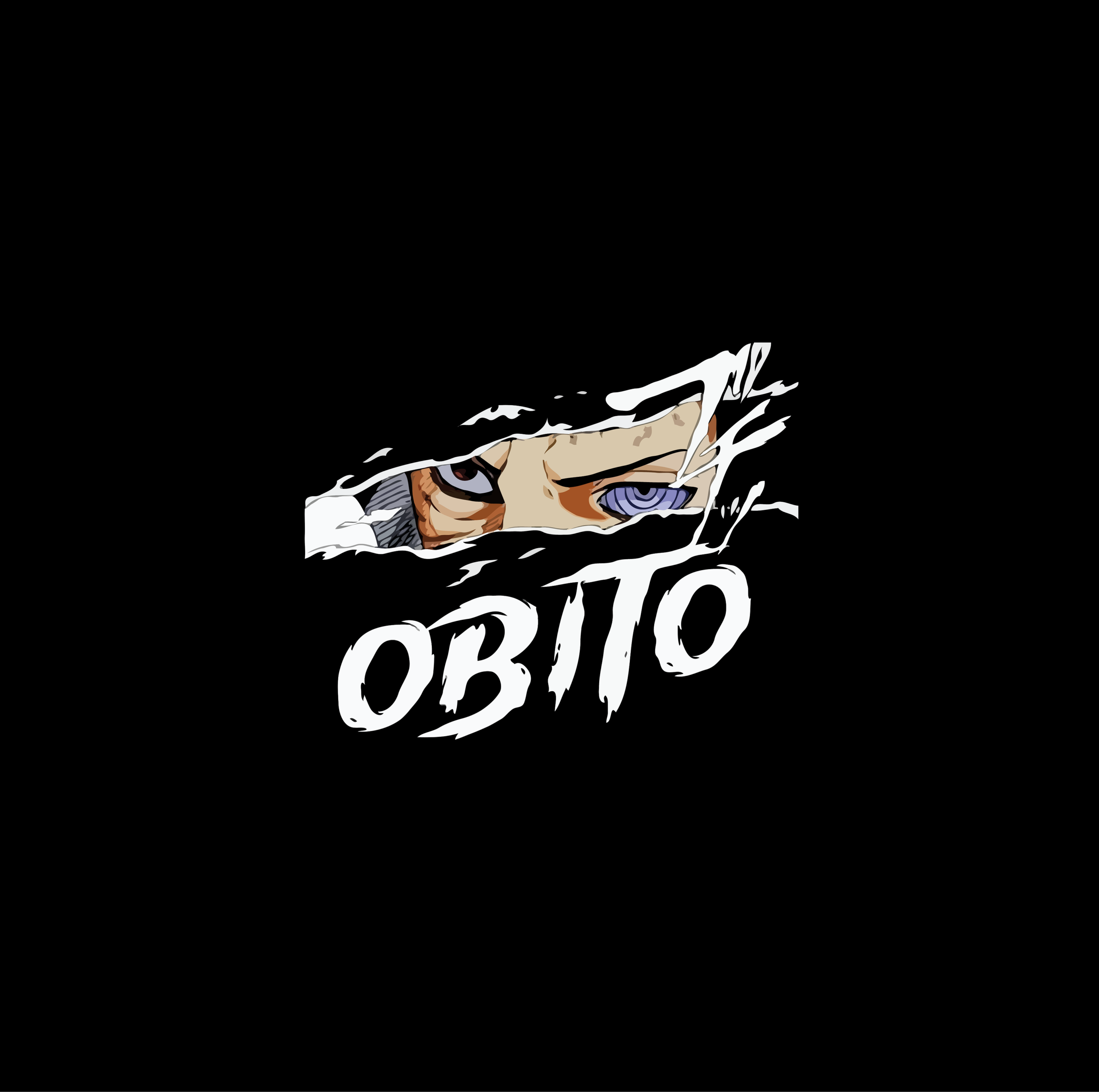 • Aggressive Typography: Below the eyes, the name “OBITO” is rendered in a massive, distressed white brush-style font that mirrors the raw, chaotic energy of his journey.