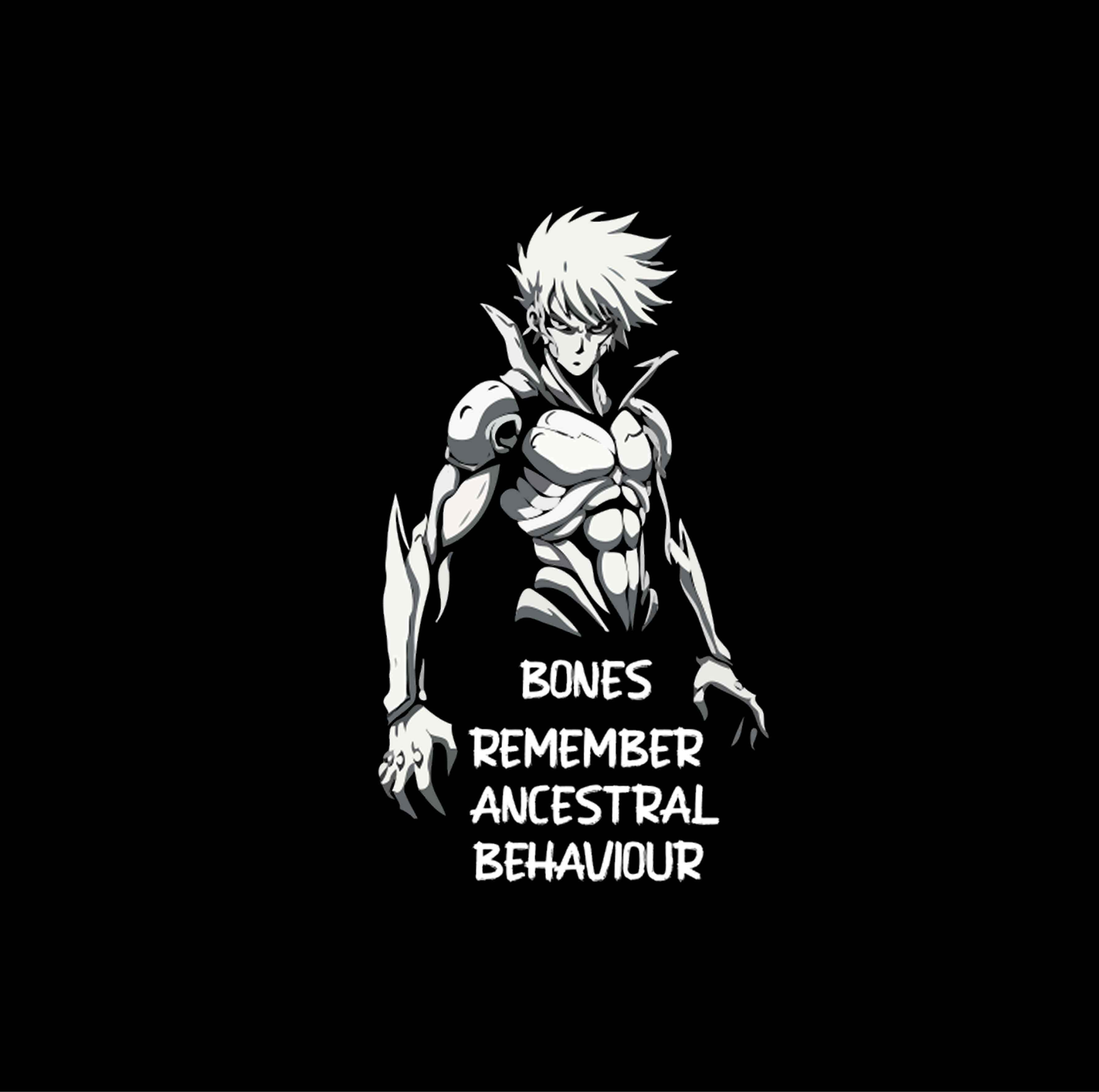 • Core Lyrical Creed: The artwork is anchored by the powerful philosophical statement: “BONES REMEMBER ANCESTRAL BEHAVIOUR” rendered in a rugged, weathered white font.