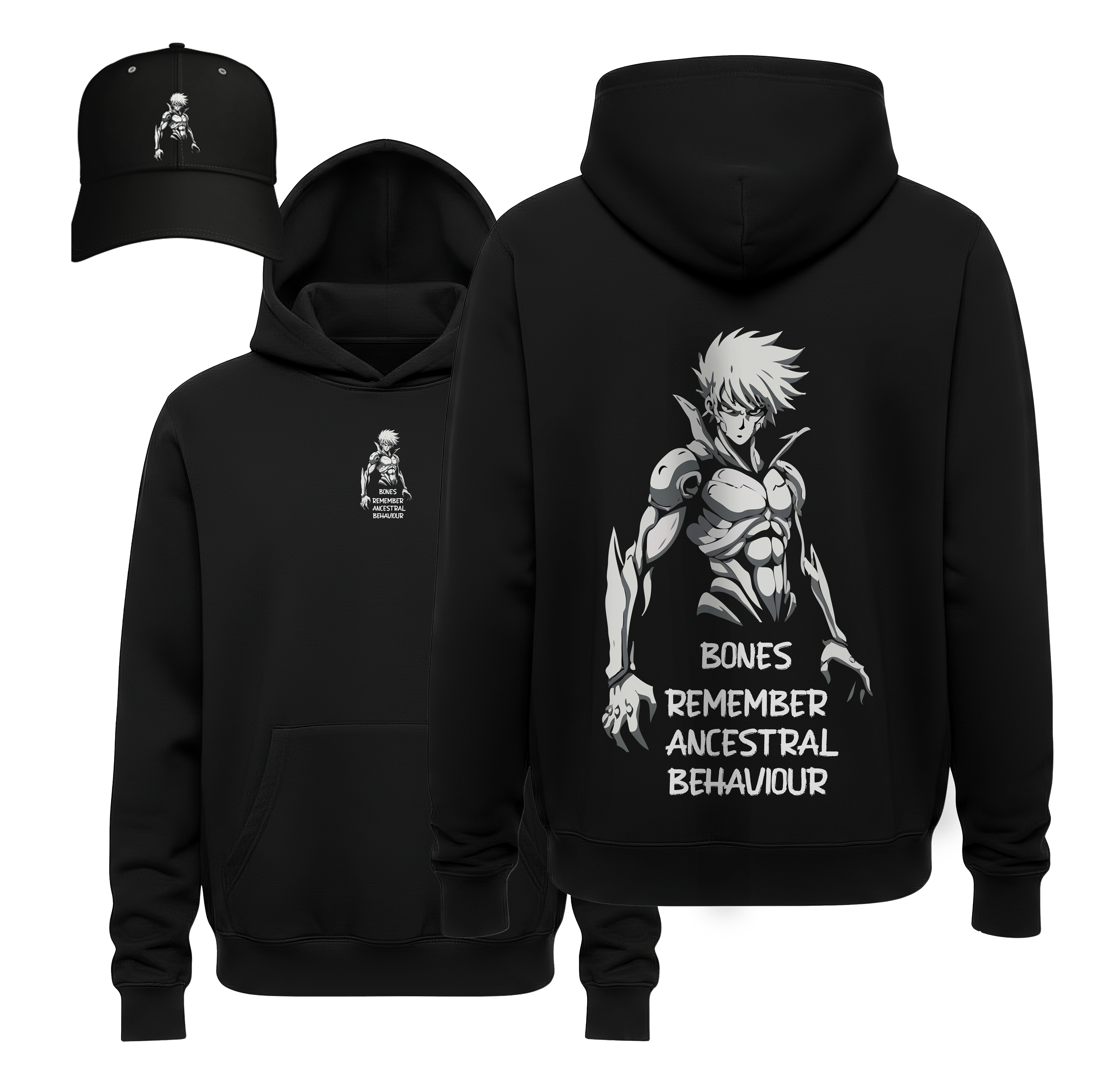 • Coordinated Tactical Gear: This bundle includes a luxury heavyweight black hoodie and a matching structured cap, both featuring the striking white-on-black ancestral graphic.