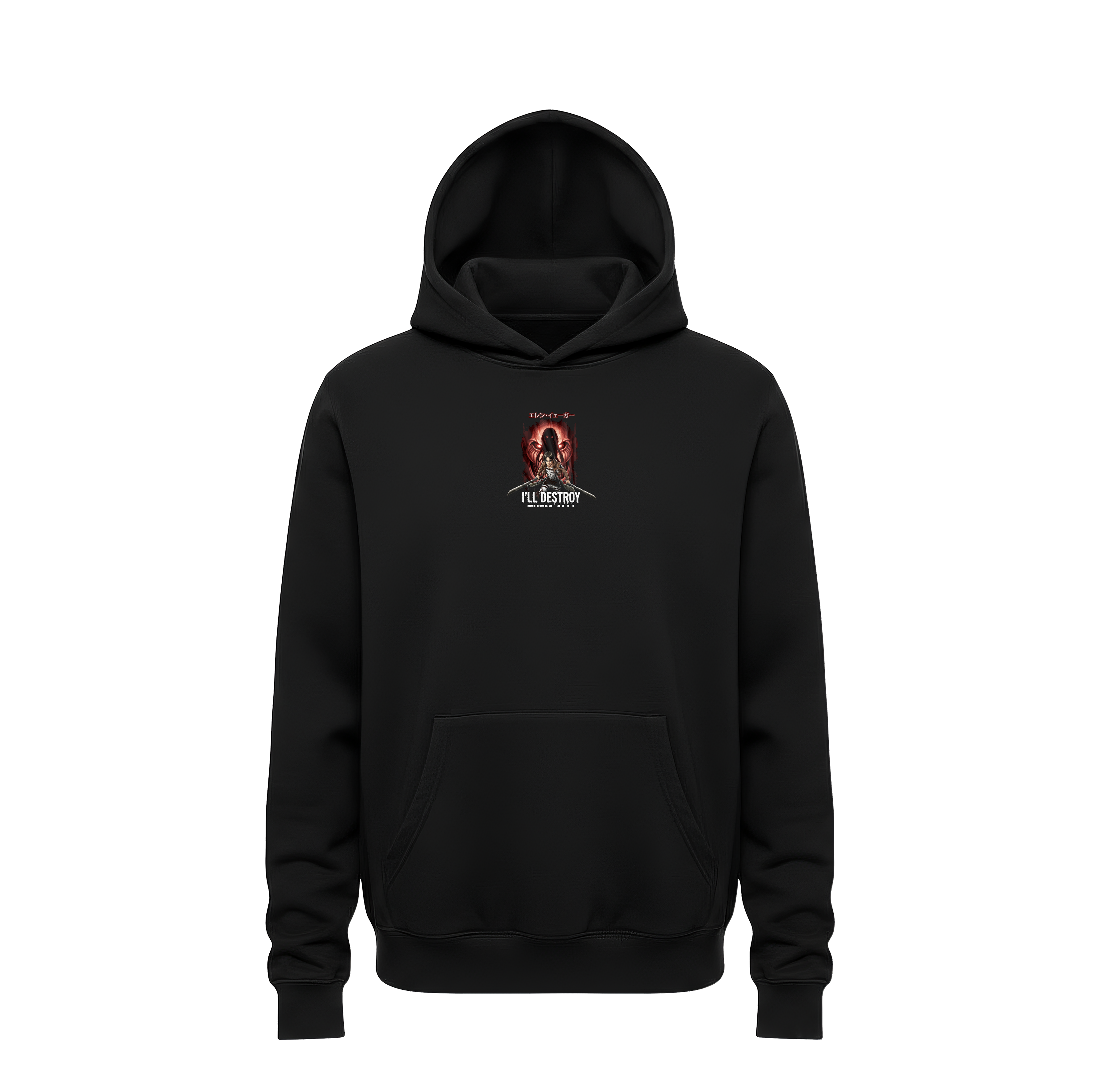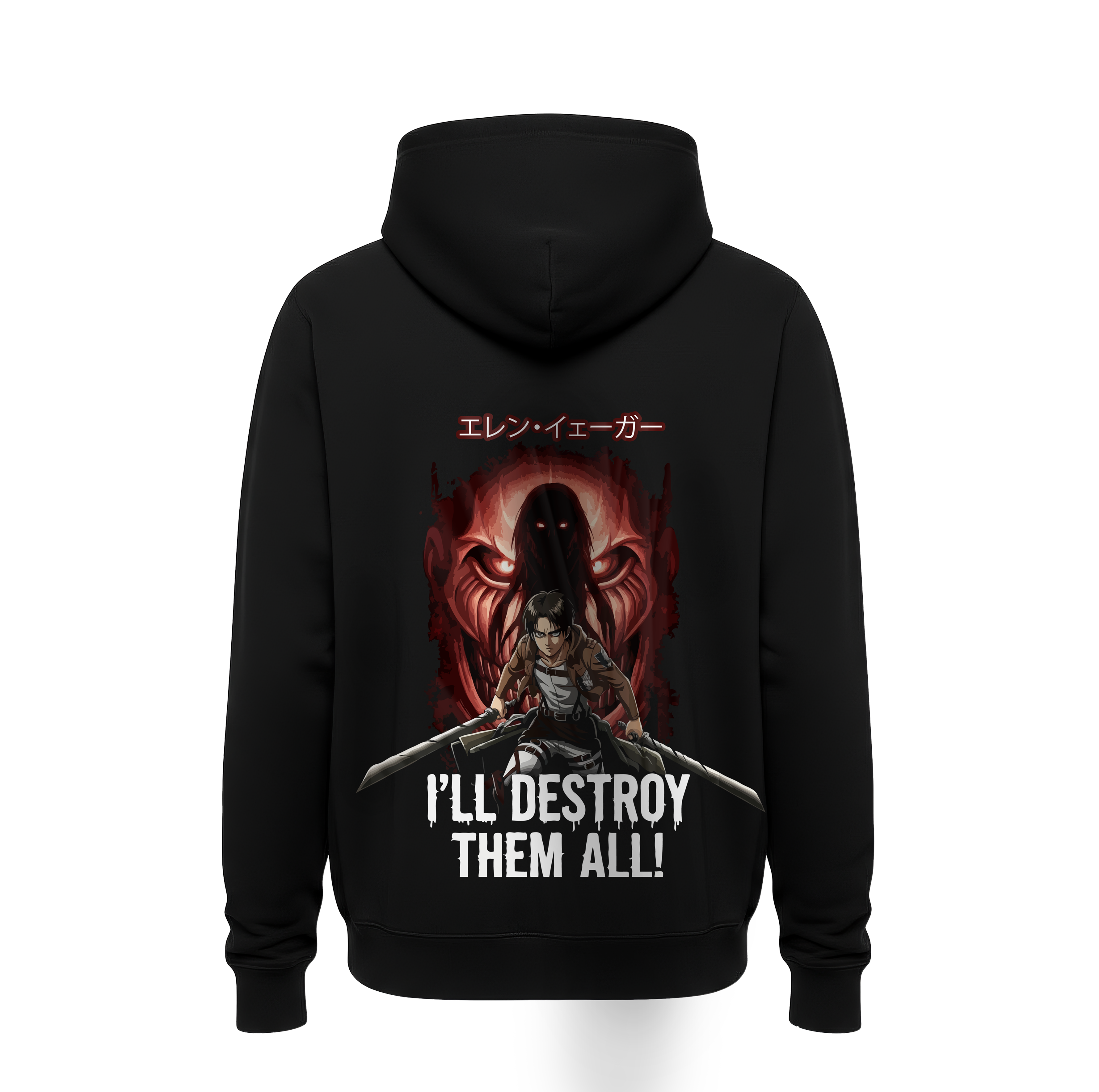 Channel the raw intensity of the Scout Regiment with this “I’ll Destroy Them All!” Eren Yeager hoodie and matching cap set. The back graphic features a menacing Eren backed by the terrifying shadow of a Titan, perfectly capturing his vowed vengeance and the dark legacy of the Attack Titan. This set is a definitive piece for fans who want to display the fierce determination of humanity’s last hope in a bold, synchronized style. This hoodie is constructed from a premium heavyweight fleece blend, ensuring a soft touch interior and superior insulation for long-lasting comfort. The high-fidelity print utilizes specialized inks that maintain the deep reds and sharp lines of the artwork without cracking or fading after multiple washes. Completed with a durable structured cap and reinforced stitching throughout, this combo is engineered to survive daily wear while retaining its original shape and visual power.