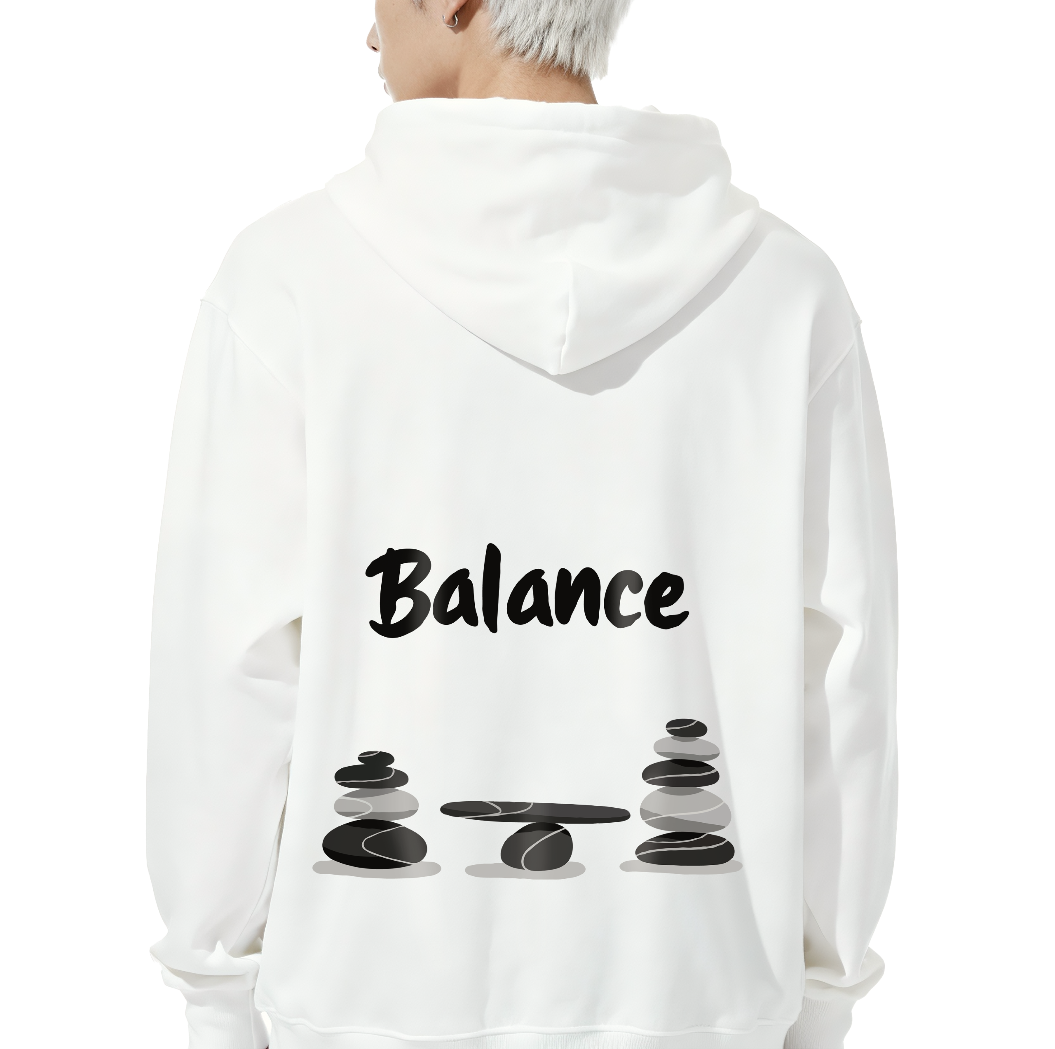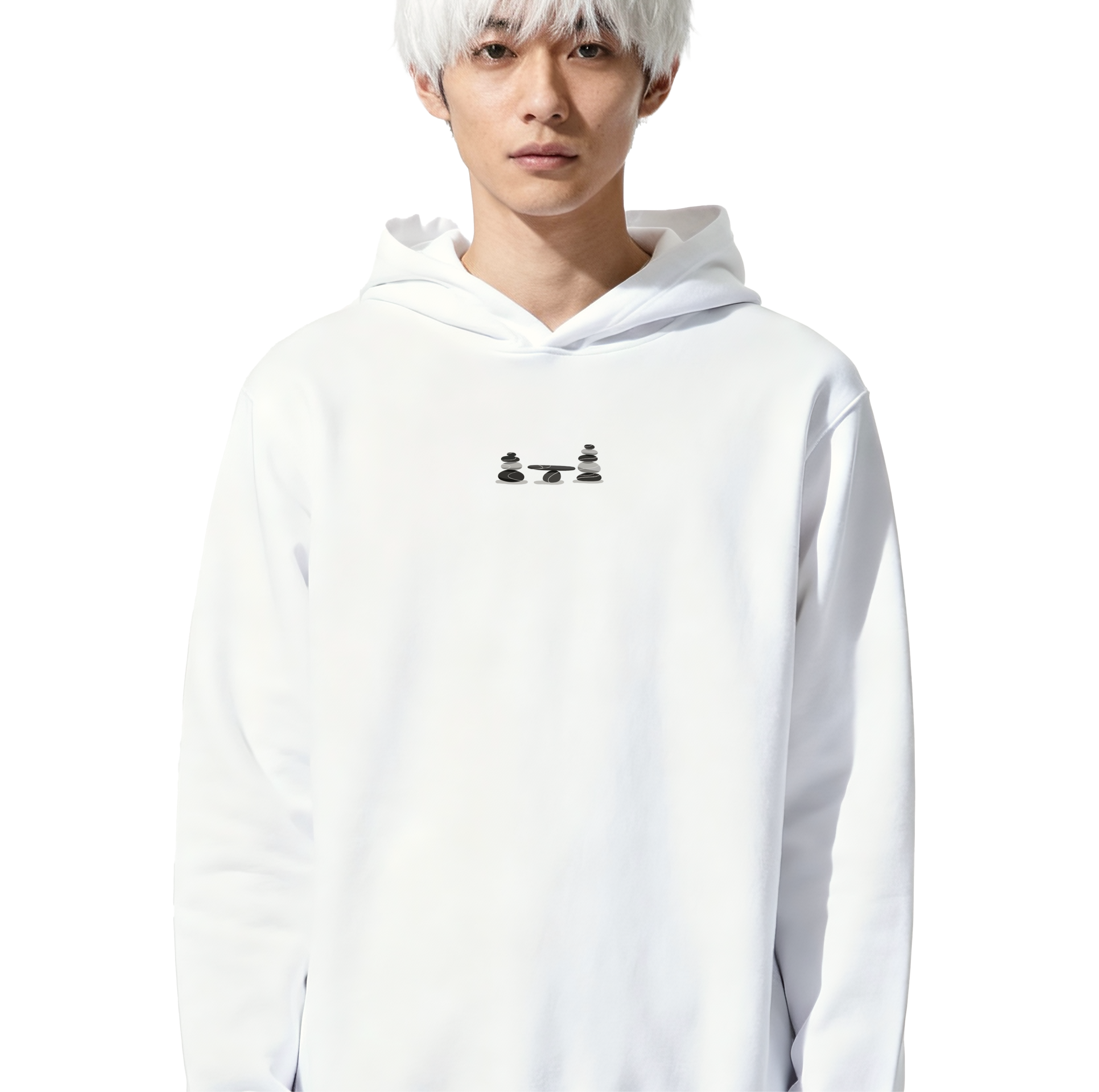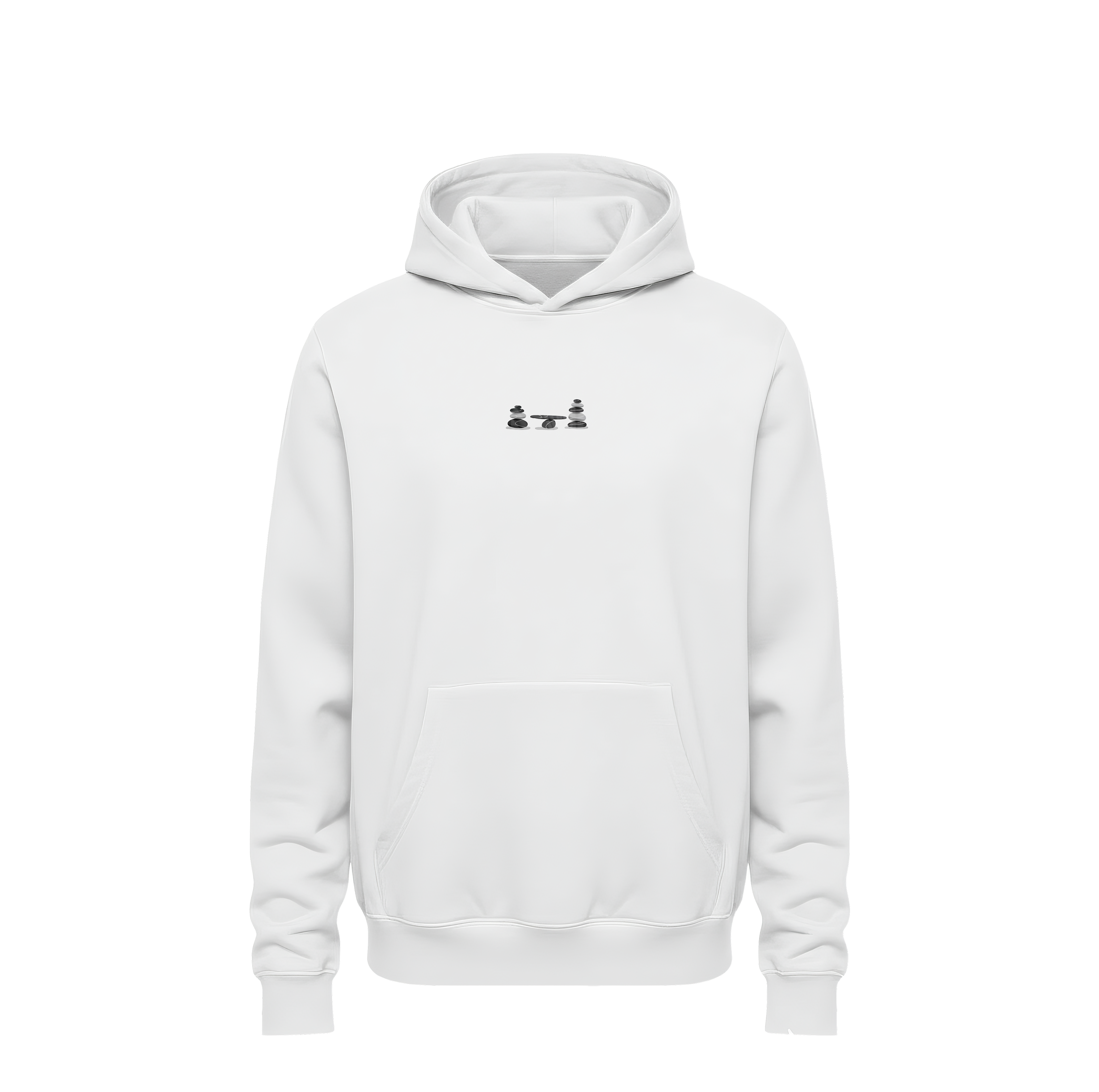 • Minimalist Front Profile: The hoodie maintains an intentional, calm look from the front with a small-scale version of the stone-stacking icon placed subtly on the chest.