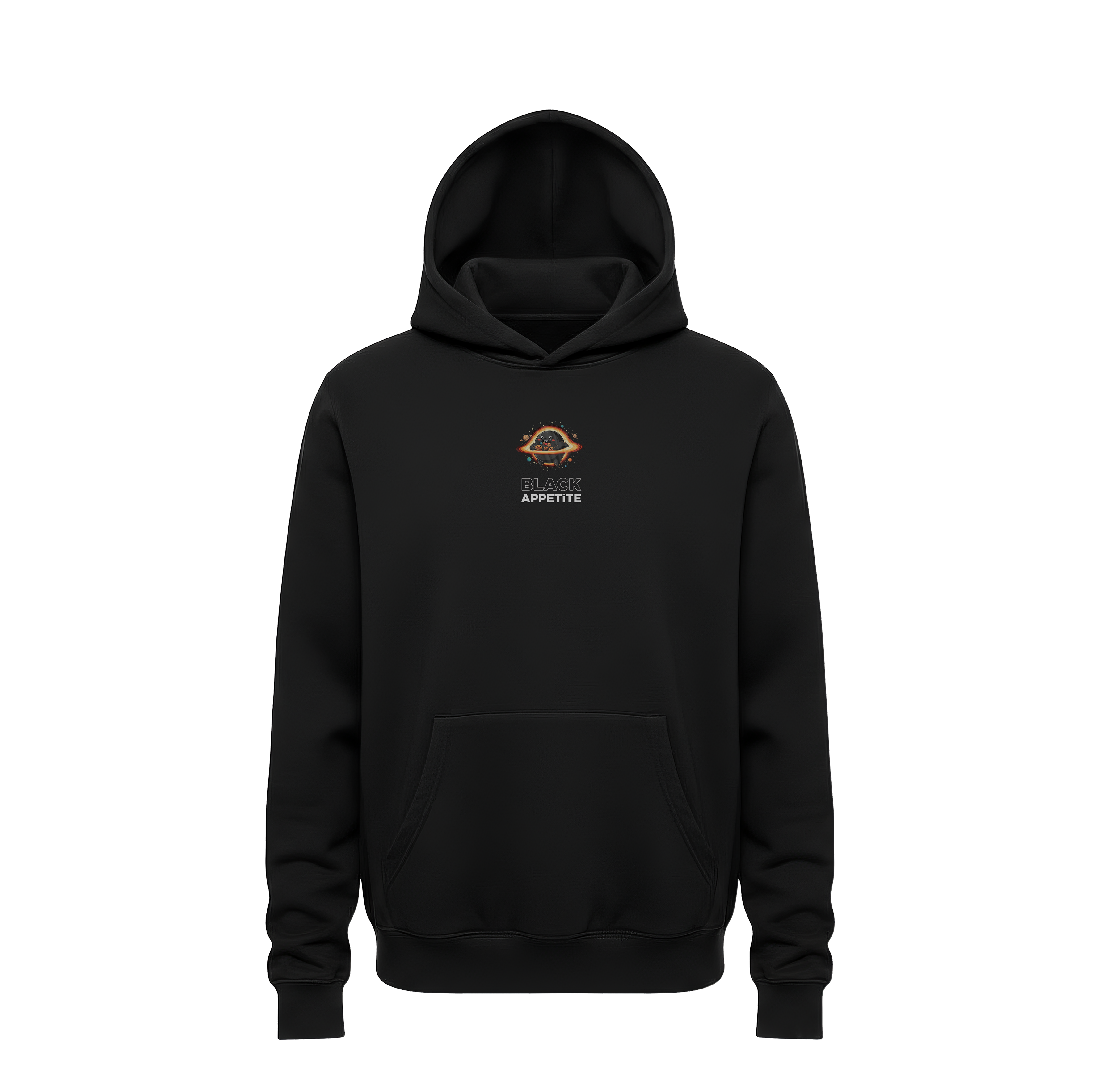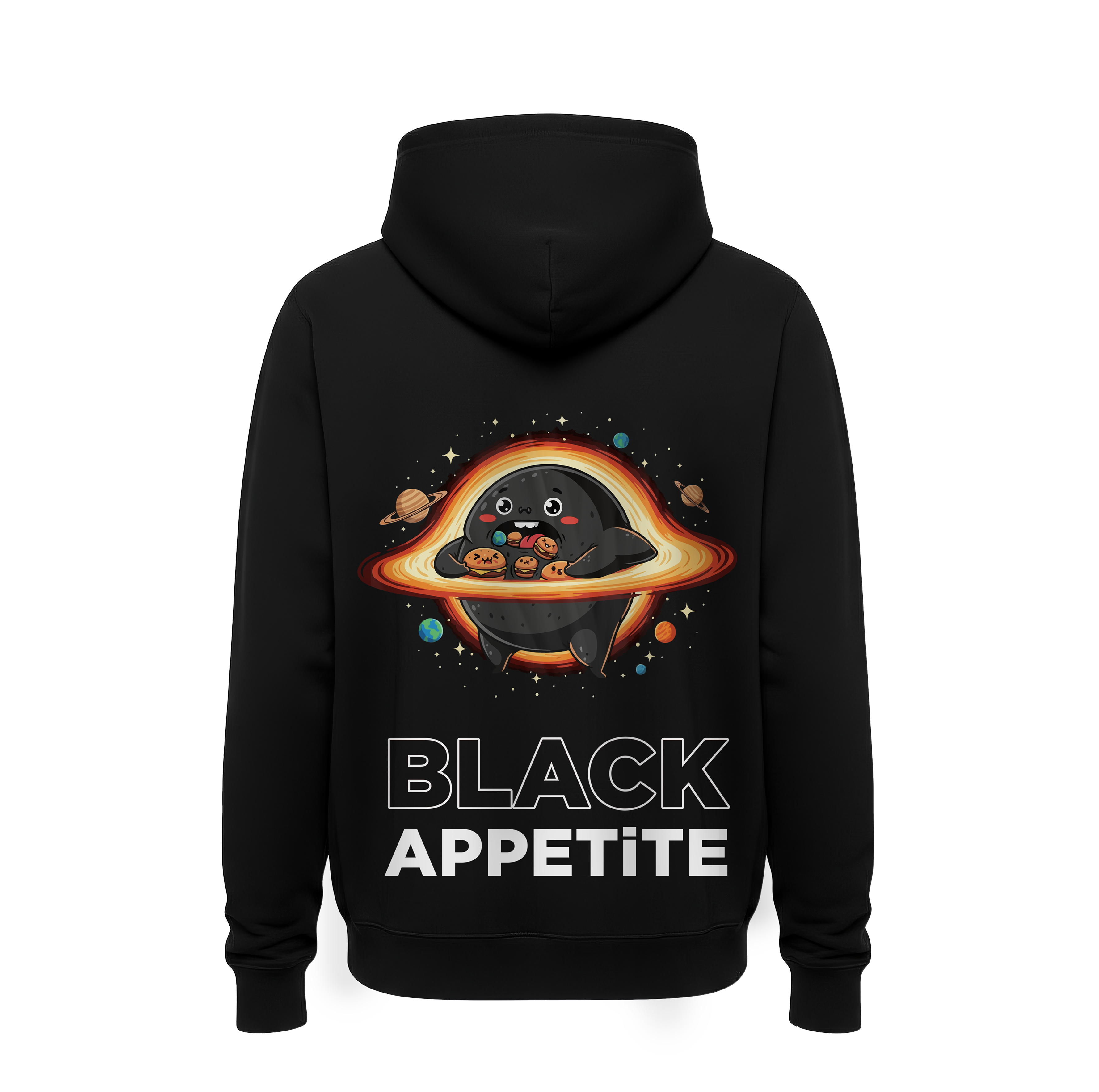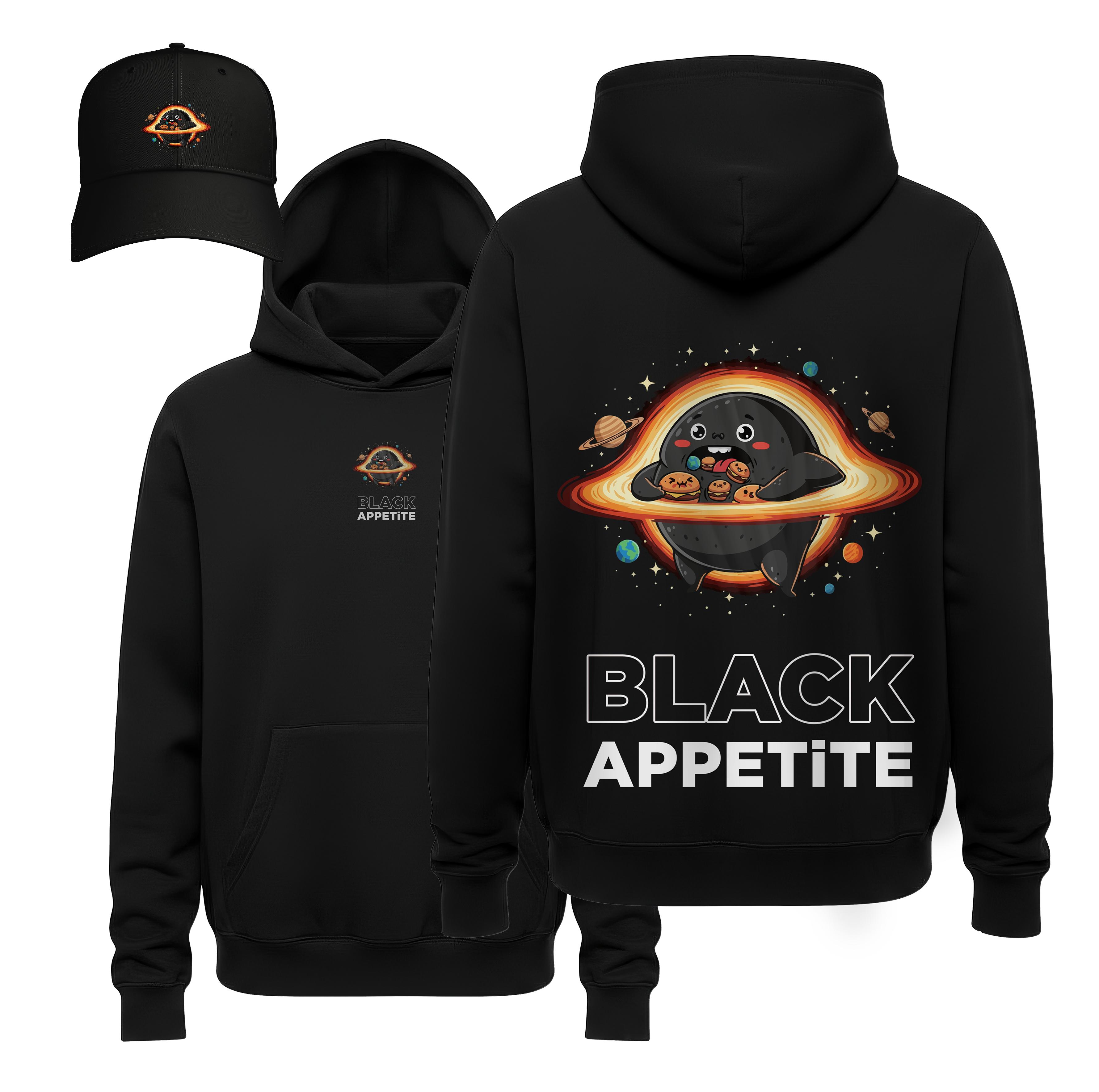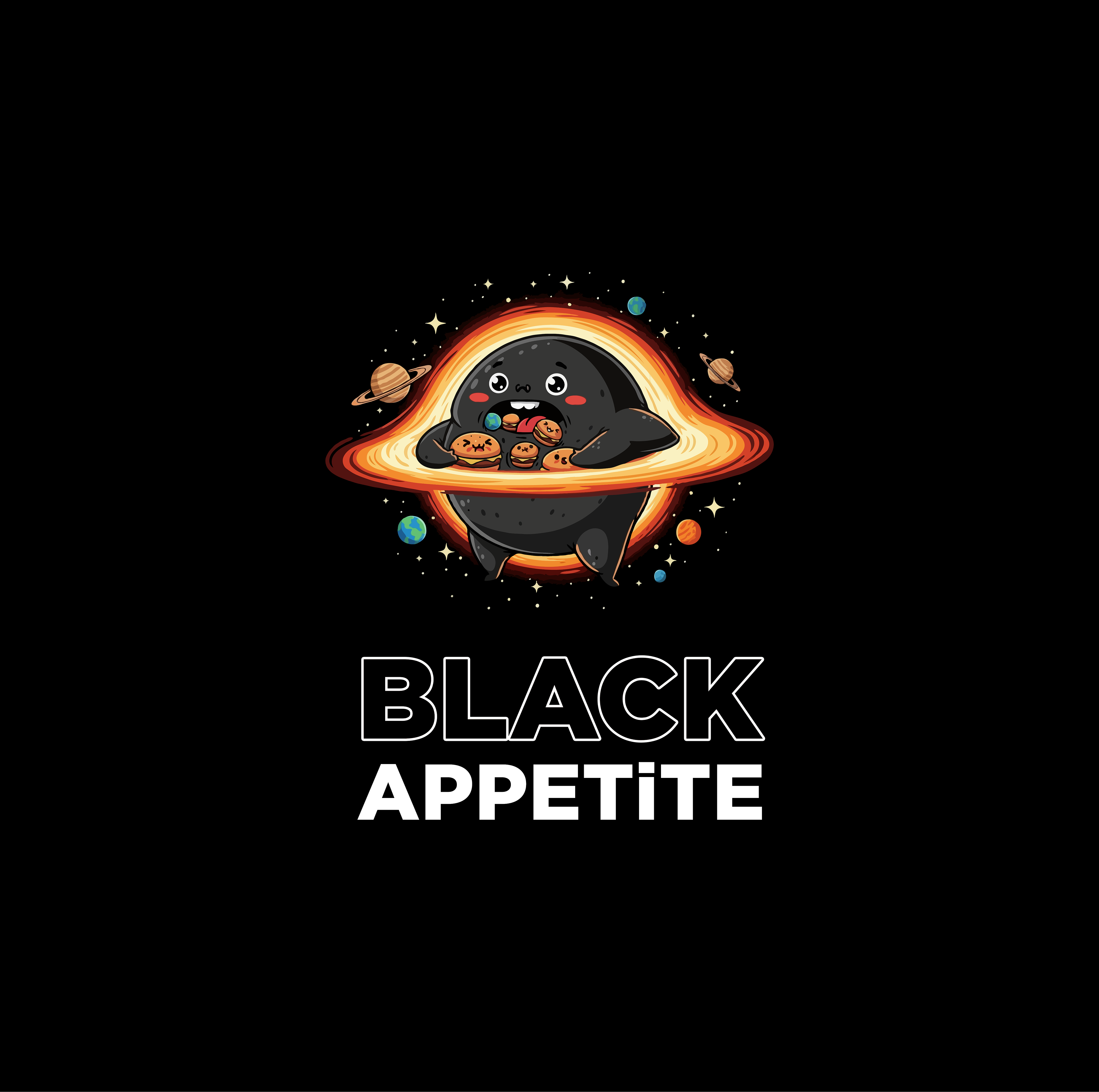 Scientific Wit: The design is anchored by the bold, white typography “BLACK APPETITE,” blending the gravity of astrophysics with a fun, modern streetwear aesthetic.