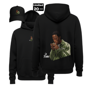 Coordinated Space Gear: This bundle includes a luxury heavyweight black hoodie and a matching structured cap, both featuring the vibrant orange and yellow cosmic event horizon graphic.