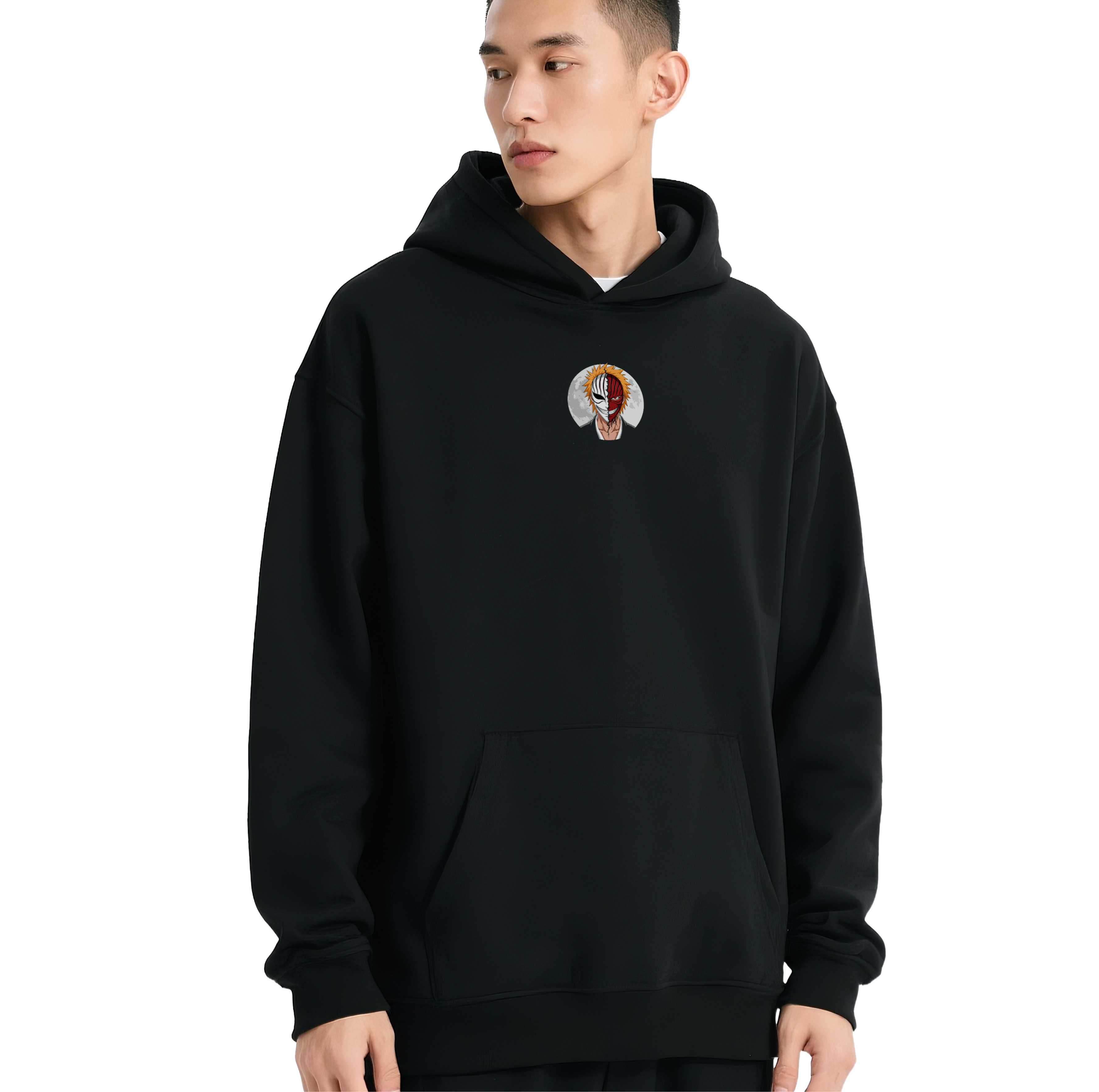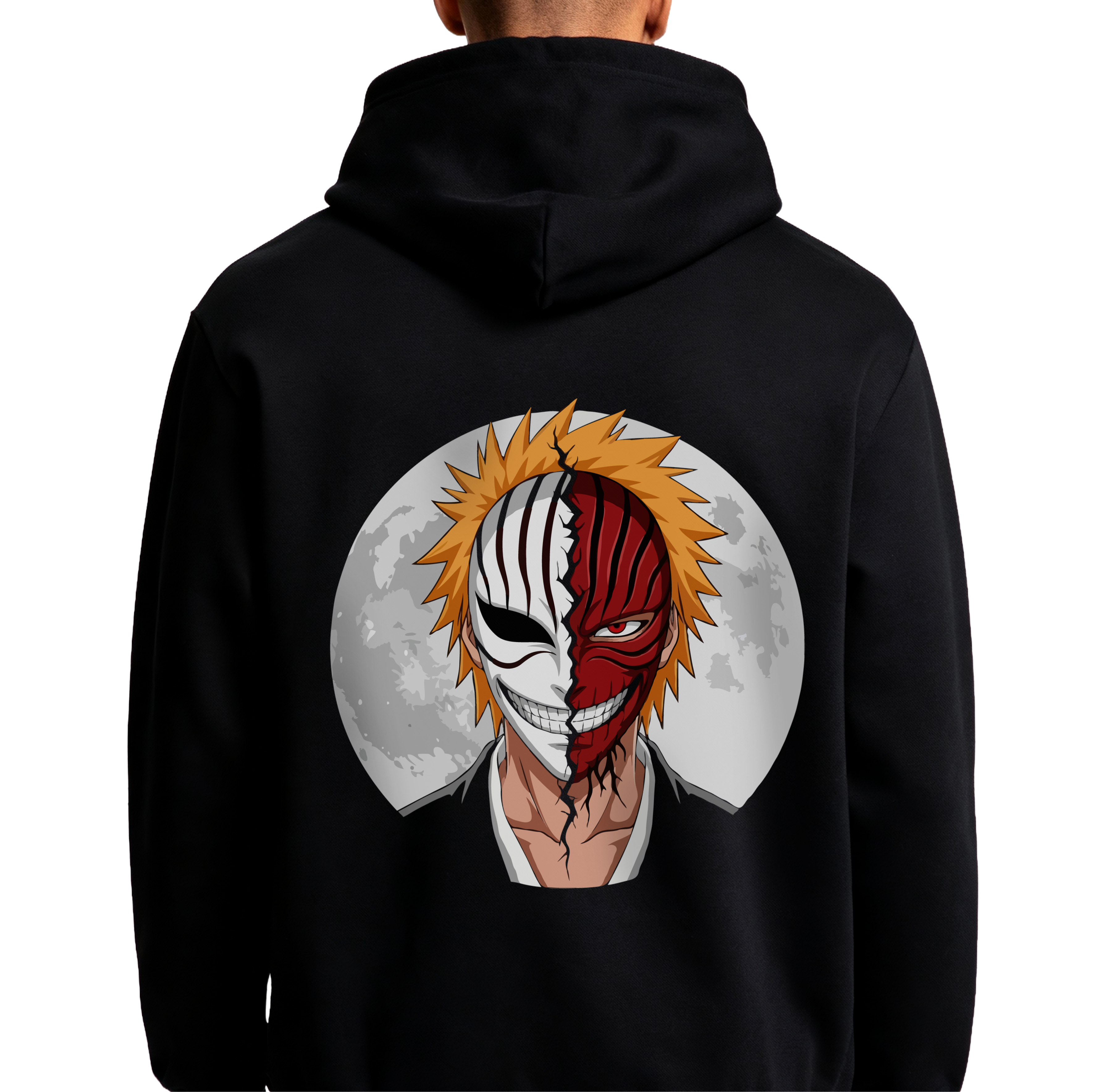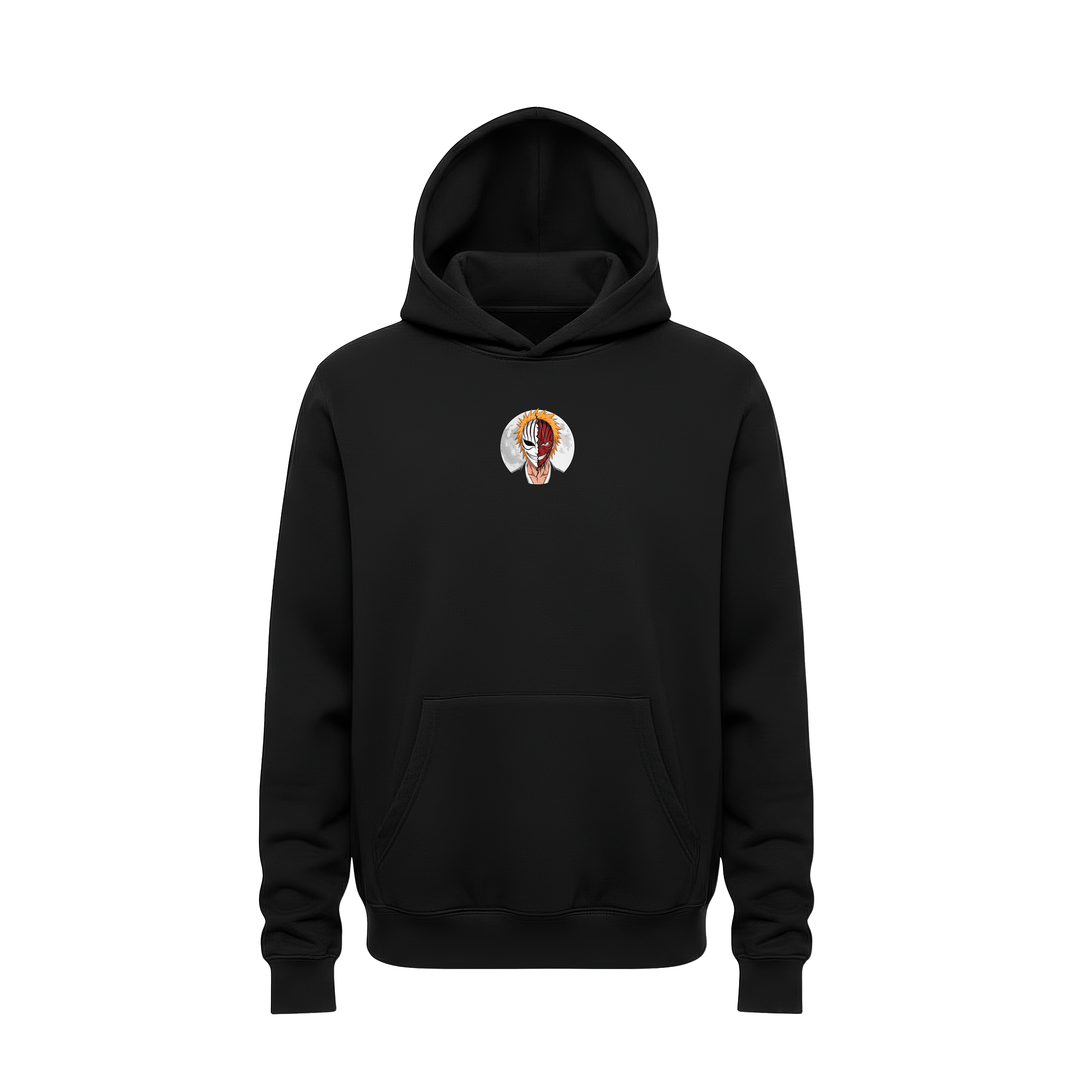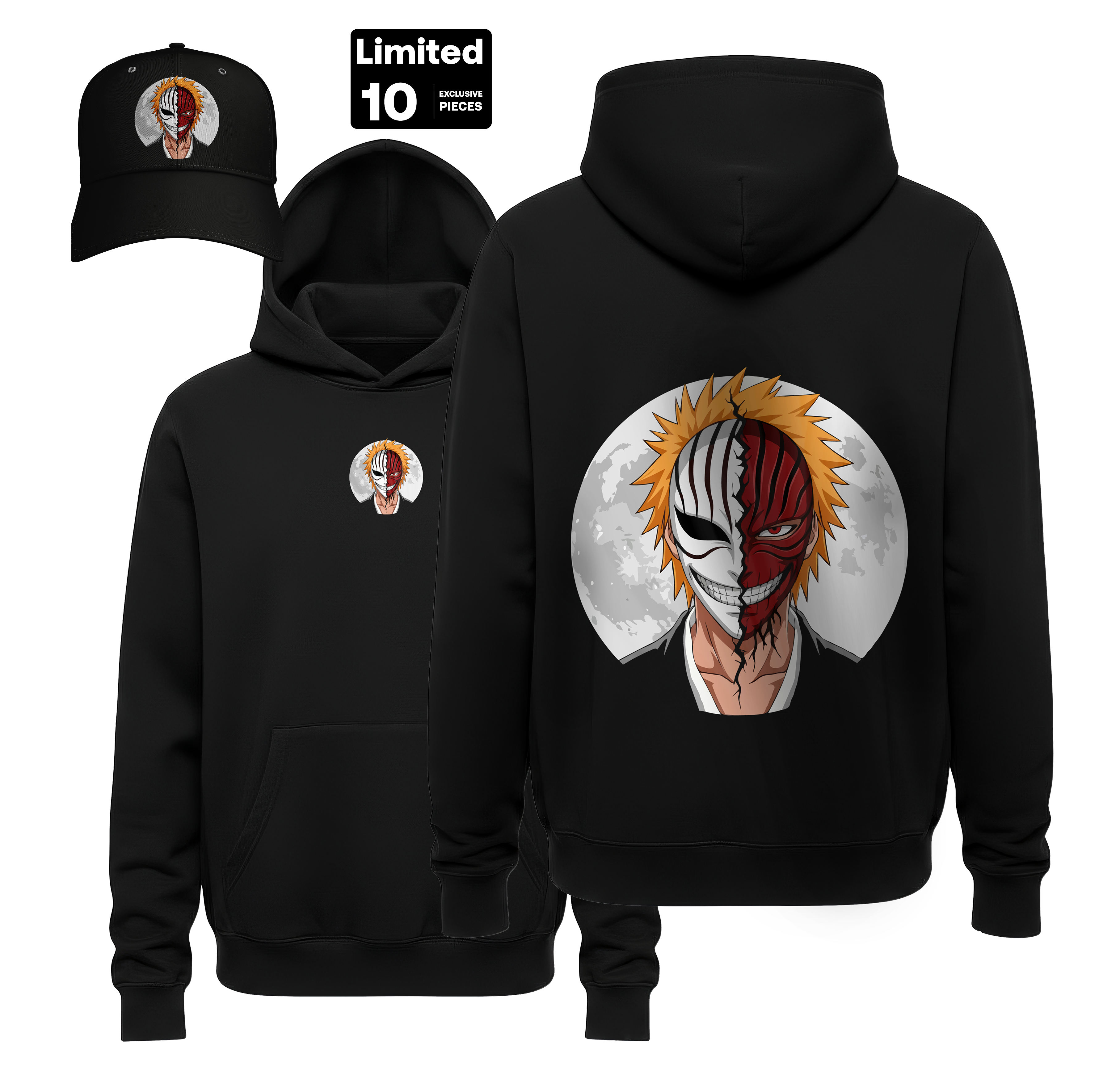 Unleash your inner shinigami with this striking Ichigo Kurosaki “Hollow Smile” hoodie and matching cap set. The back design features a high-impact split-face graphic of Ichigo and his Hollow mask set against a haunting full moon. This limited-edition bundle is the ultimate statement for Bleach fans who embrace the powerful dual nature of the Soul Reaper. Constructed from a premium, heavy-weight fleece blend, this hoodie ensures superior warmth and a soft interior feel for all-day comfort. The vibrant, detailed print uses advanced fade-resistant technology to keep the iconic split-mask artwork sharp and vivid after every wash. Featuring double-stitched seams and a reinforced structured cap, this set is built for long-lasting durability and a perfect, consistent fit.