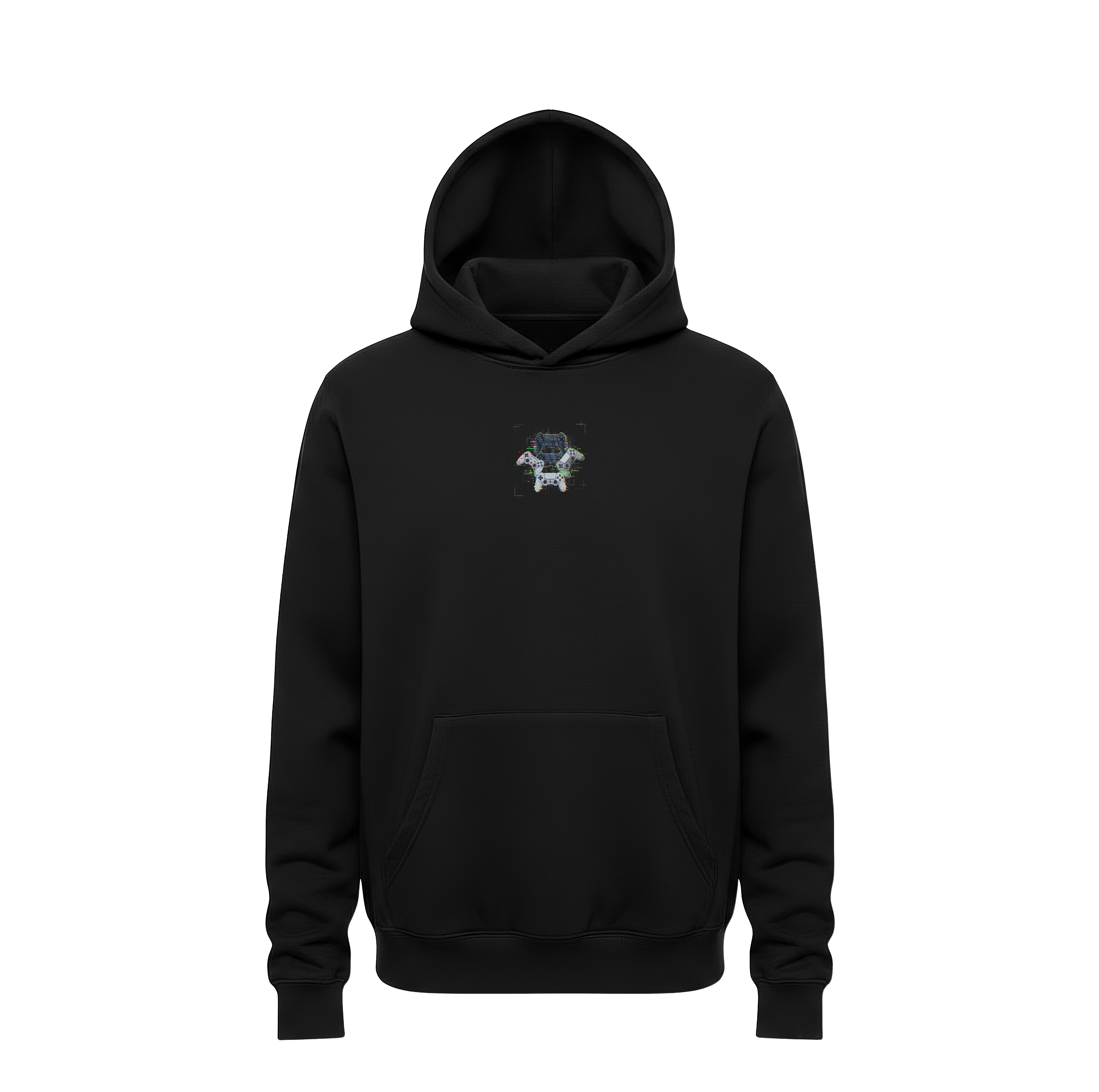 • Minimalist Front Profile: The front of the hoodie maintains a clean, professional gamer look with a miniature glitch-controller icon centered on the chest.