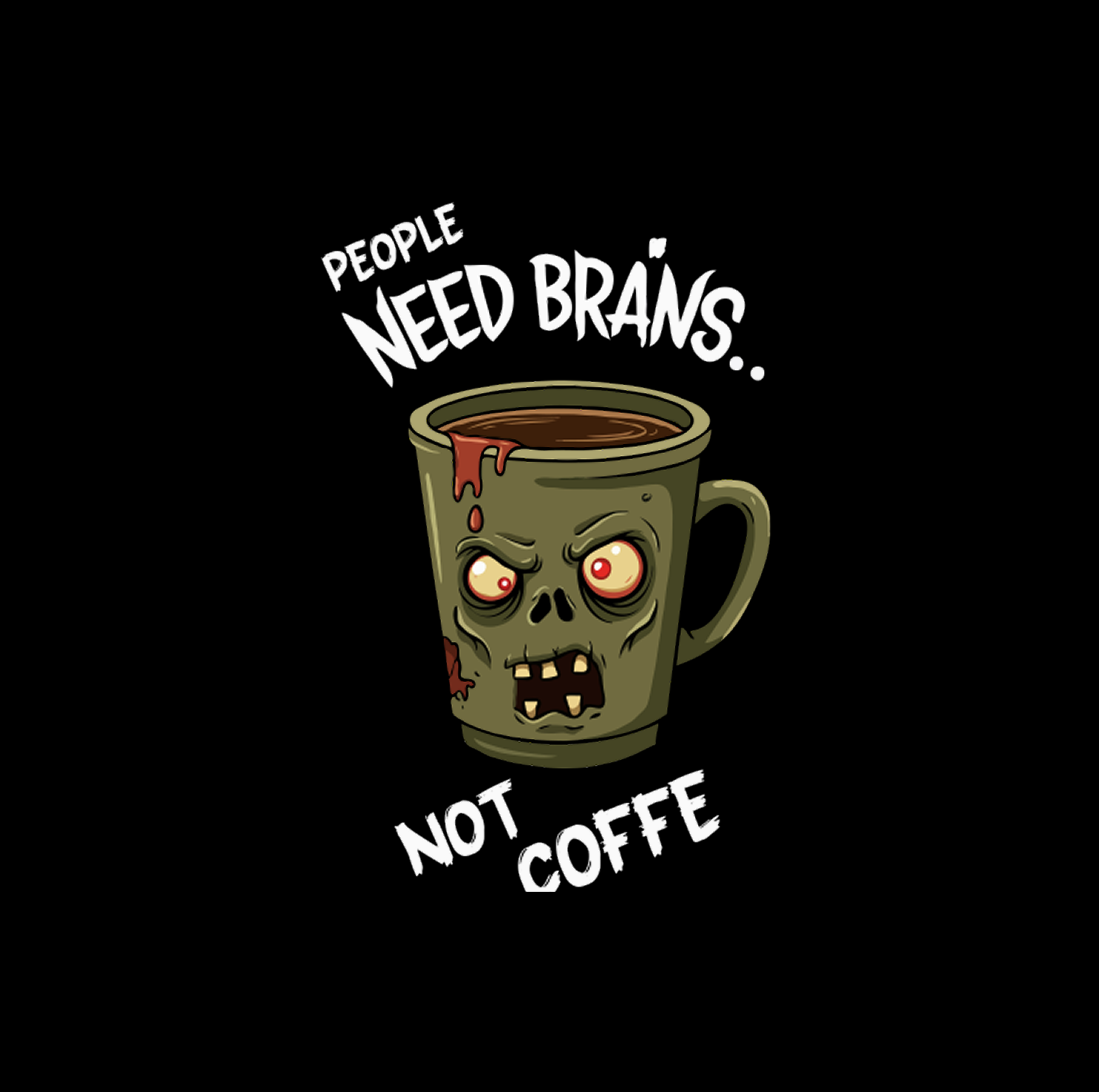 Witty Social Commentary: The artwork is framed by the humorous statement “PEOPLE NEED BRAINS.. NOT COFFEE” rendered in a rugged, distressed white font that adds to the undead aesthetic.