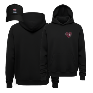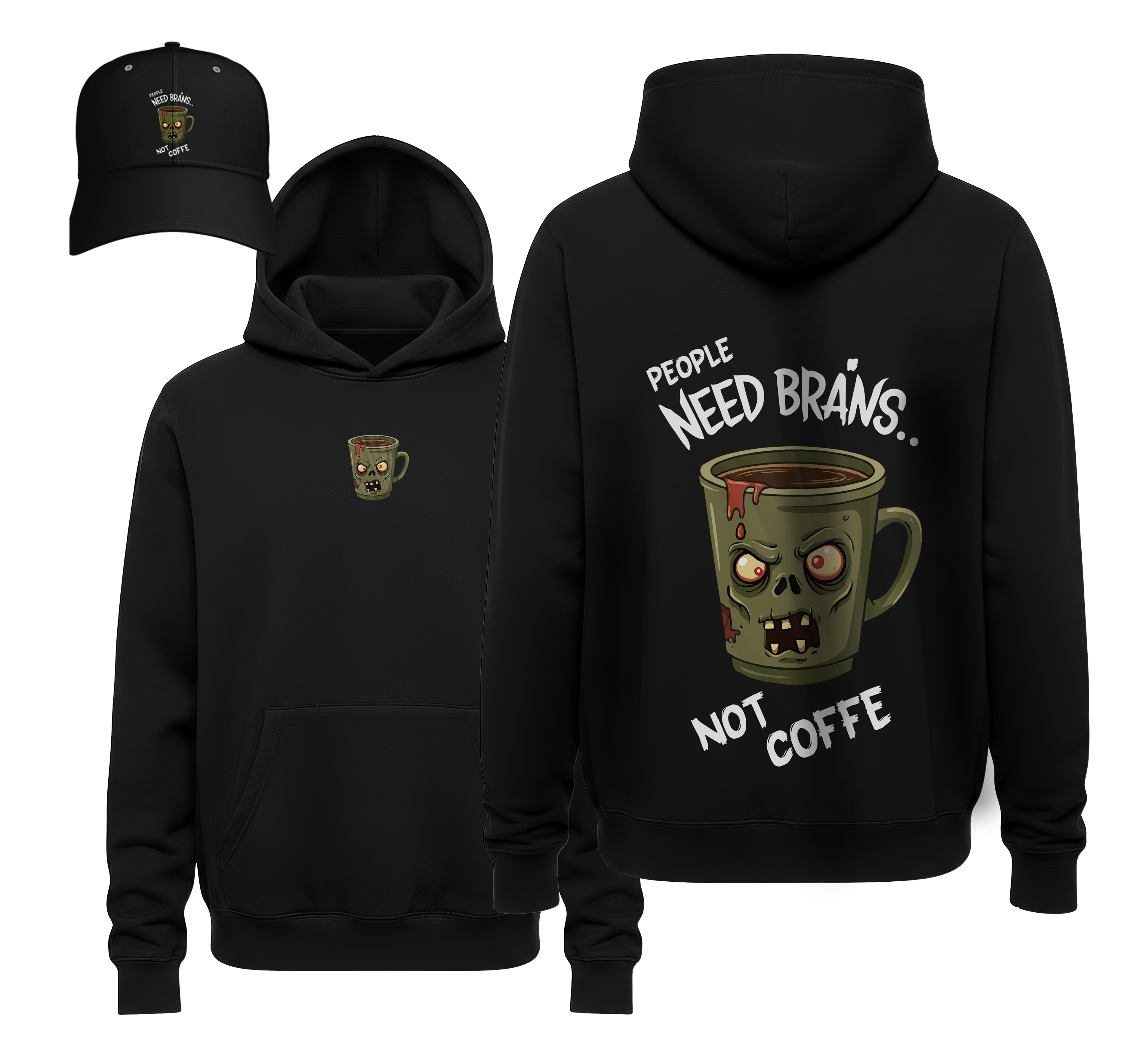 Coordinated Streetwear: This bundle includes a luxury heavyweight black hoodie and a matching structured cap, both featuring the striking zombie-mug graphic for a unified, edgy look.