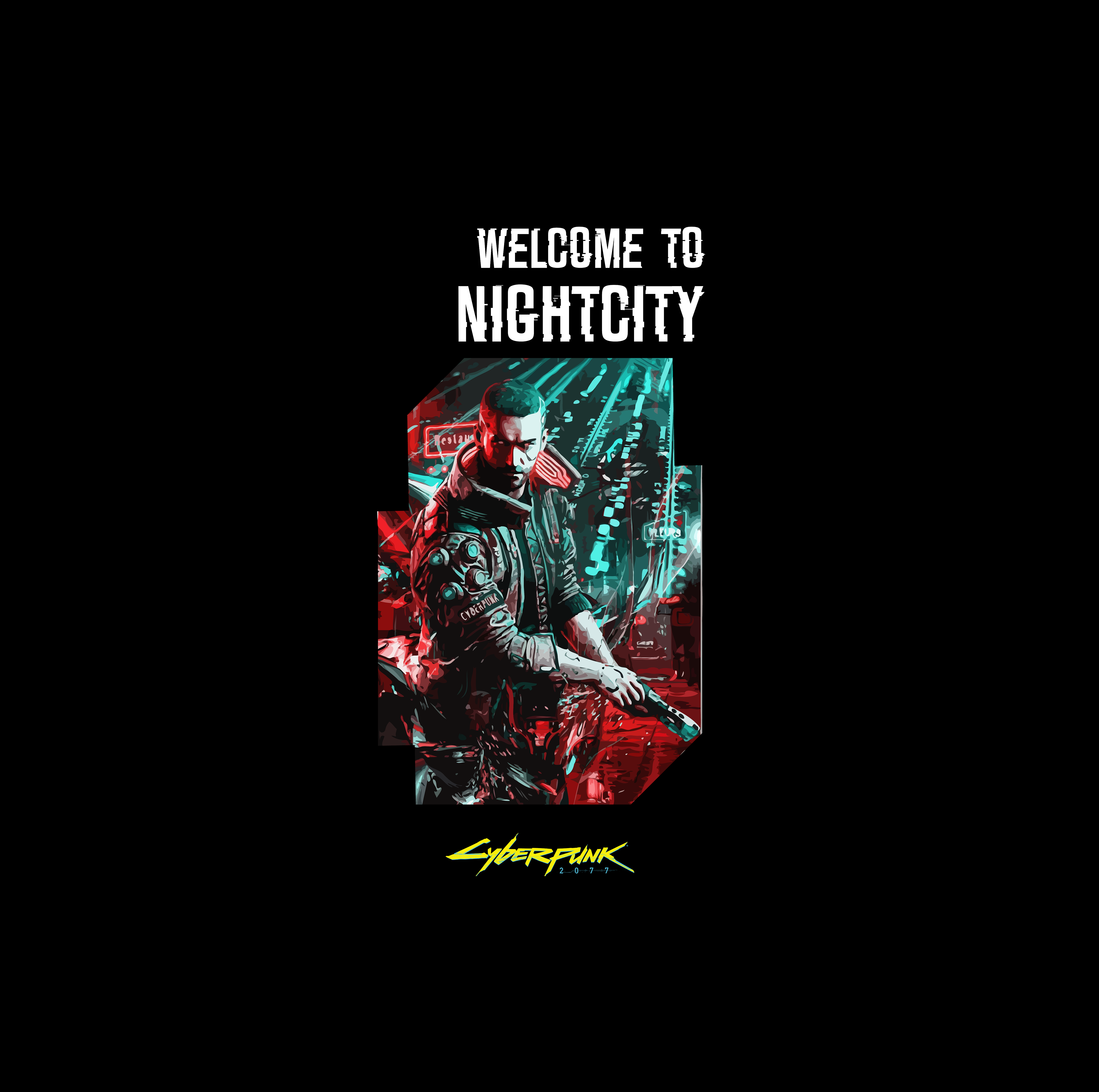 • Nightcity Branding: The design is anchored by the bold, industrial heading “WELCOME TO NIGHTCITY” in a clean, high-contrast white font.
