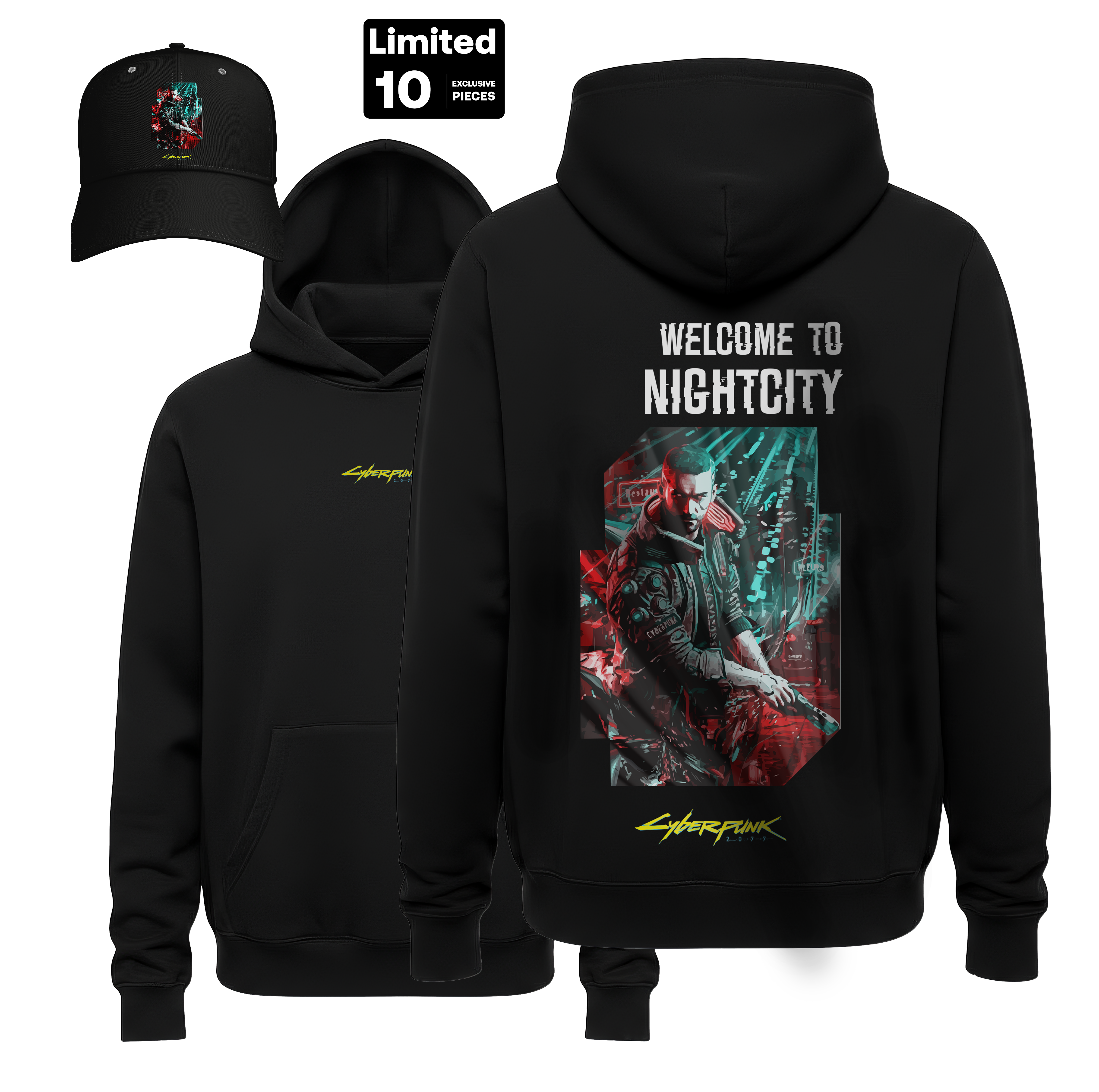 • Official Cyberpunk Identity: The iconic bright yellow Cyberpunk 2077 logo is featured on the back, the front chest, and the matching structured cap for a unified look.