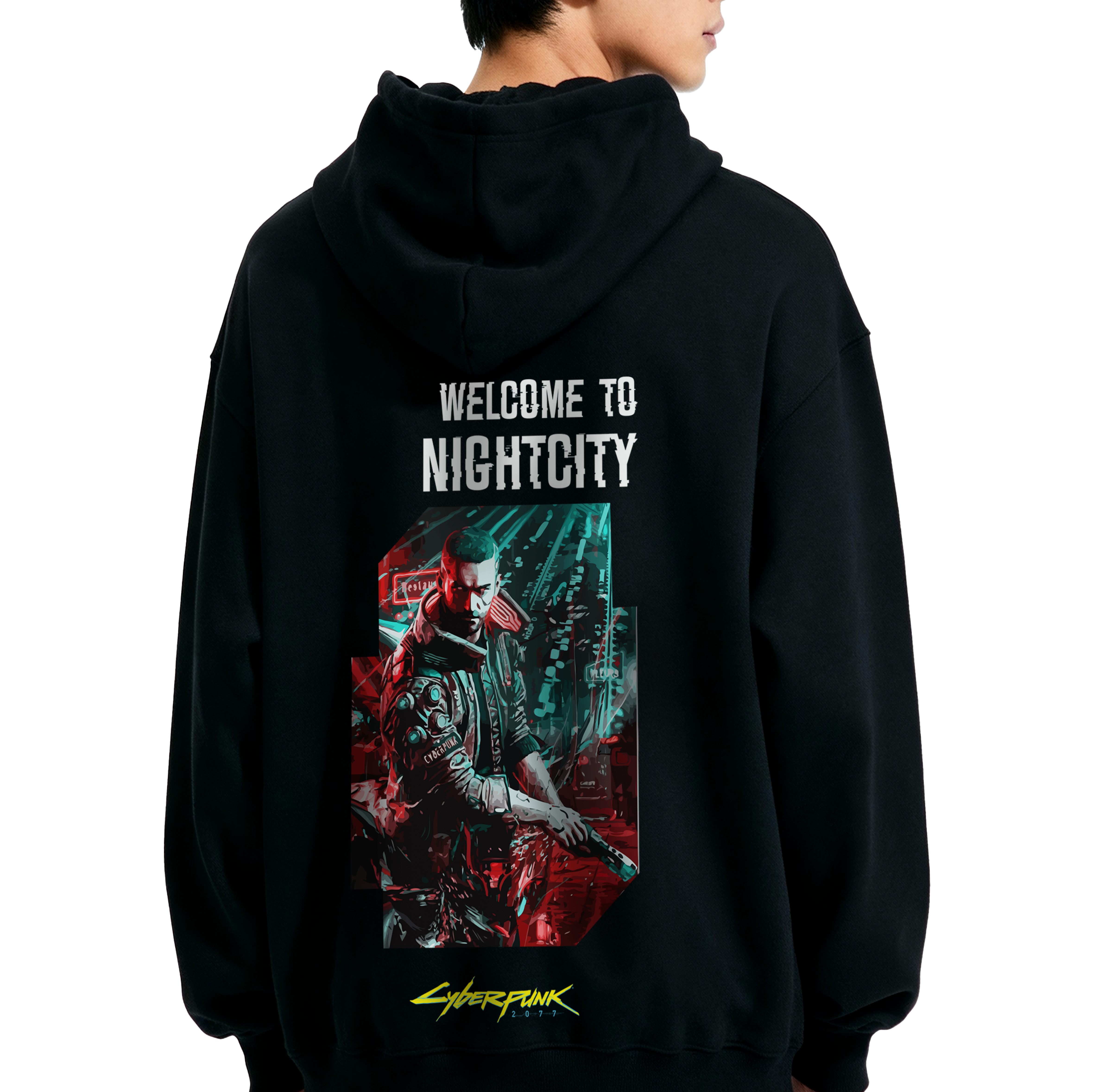 • Cinematic Mercenary Graphic: The back features a high-definition, stylized illustration of a Cyberpunk operator bathed in the neon red and cyan hues of the city’s nightlife.