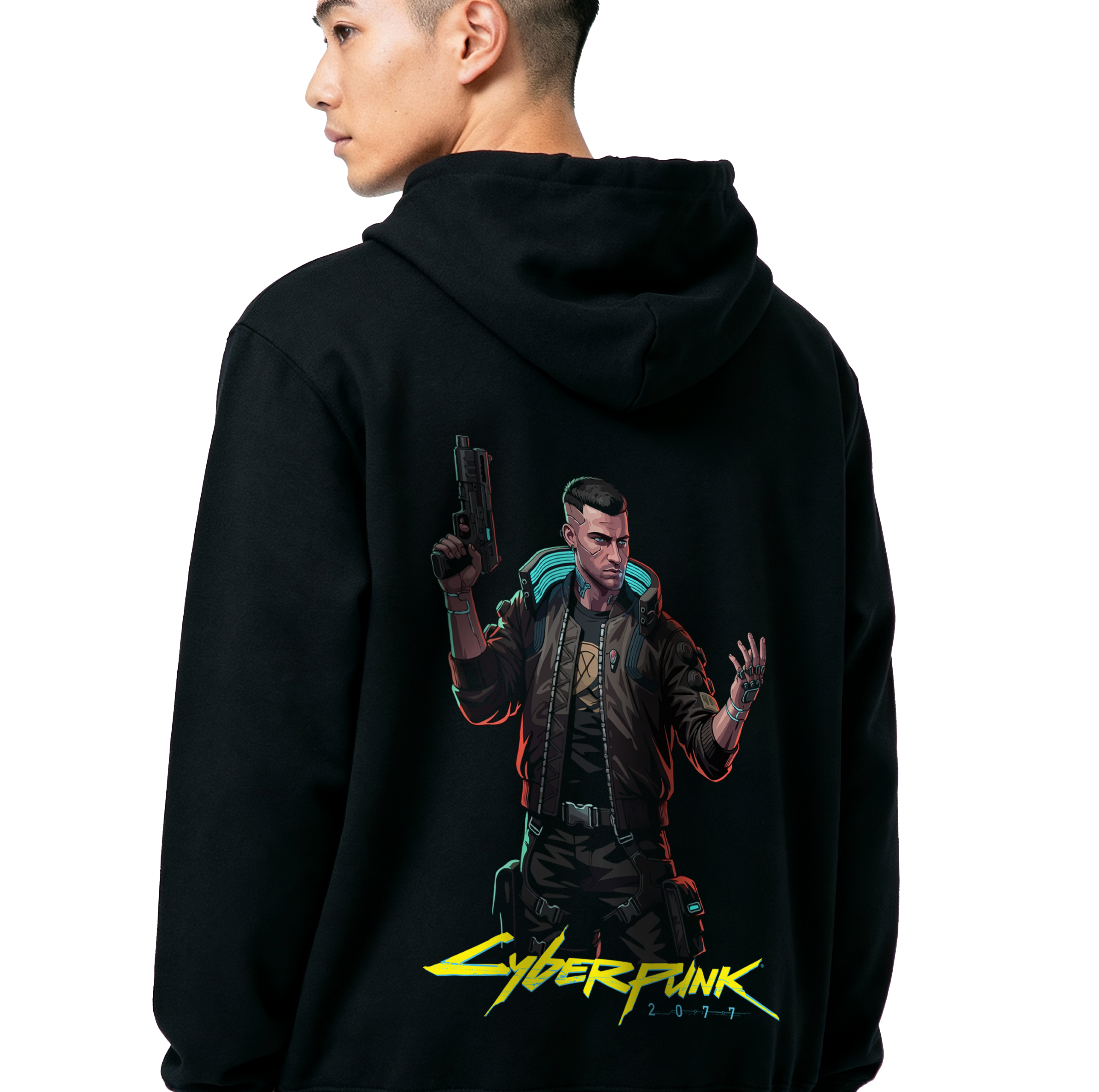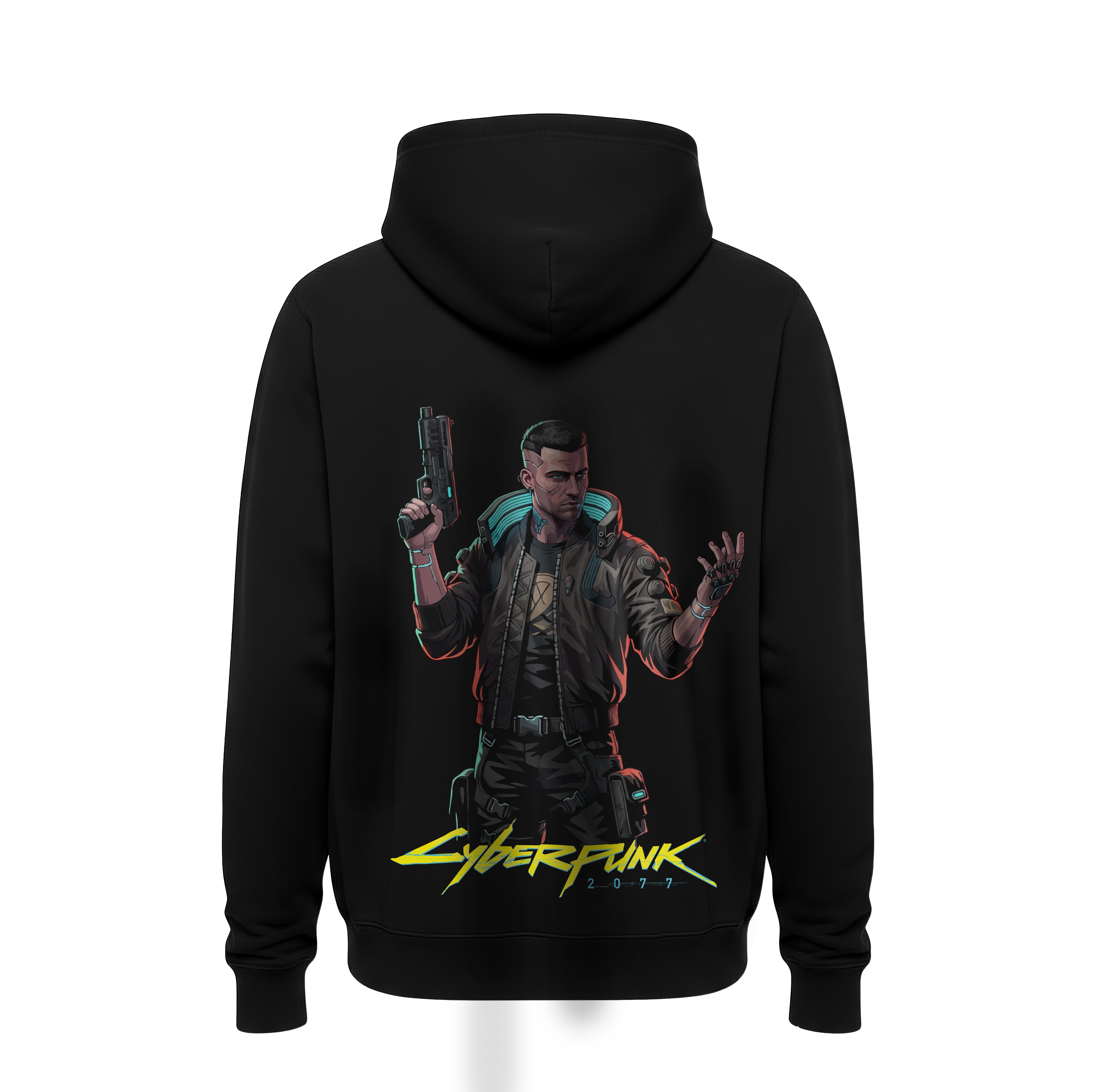 Signature Mercenary Graphic: The back showcases a high-definition, stylized illustration of V in his iconic LED-collared bomber jacket, armed and ready for a job in the corporate underworld.