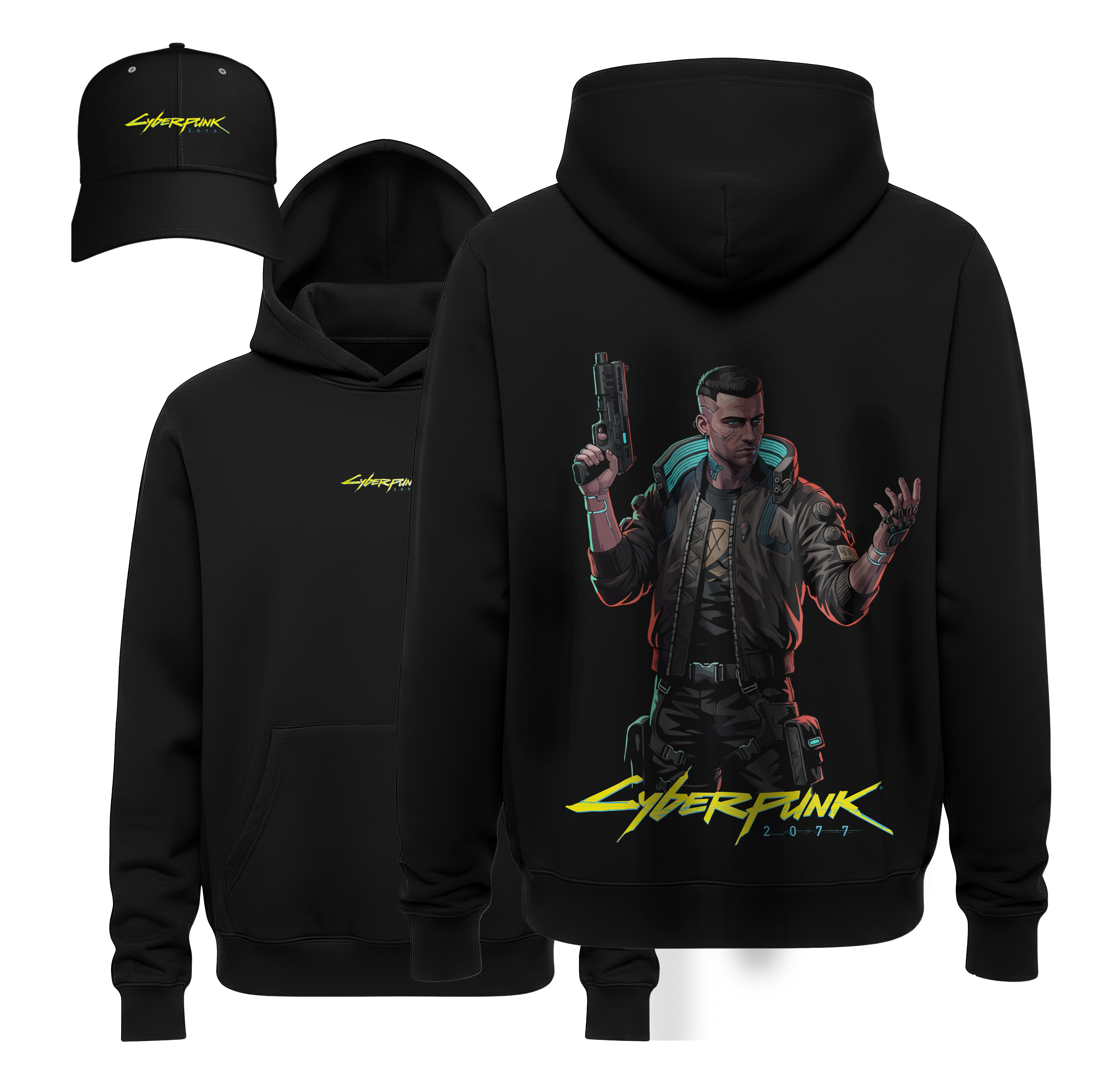 Coordinated Tech-Wear: This bundle includes a luxury heavyweight black hoodie and a matching structured cap, both featuring the official yellow branding for a unified, futuristic aesthetic.