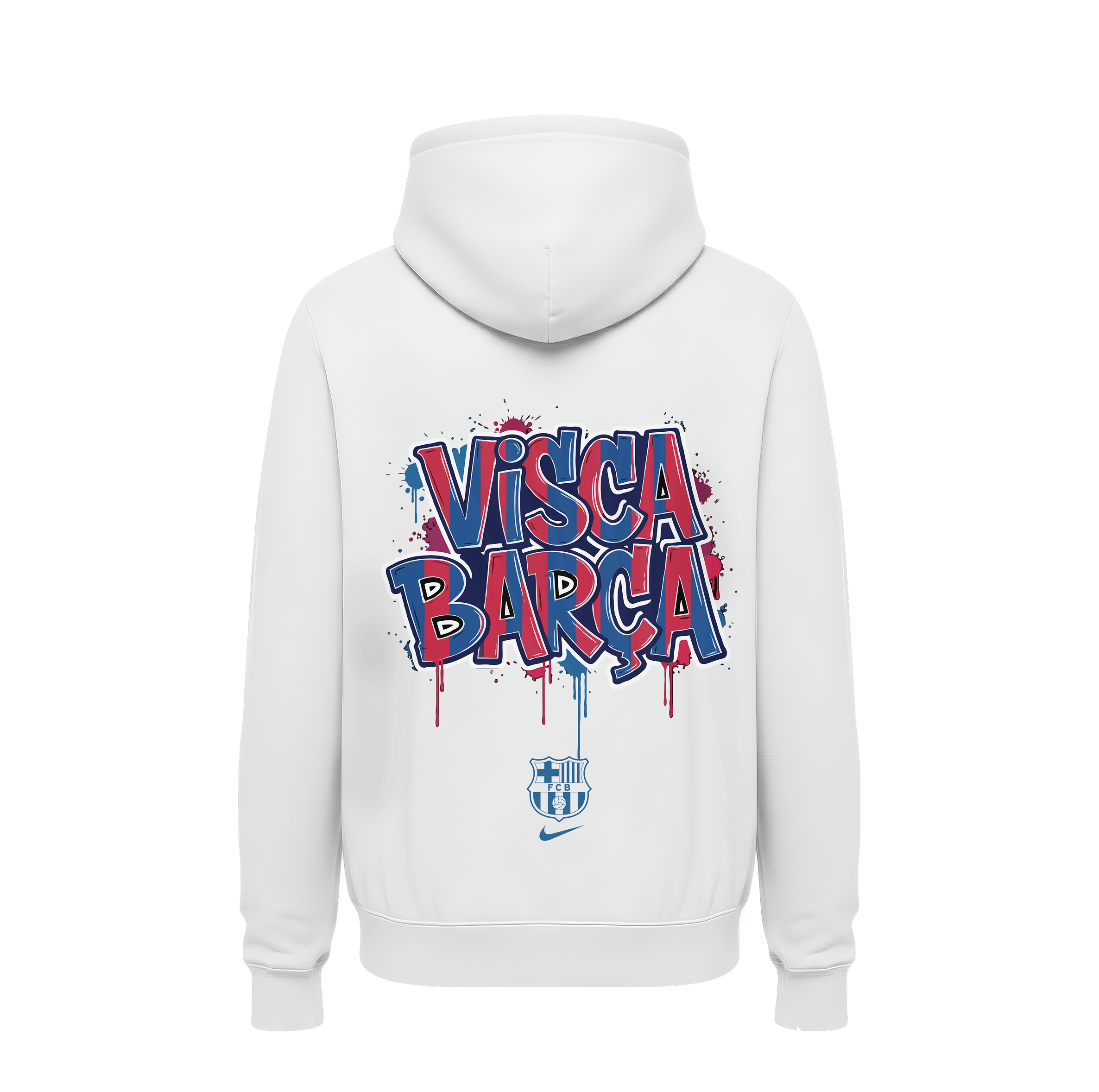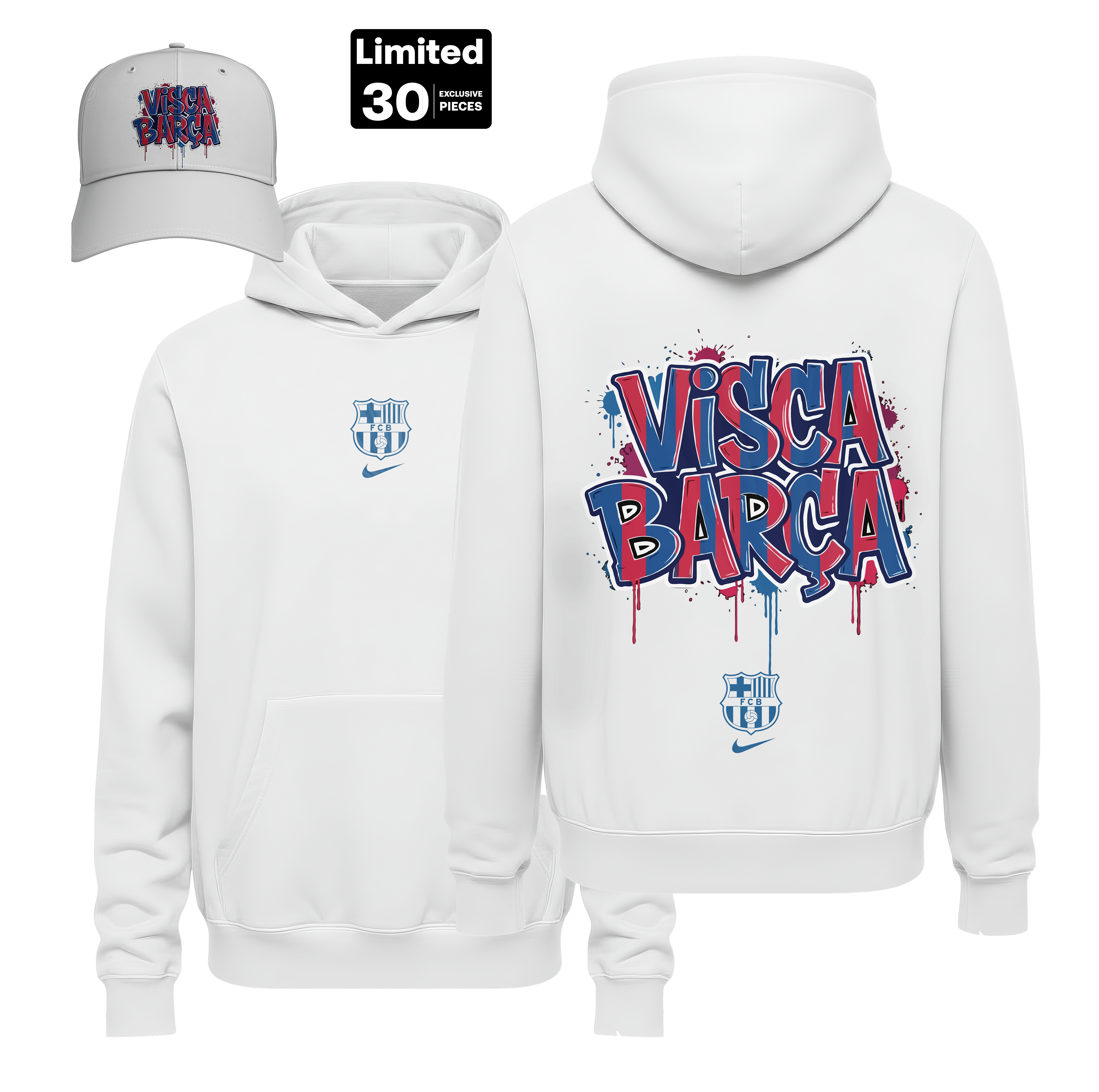 Coordinated Streetwear: The set includes a premium hoodie and a matching white structured cap, both featuring the stylized “Visca Barça” graffiti tag for a unified look.