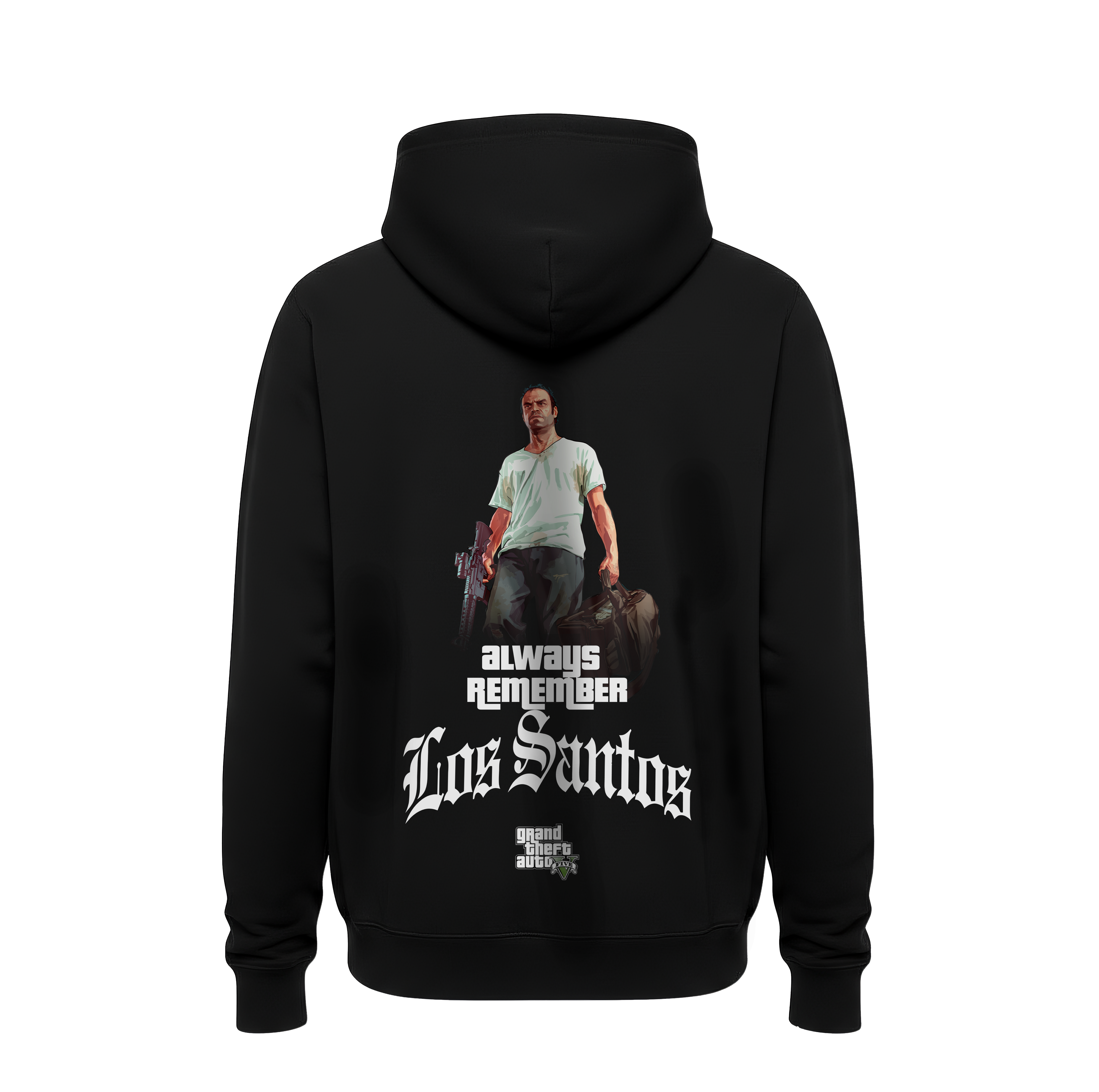 Minimalist Front Profile: The hoodie maintains a sleek, professional look from the front with a small-scale “Los Santos” Gothic script placed subtly on the chest.