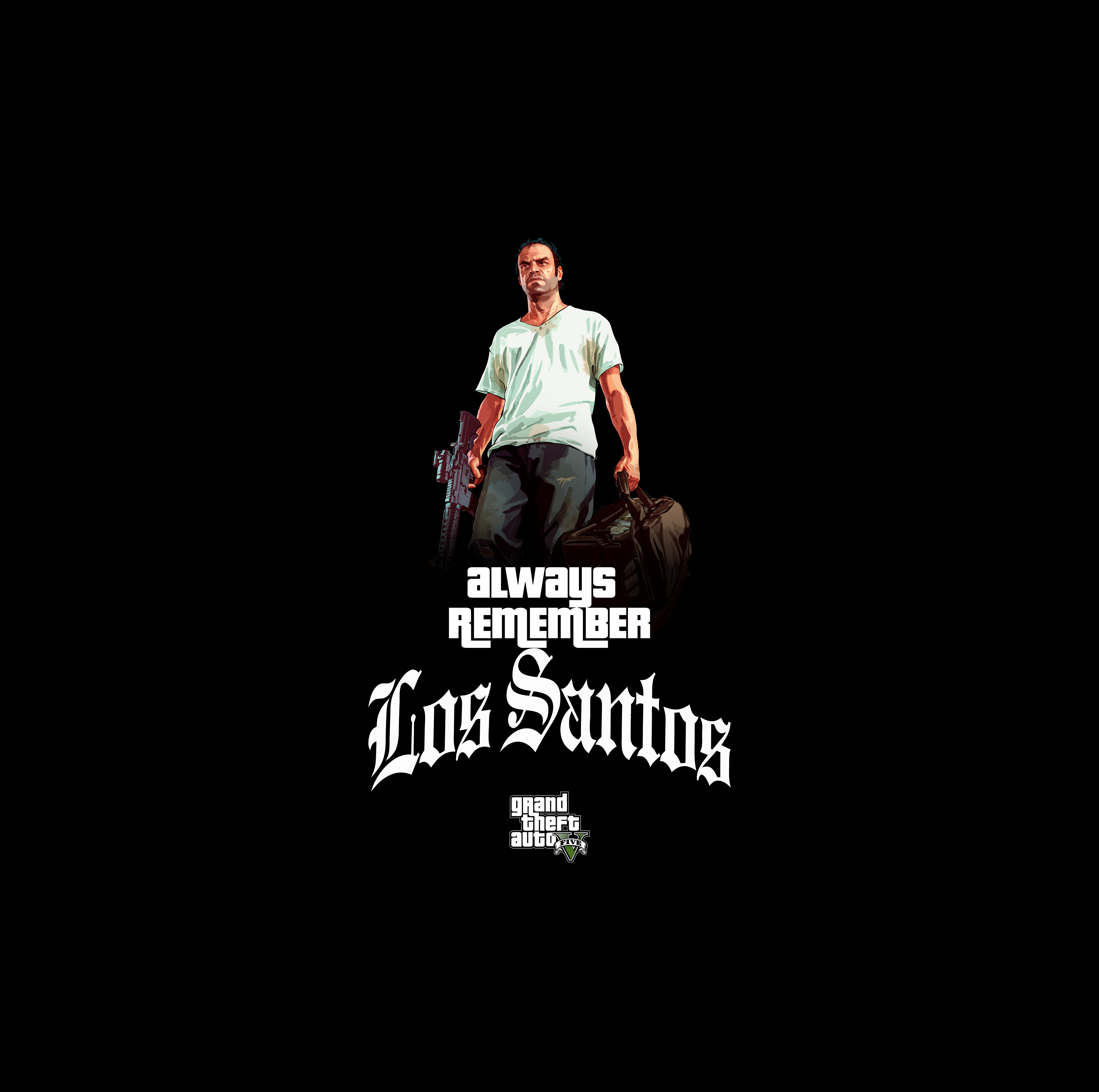 Gothic Typography: The design is anchored by the powerful statement “ALWAYS REMEMBER Los Santos” rendered in an elegant, bold white Gothic font.