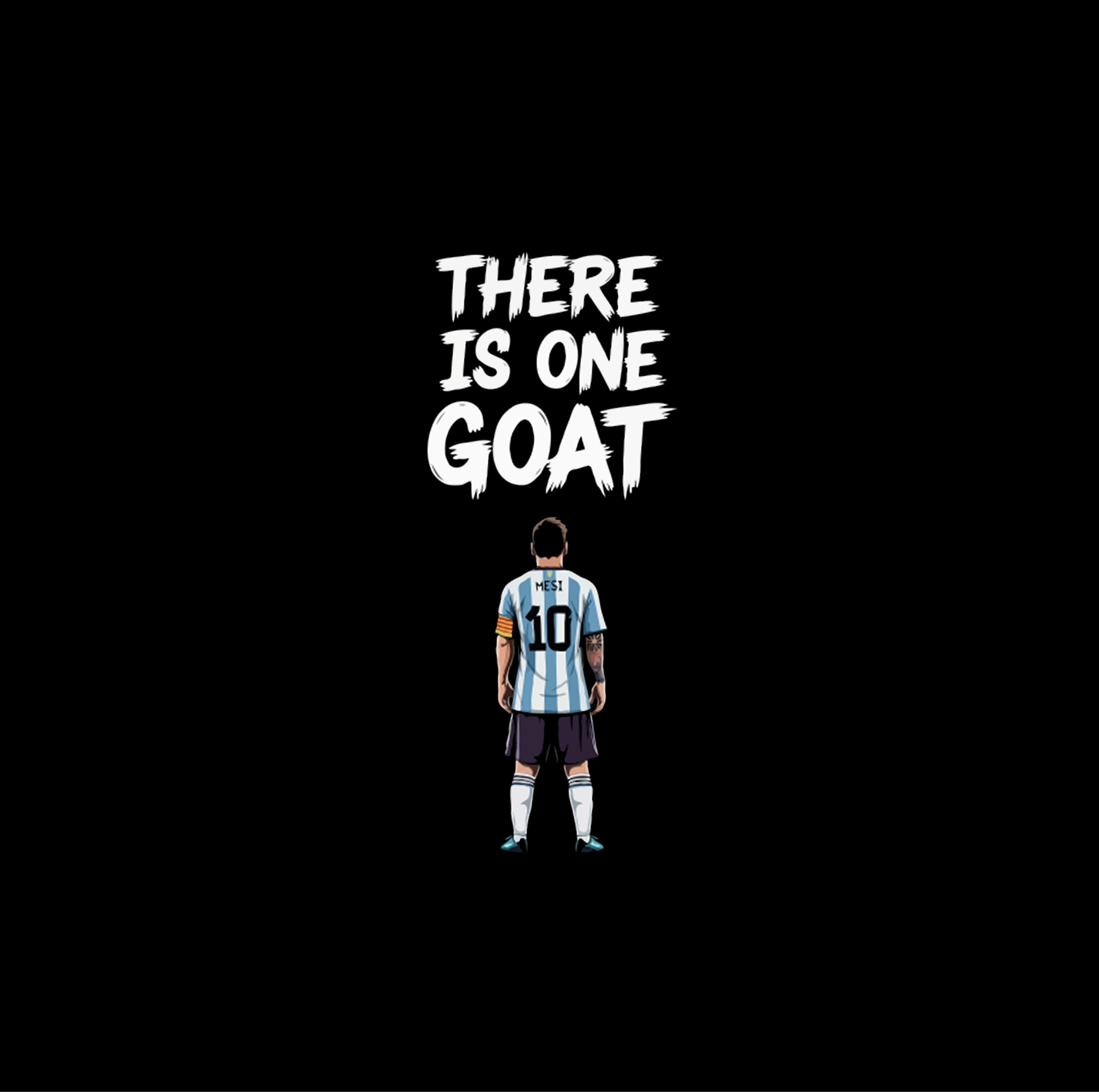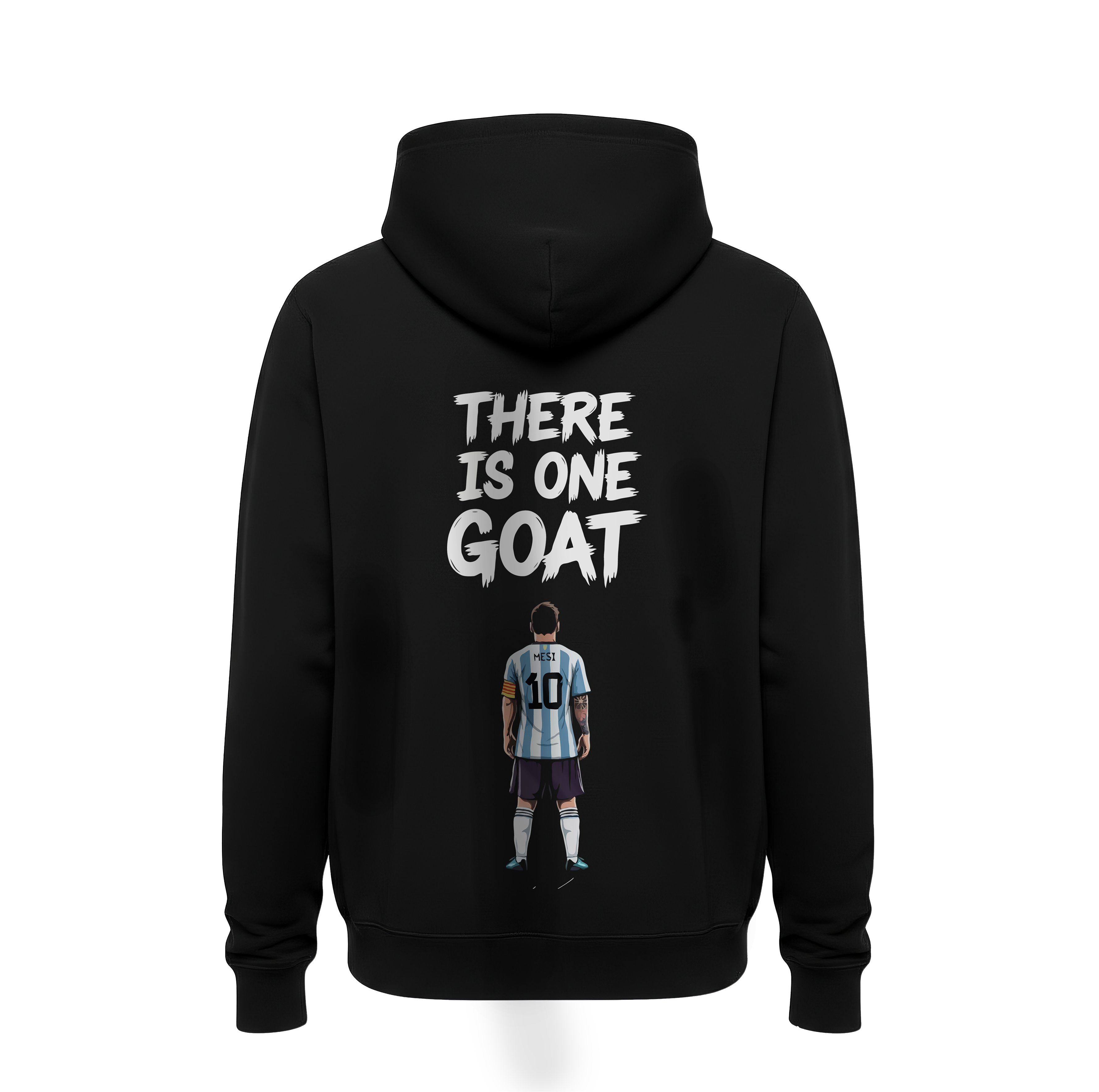 Bold Iconic Branding: The design is crowned with the defiant slogan “THERE IS ONE GOAT” in a striking, distressed white typography that stands out against the premium black fabric.