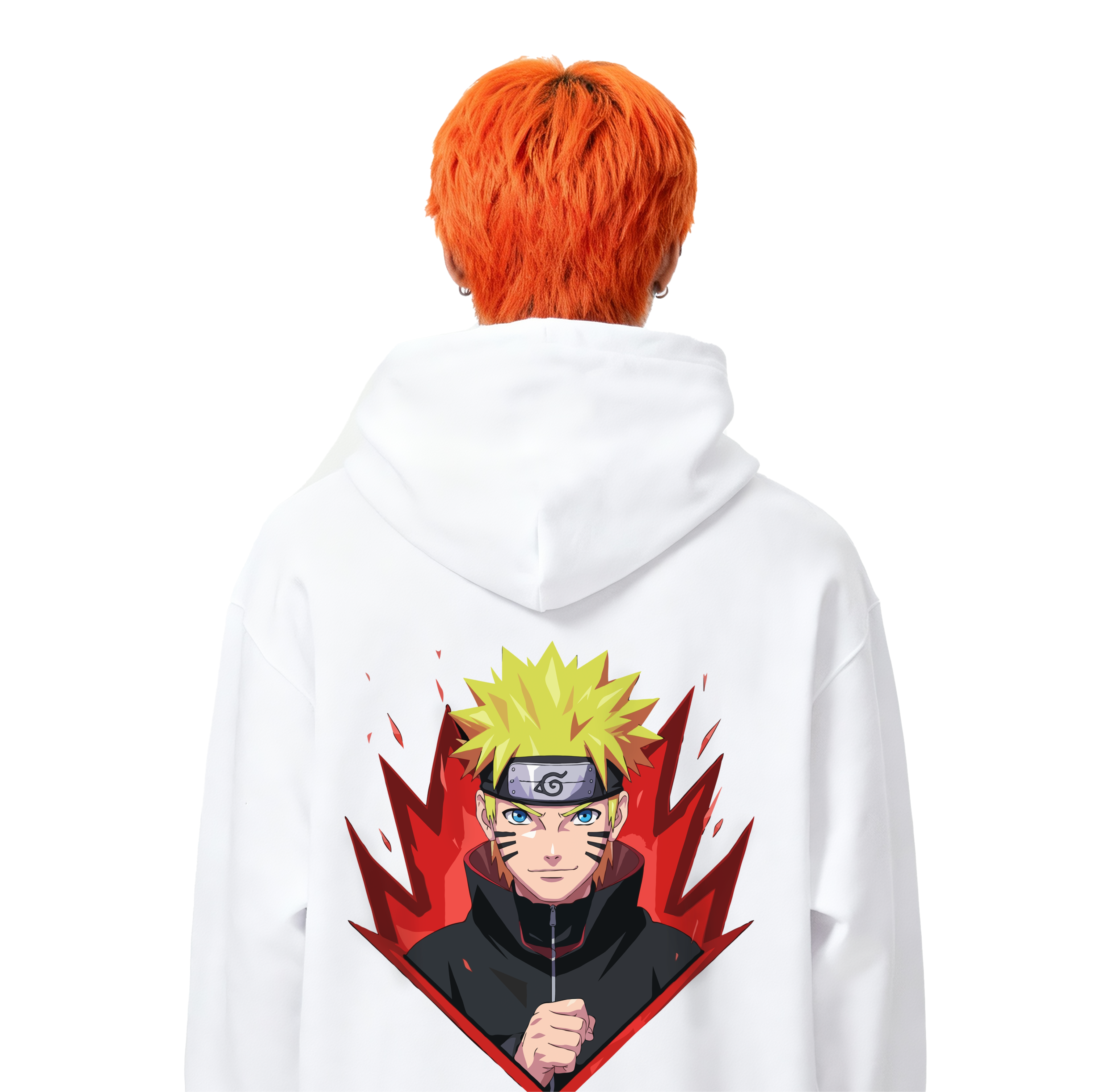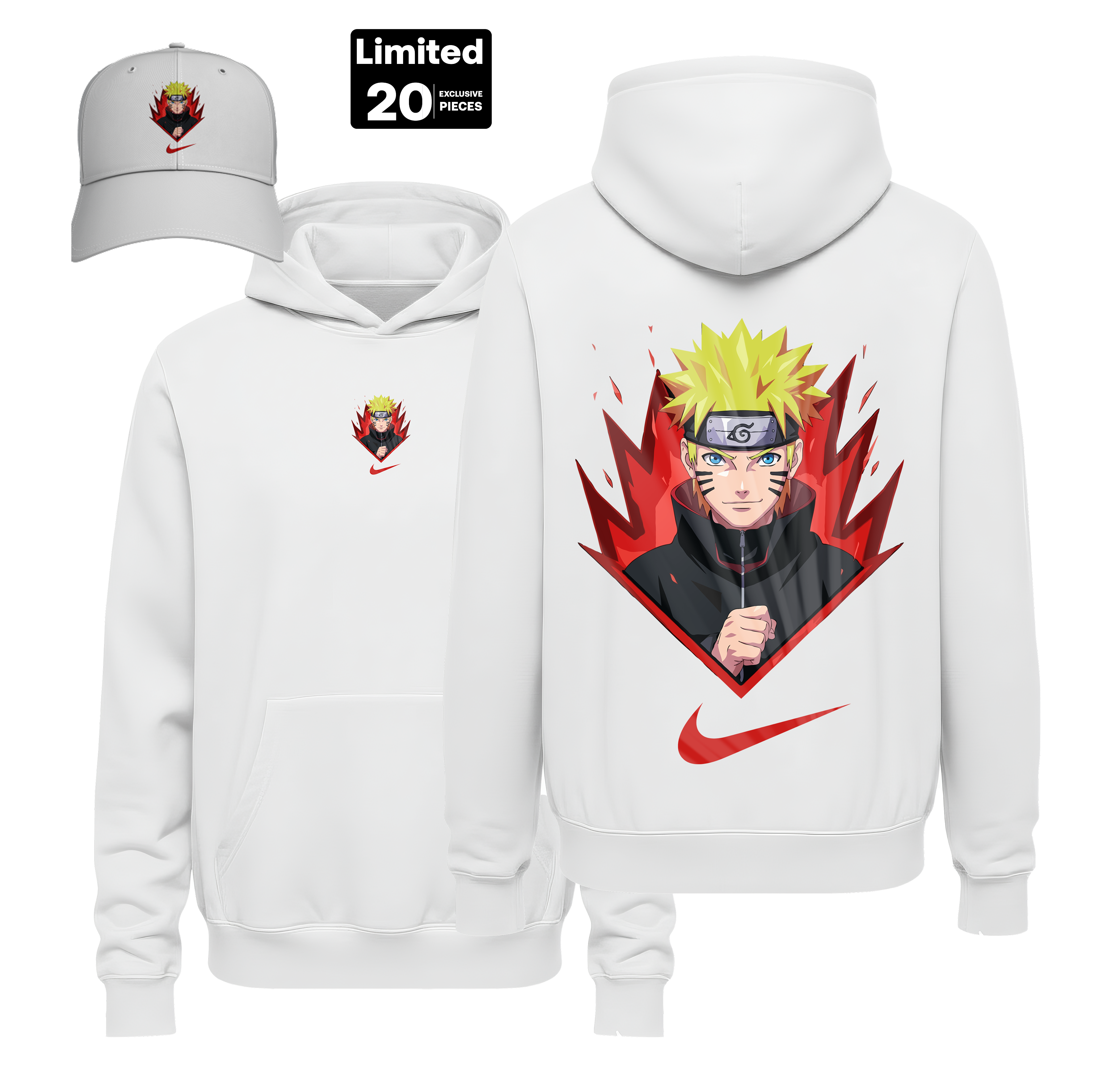 the spirit of the Hidden Leaf with urban athletics in this exclusive white hoodie and cap set featuring Naruto against a sharp, crimson-flame geometric backdrop. This high-energy collaboration aesthetic brings the “Will of Fire” to life, creating a modern streetwear essential for fans who demand both power and style.