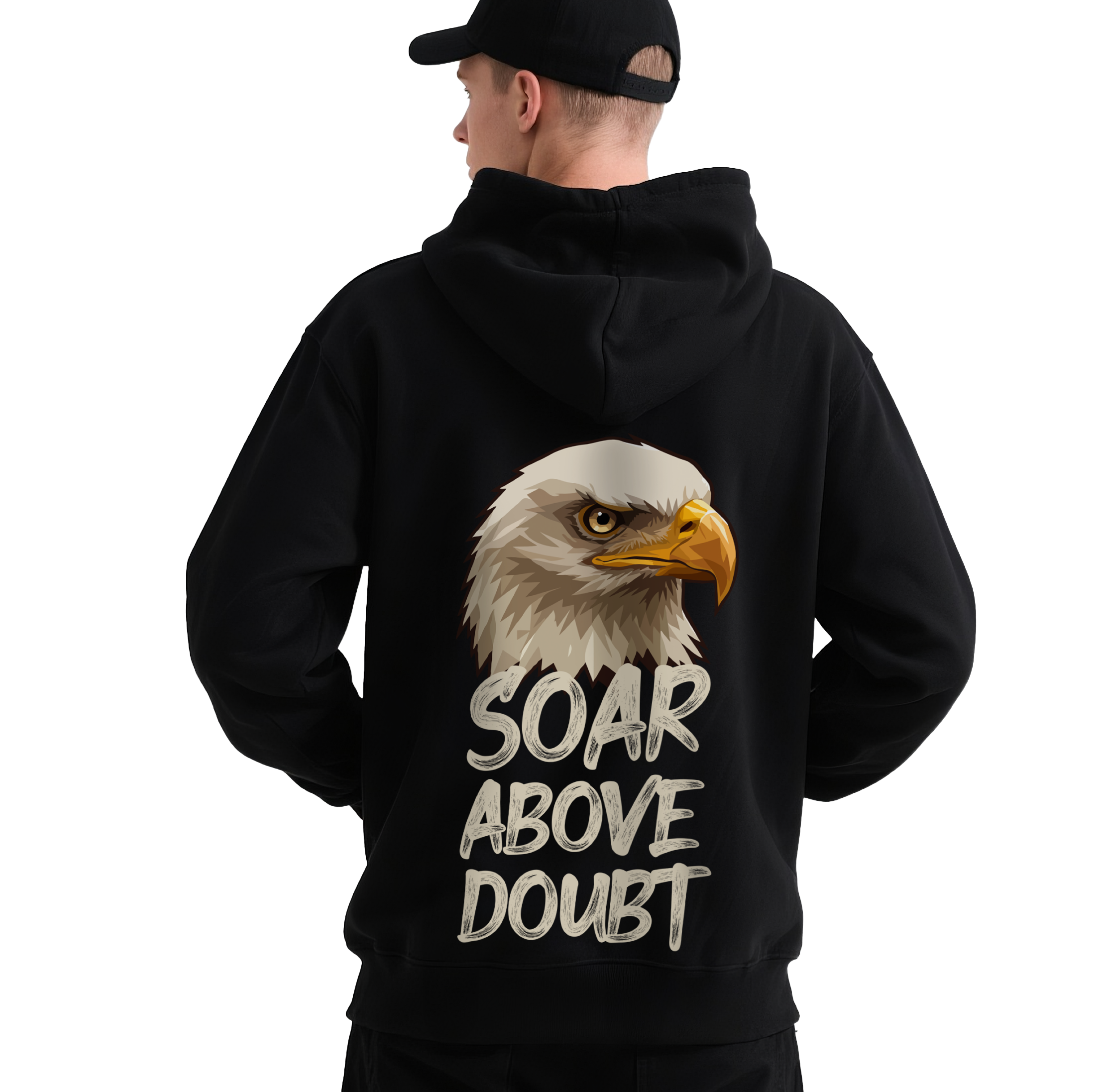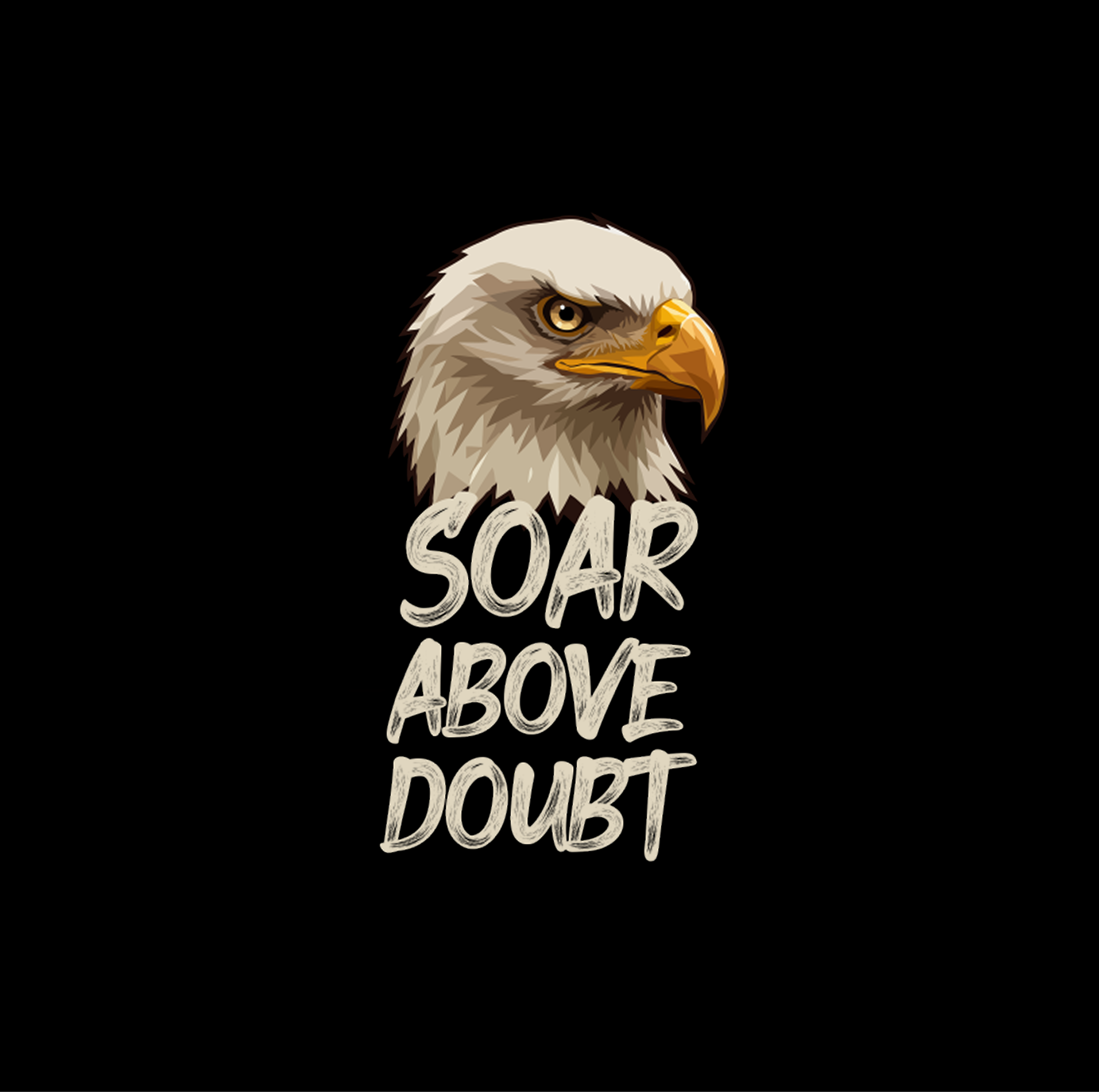 Empowering Bold Creed: The artwork is anchored by the motivational command “SOAR ABOVE DOUBT” rendered in a rugged, bone-colored distressed font.