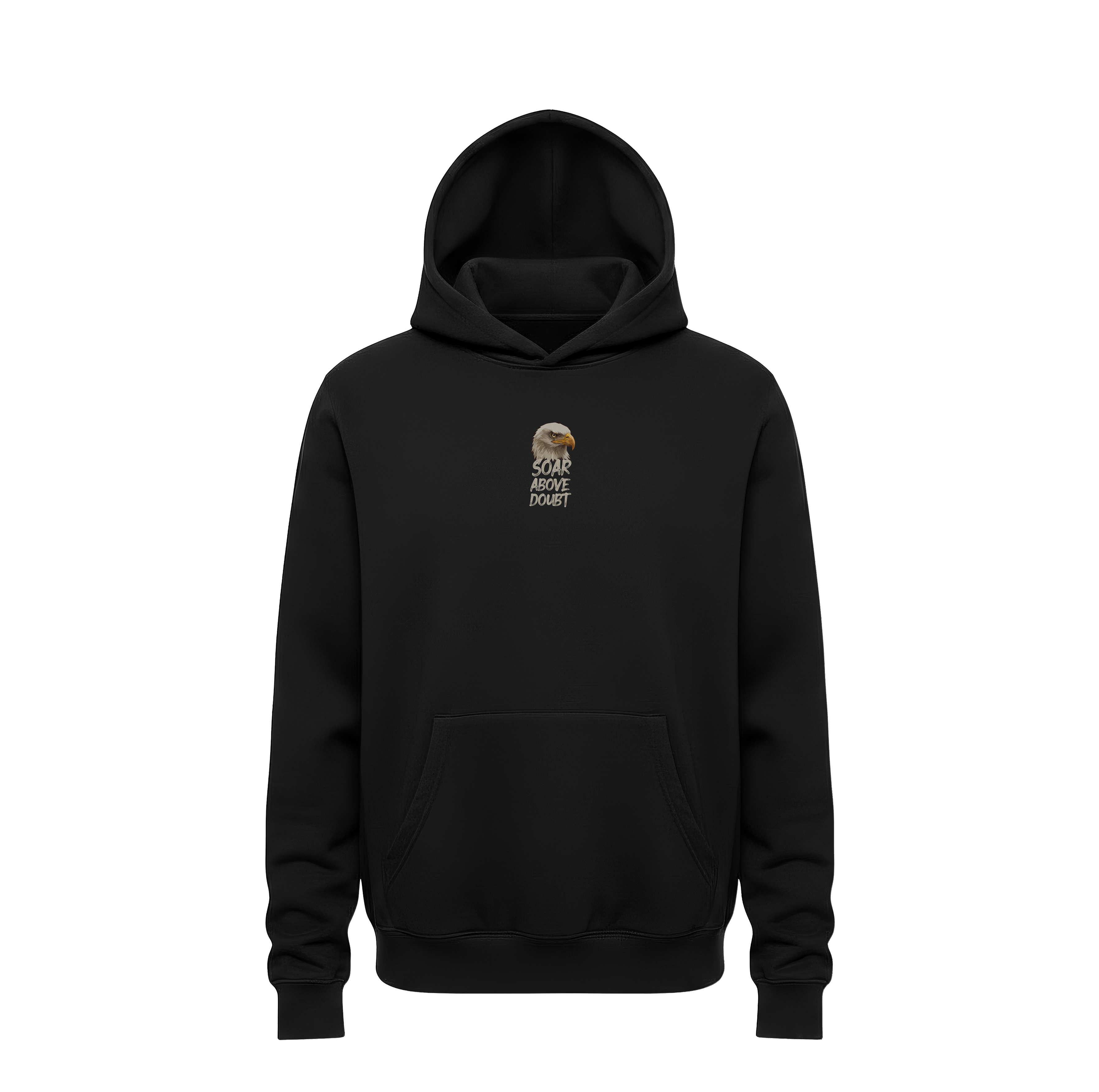 Minimalist Front Profile: The hoodie maintains a sleek, intentional look from the front with a miniature version of the eagle head and creed placed subtly on the chest.
