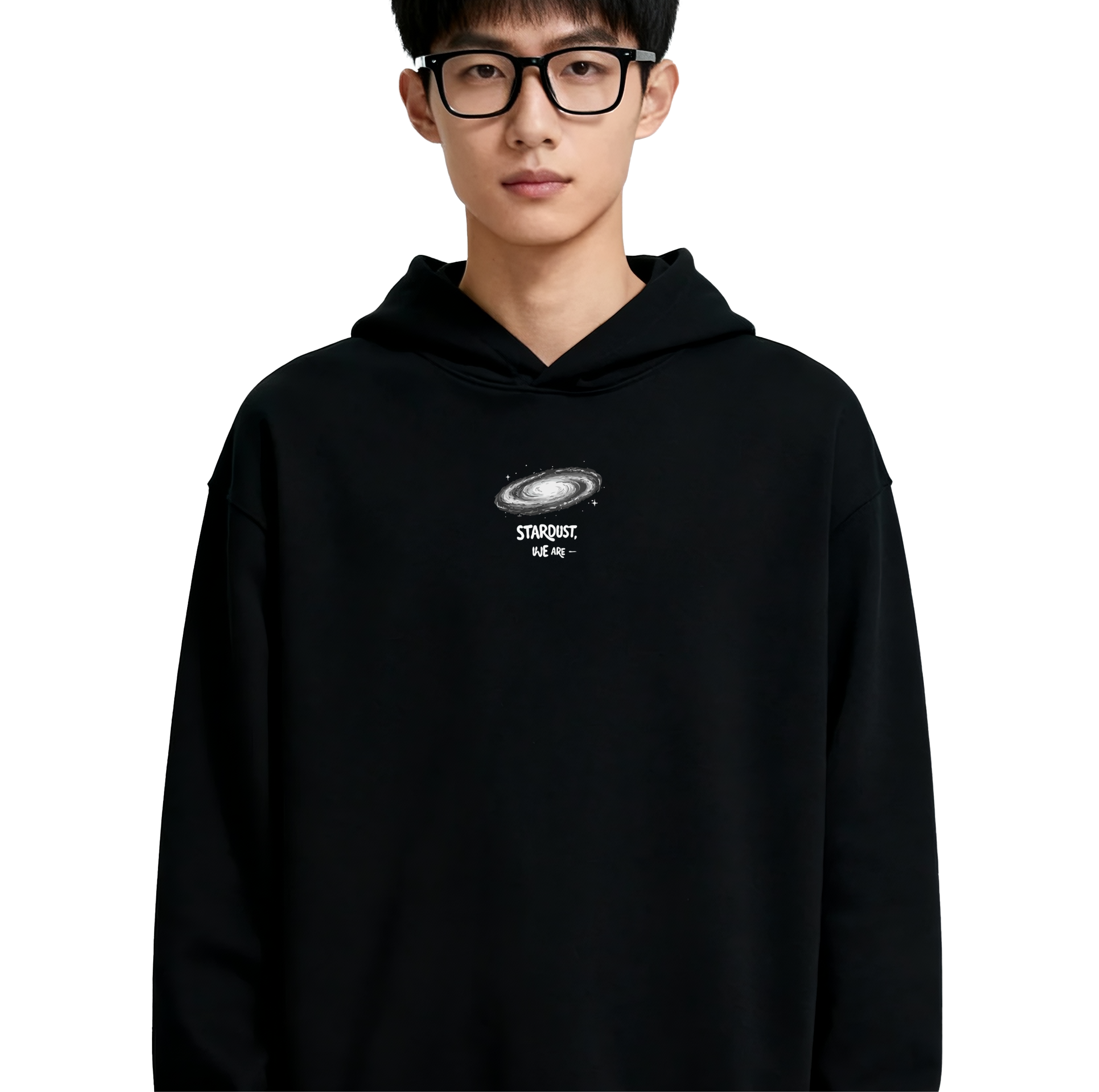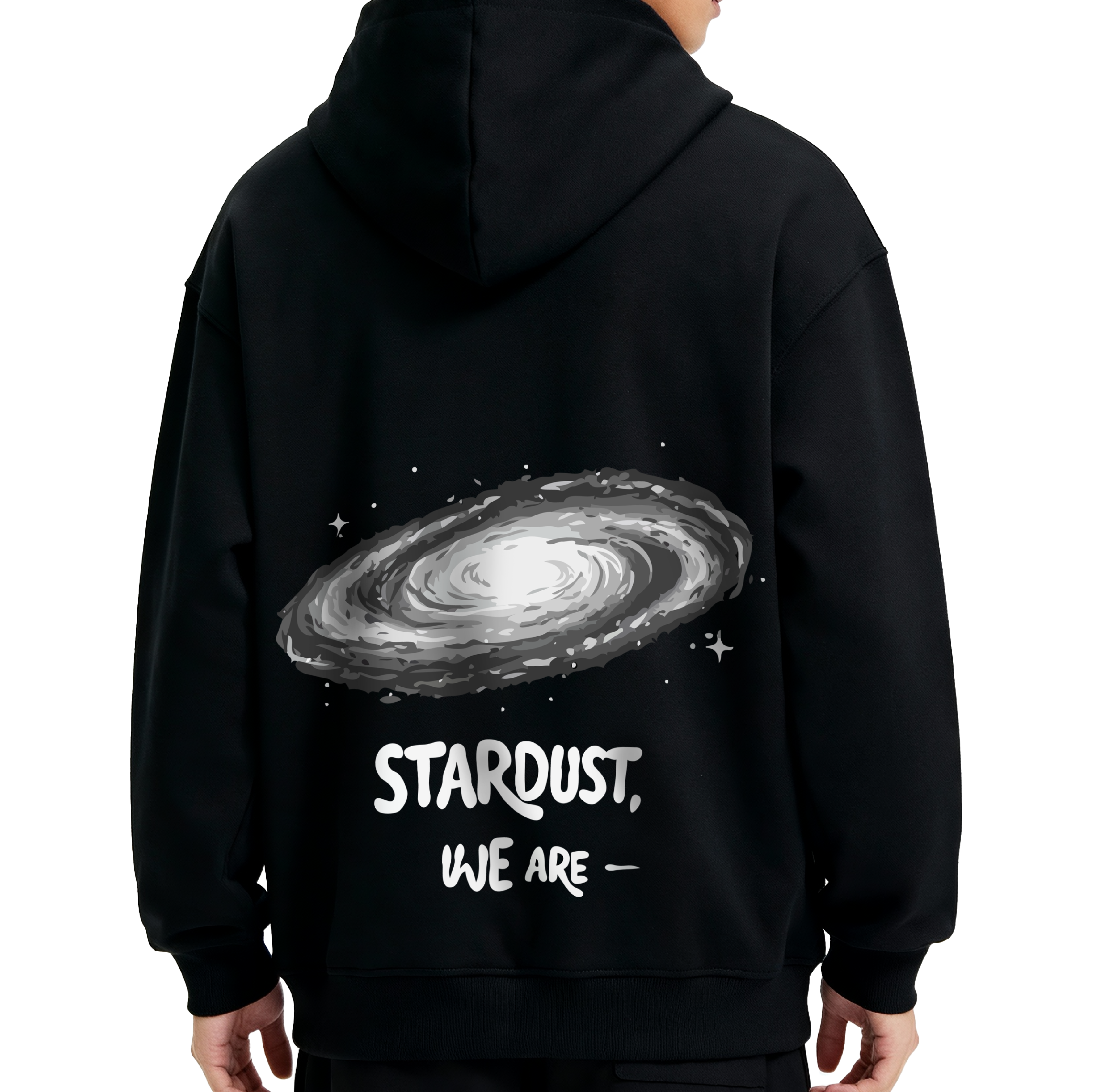 • Minimalist Front Profile: The hoodie maintains a sleek, professional look from the front with a miniature version of the spiral galaxy and the “Stardust” text placed subtly on the chest.