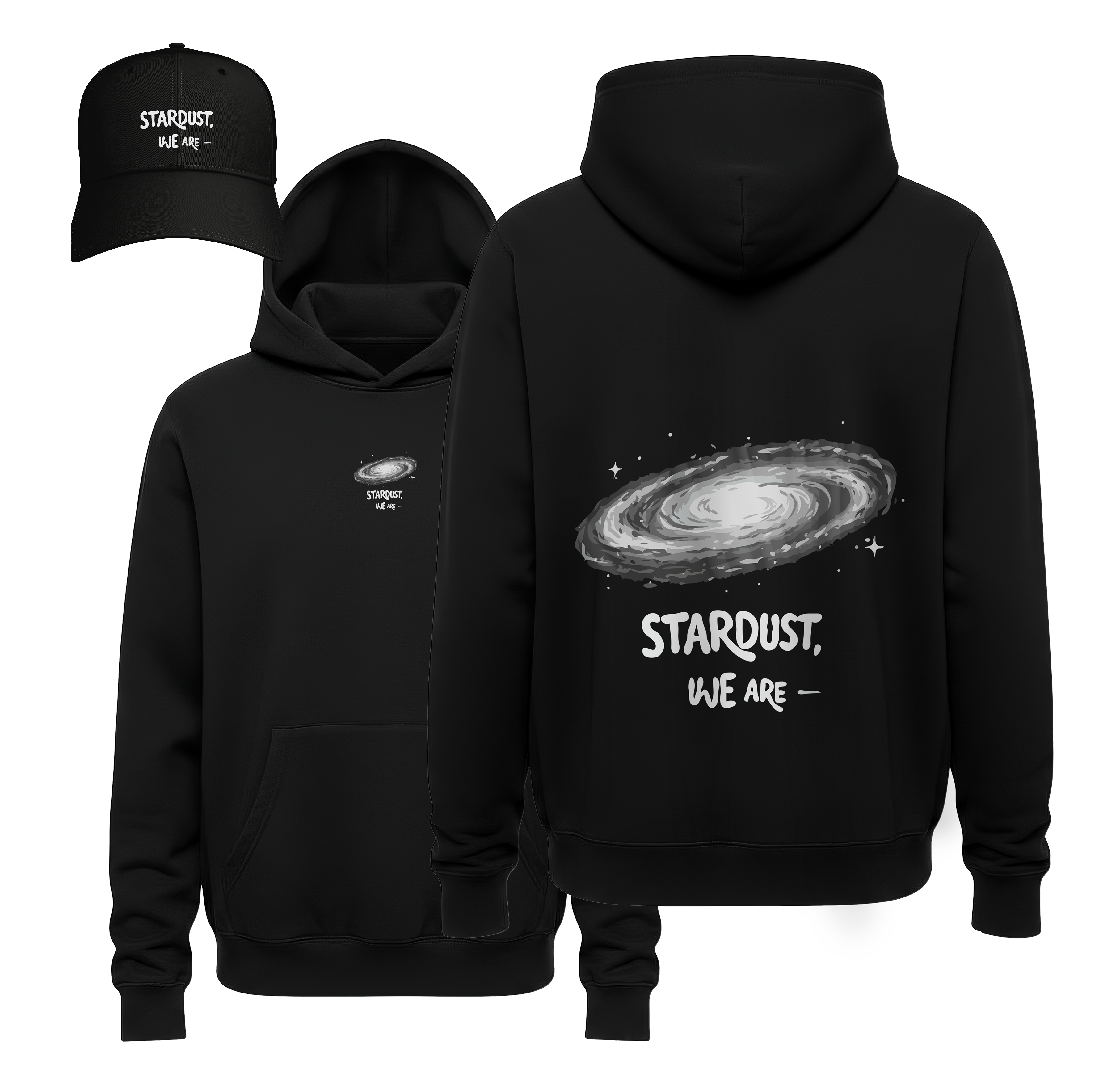 • Coordinated Celestial Gear: This bundle includes a luxury heavyweight black hoodie and a matching structured cap, both featuring the minimalist galaxy branding for a unified, intellectual aesthetic.