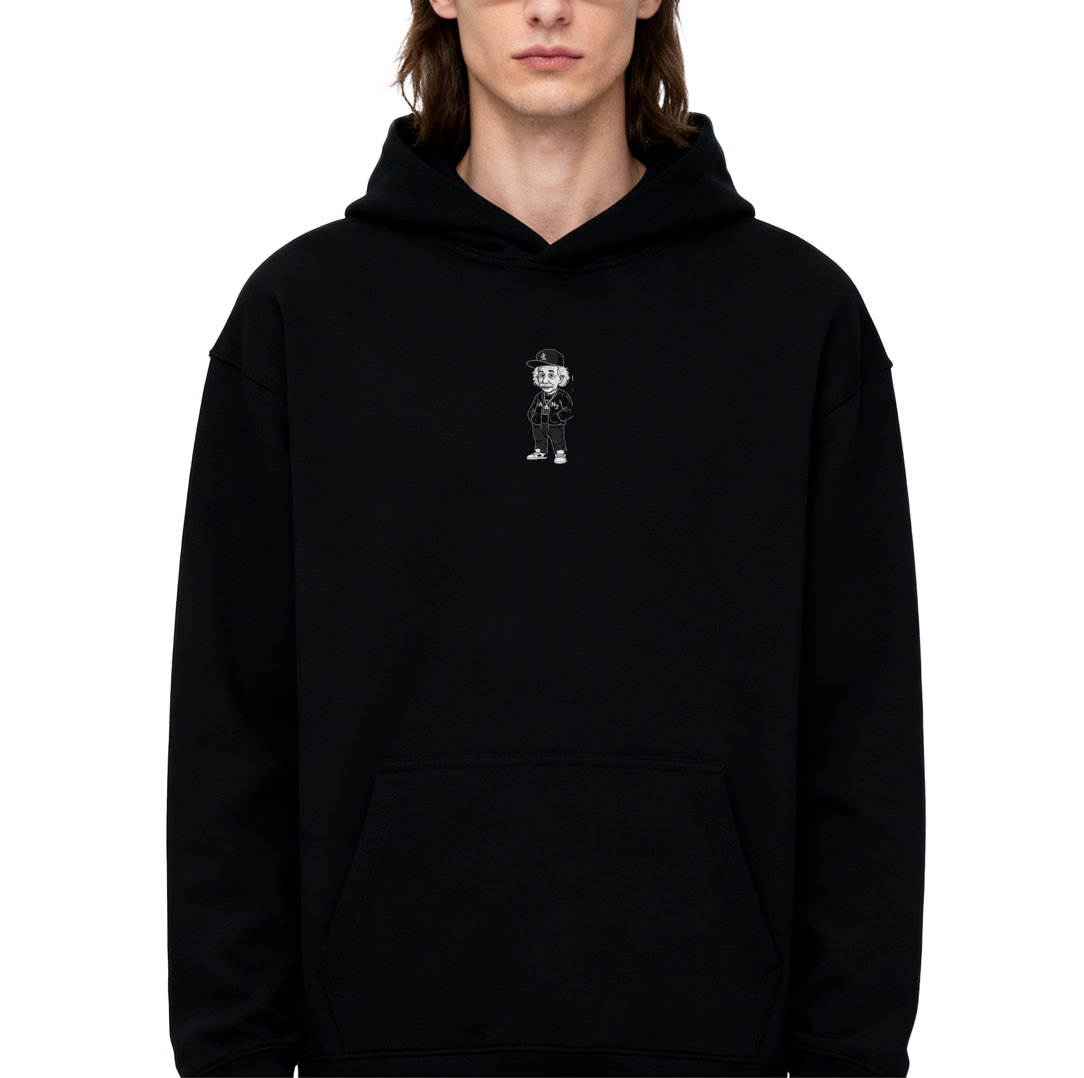 Minimalist Front Profile: The hoodie maintains a sleek, professional look from the front with a miniature version of the “Street Einstein” icon placed subtly on the chest.