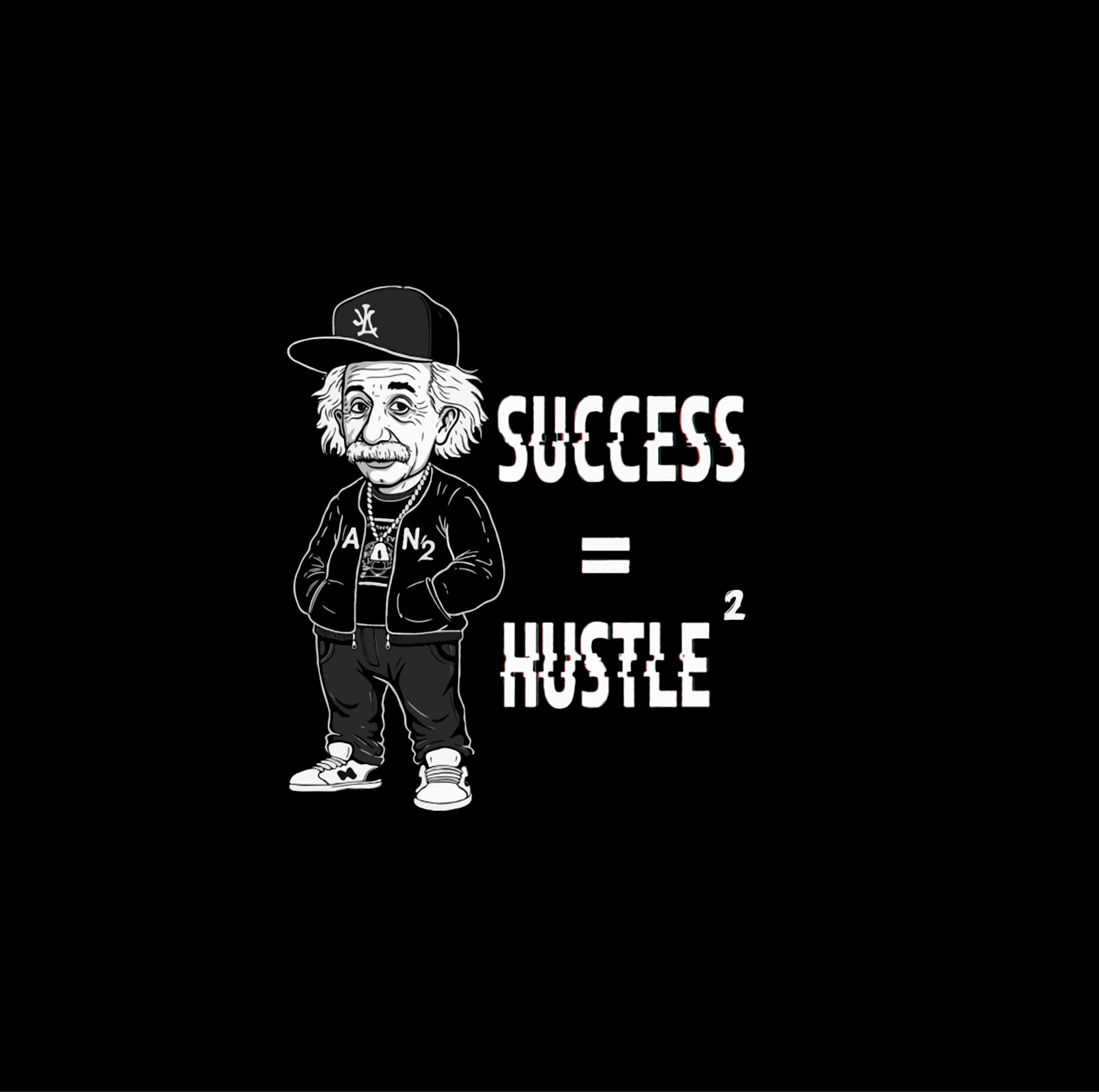 Mathematical Motivation: The design is anchored by the bold, glitch-textured white typography “SUCCESS = HUSTLE²”, a clever play on $E=mc^2$ that positions hard work as the ultimate multiplier.