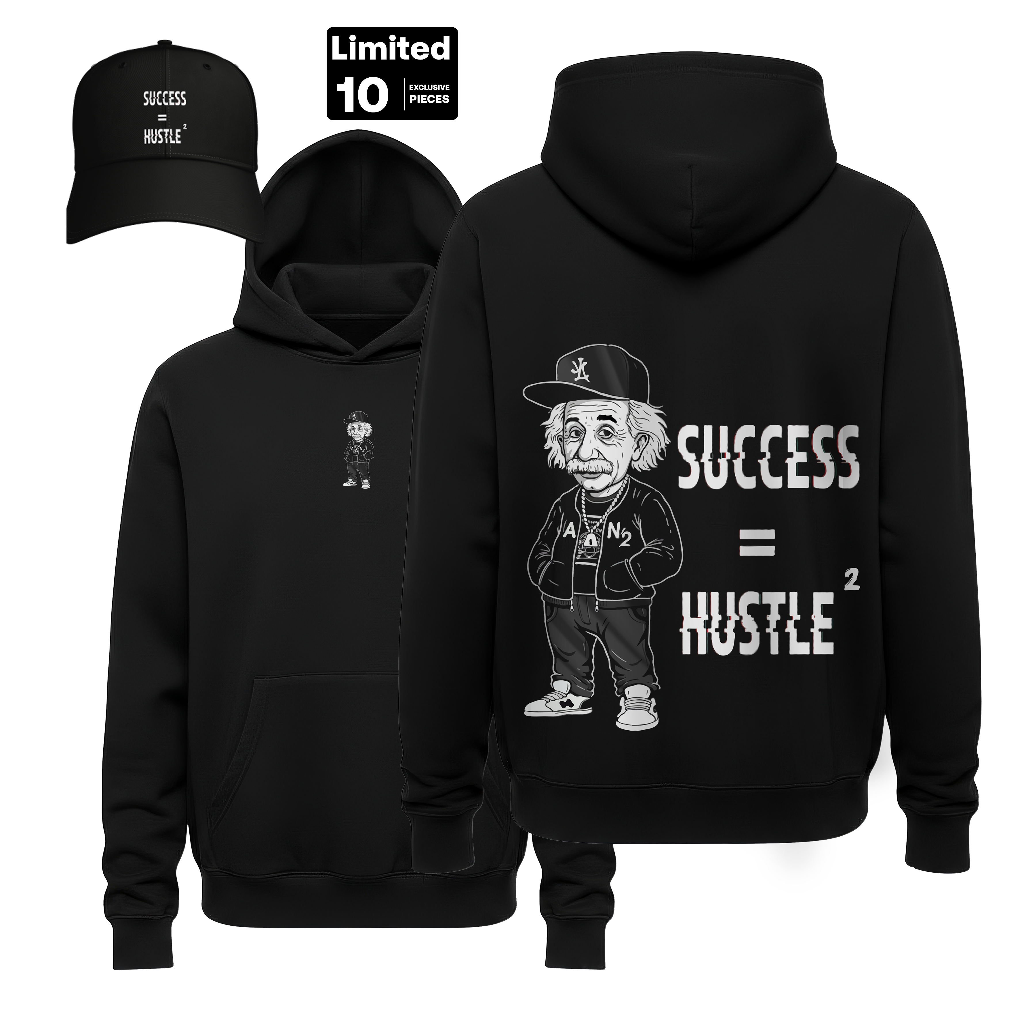 Coordinated Headwear: Each bundle includes a luxury heavyweight black hoodie and a matching structured cap, both featuring the “Success = Hustle²” equation.