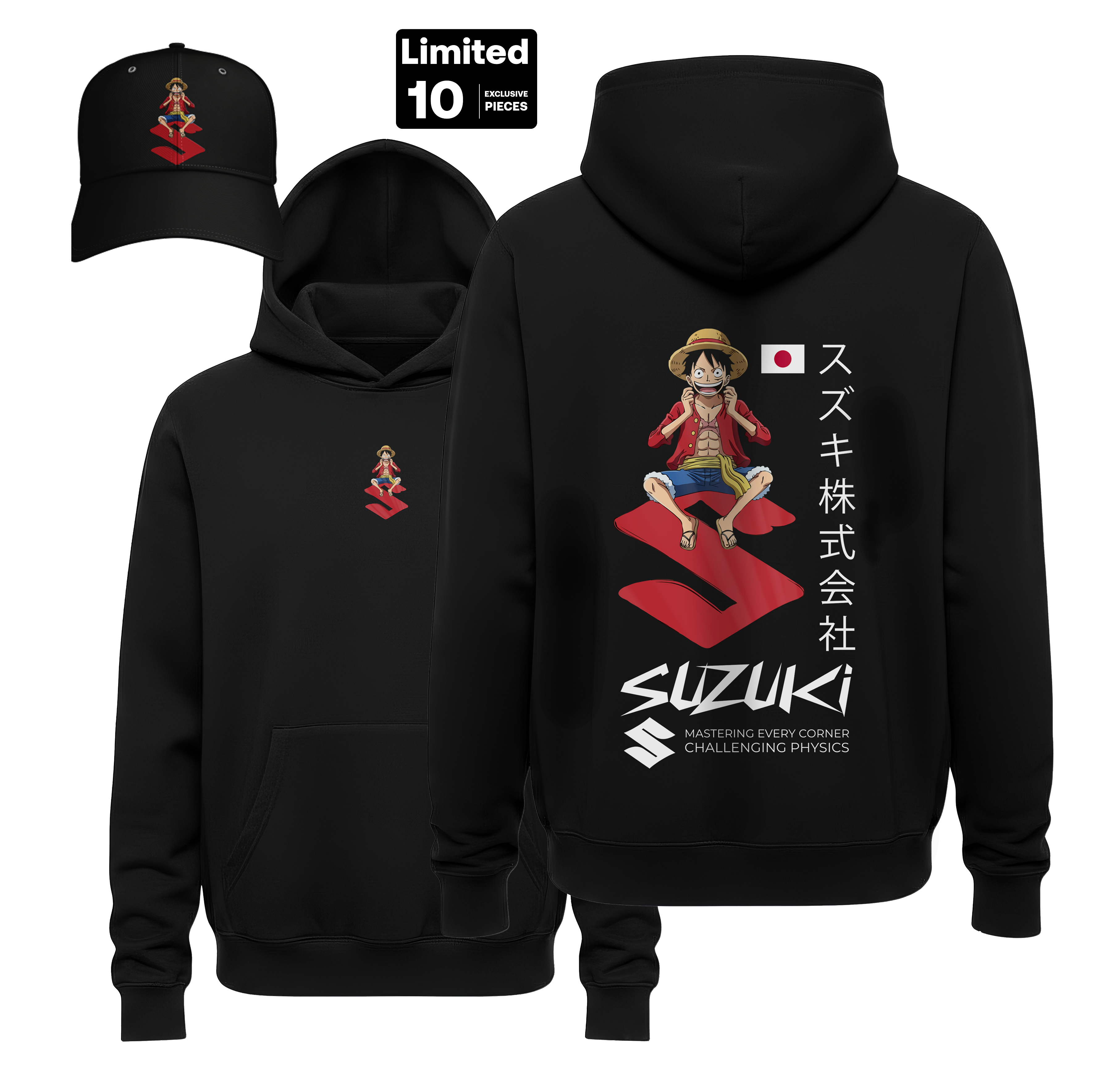 The spirit of adventure with this exclusive Suzuki x One Piece crossover bundle. This set merges the legendary reliability of Japanese automotive engineering with the indomitable will of Monkey D. Luffy, creating a must-have piece for fans of JDM culture and epic seafaring journeys alike.