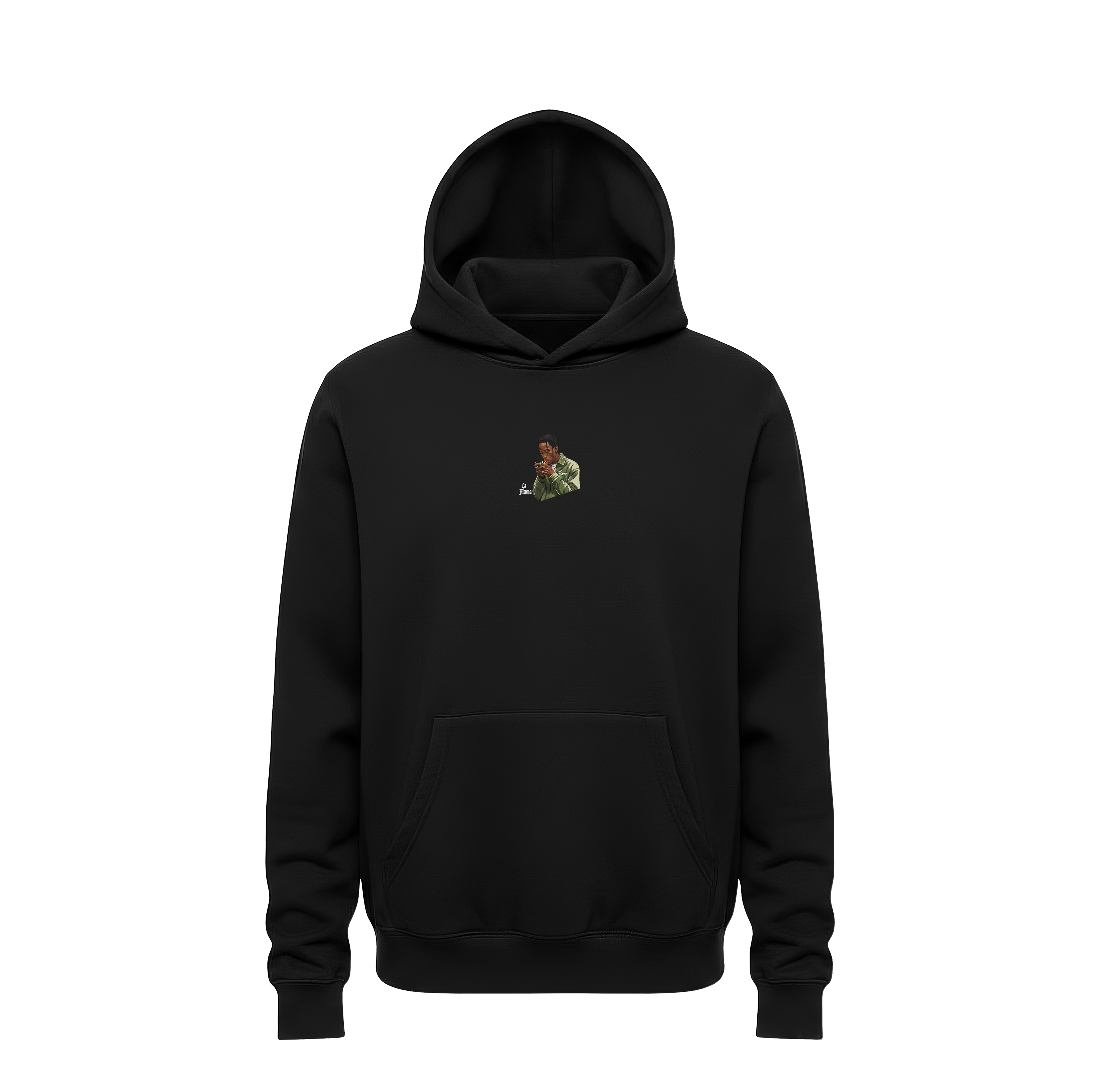 Minimalist Front Profile: The hoodie maintains a sleek, professional look from the front with a miniature version of the “La Flame” graphic and script placed subtly on the chest.