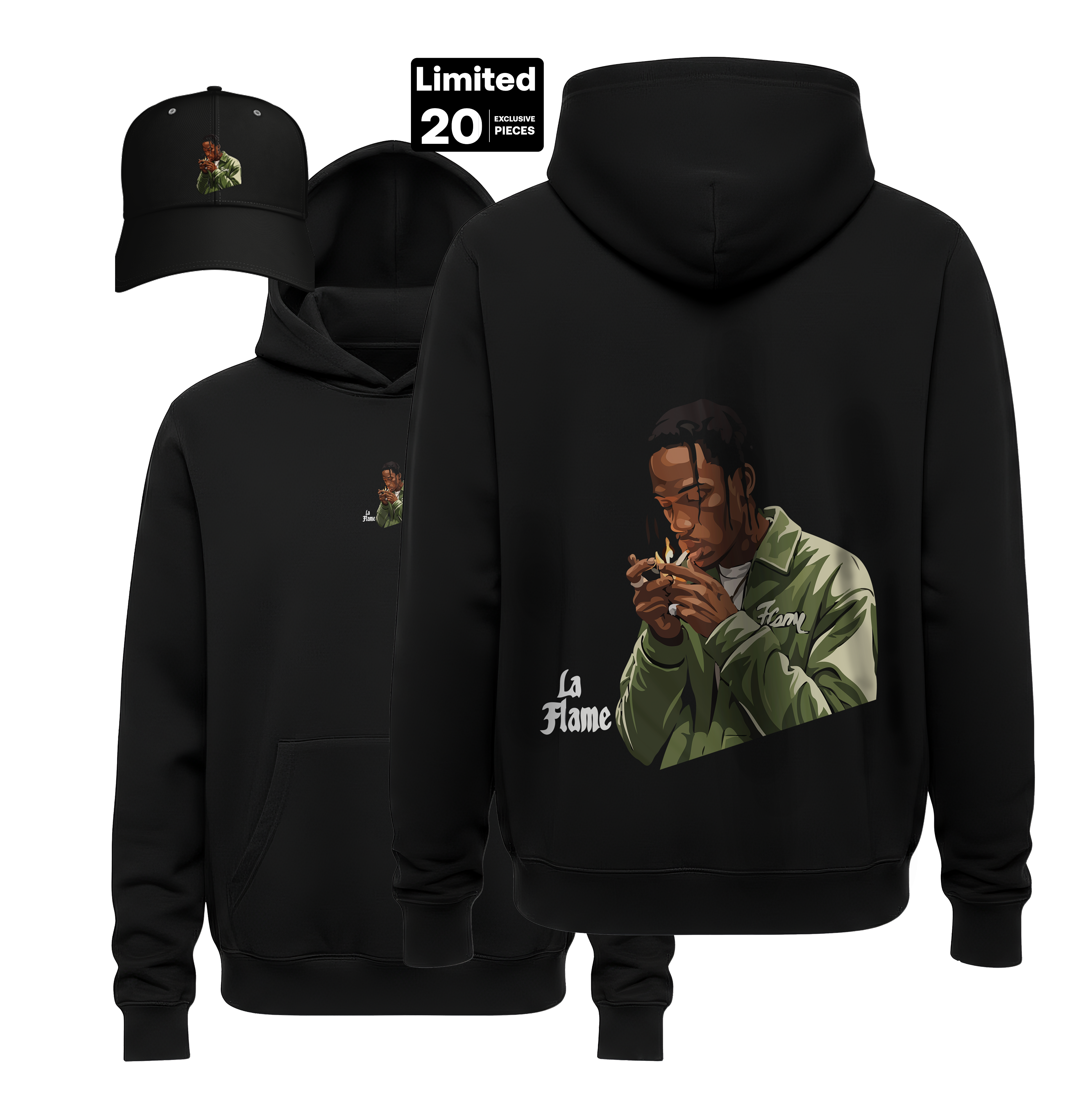 Coordinated Headwear: Each bundle includes a premium black heavyweight hoodie and a matching structured cap featuring the iconic “La Flame” portrait for a unified aesthetic.