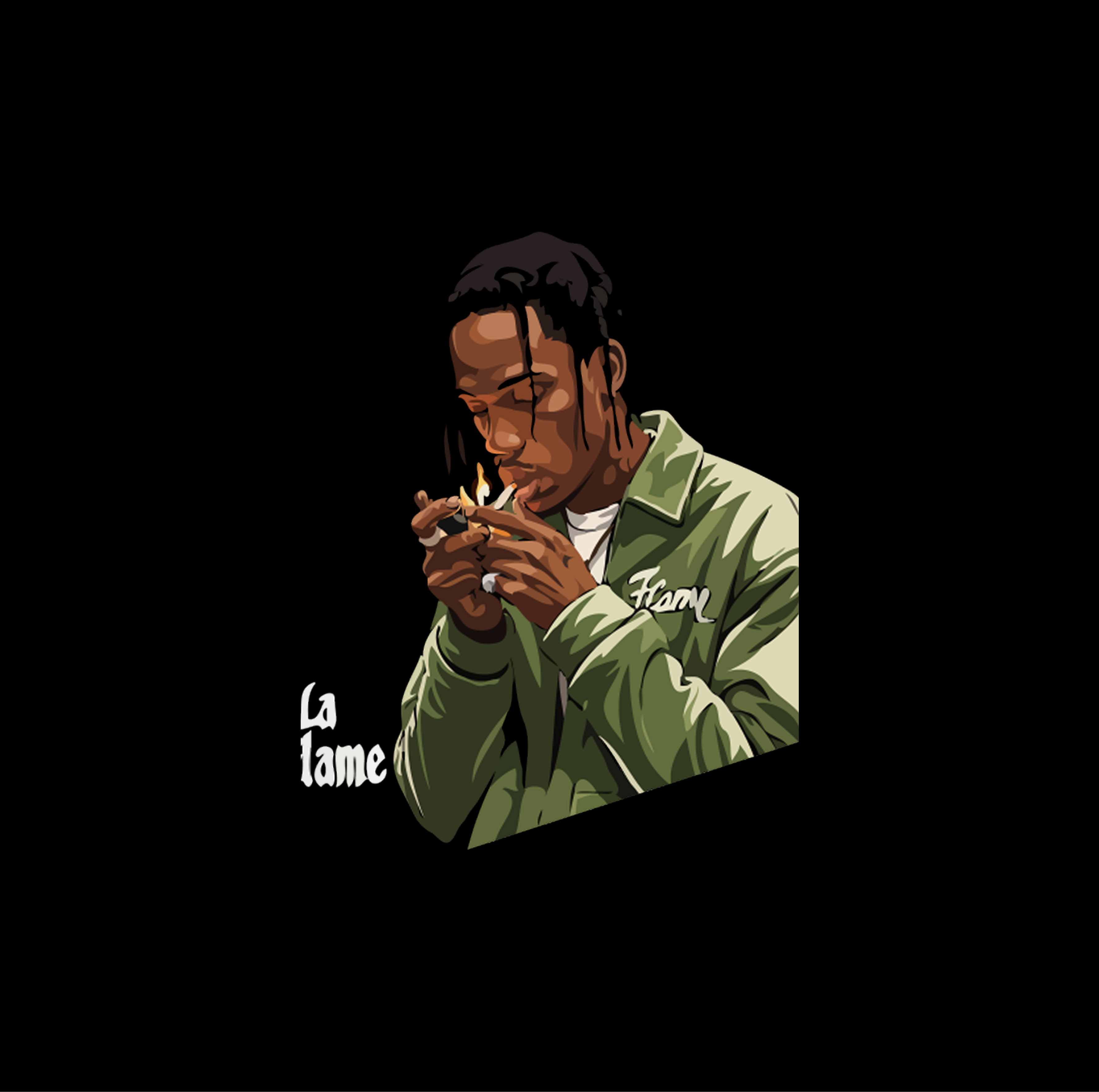 Cinematic Artist Graphic: The back features a high-definition illustration of Travis Scott in a signature olive tactical jacket, lighting a flame that symbolizes his stage persona.