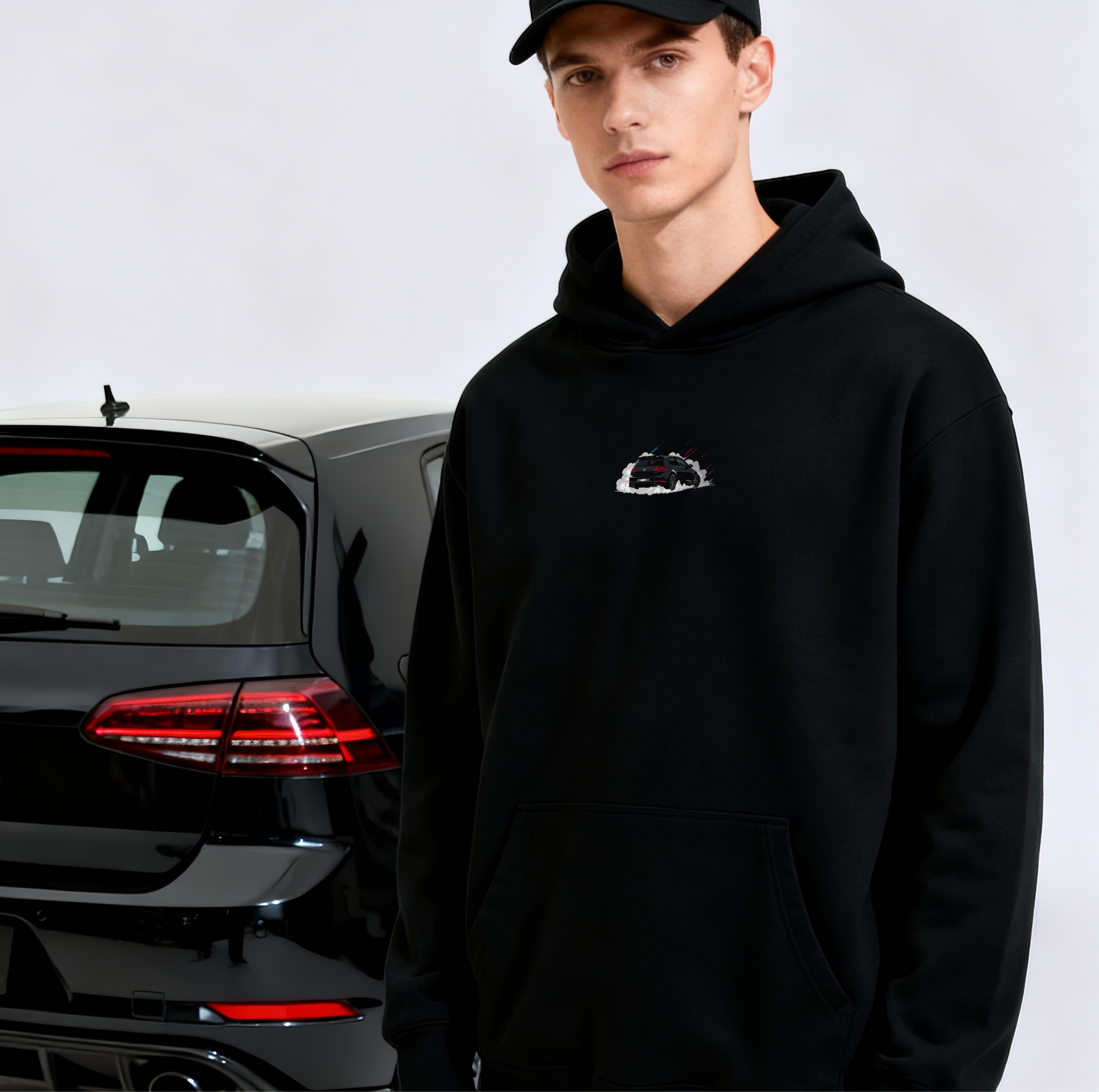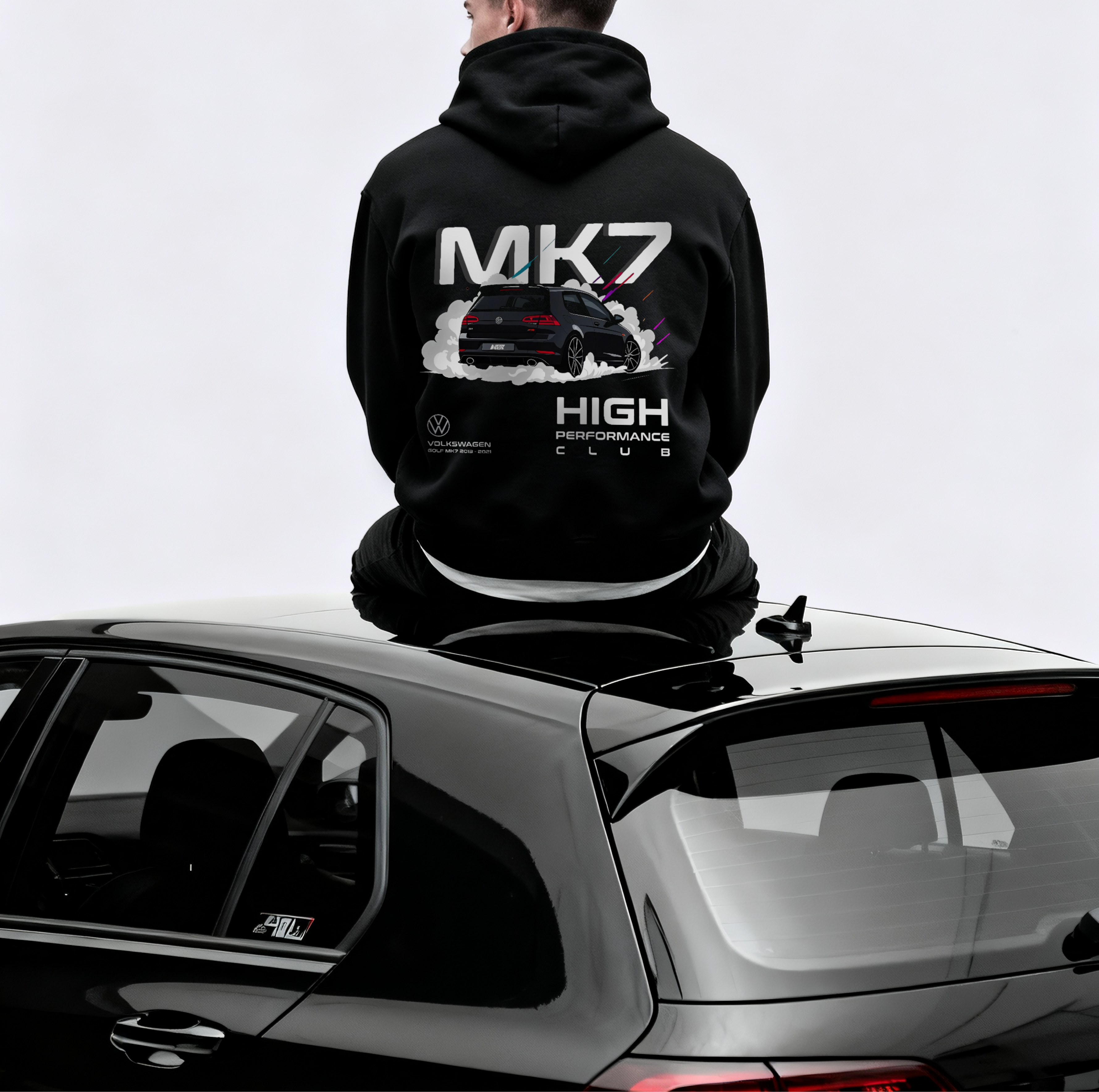 Dynamic DTF Visuals: Using state-of-the-art Direct to Film (DTF) technology, the design captures the aggressive rear stance of the MK7 in mid-drift, complete with high-definition smoke effects and vibrant “High Performance” neon accents.
